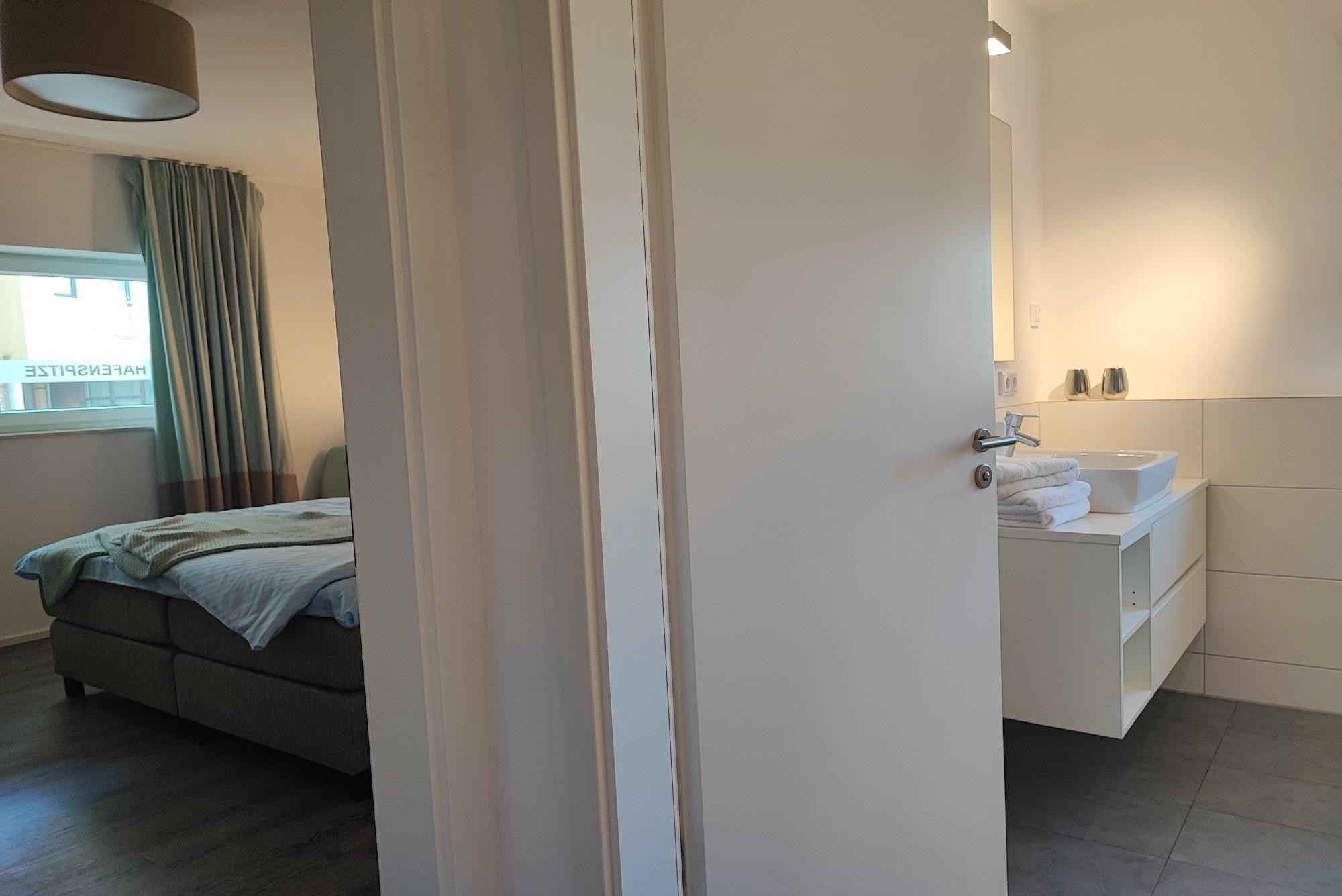 Der stilvoll eingerichtete, großzügige Wohn- und Essbereich, mit voll ausgestatteter Küche, la¨dt zum gemeinsamen Entspannen und Kochen ein! Die Ferienwohnung verfügt über einen Balkon mit wunderschönem Blick auf das Hafenbecken. Beide Schlafzimmer wurden mit modernen Doppelbetten (180x200 und 160x200), Kleiderschränken und TV-Geräten ausgestattet. Die Schlafzimmer bieten somit die gewünschte Erholung! Die Duschen in beiden Badezimmern sind ebenerdig. Die komplette Wohnung ist mit Vinylboden und Fußbodenheizung ausgestattet. Die im Hochparterre des Appartementhauses gelegene Ferienwohnung kann ''barrierefrei'' über einen Aufzug, mit direktem Zugang aus der Tiefgarage erreicht werden.