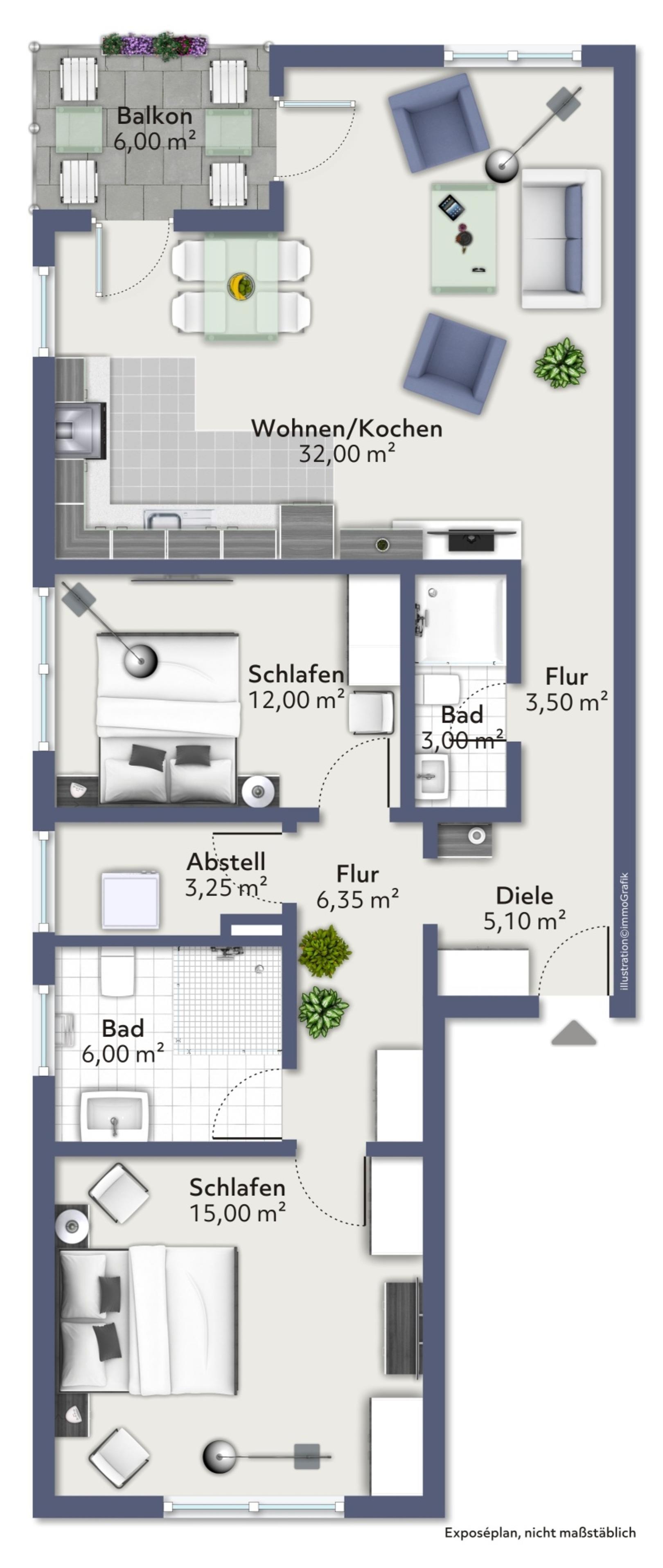 Die Symbole vom Wohngrundriss können in der Darstellung von der tatsächlichen Innen- und Außengestaltung der Wohnung abweichen!