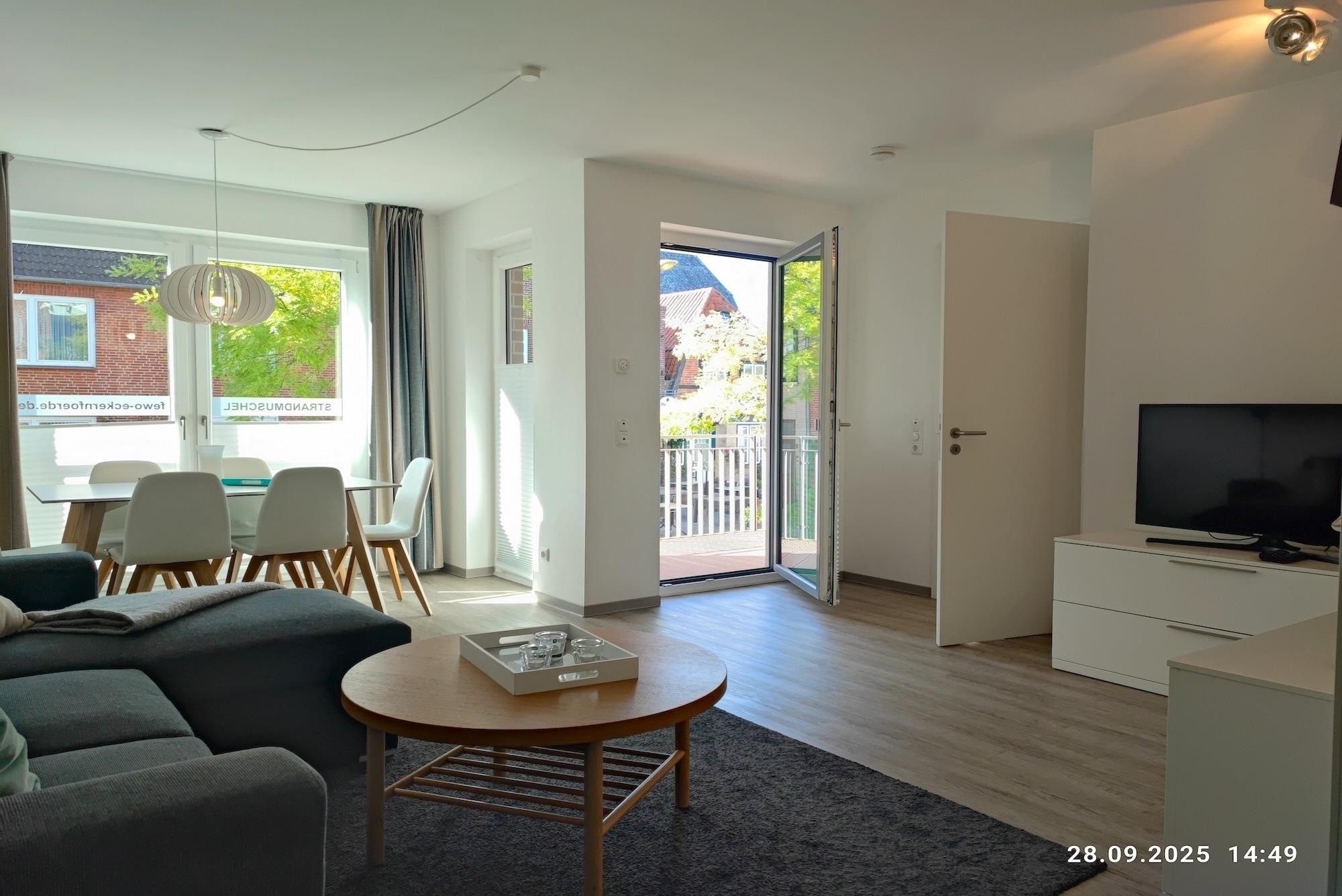 Die Ferienwohnung Strandmuschel bietet 77m² Komfort direkt am Hafen von Eckernförde, ideal für Familien und Paare.