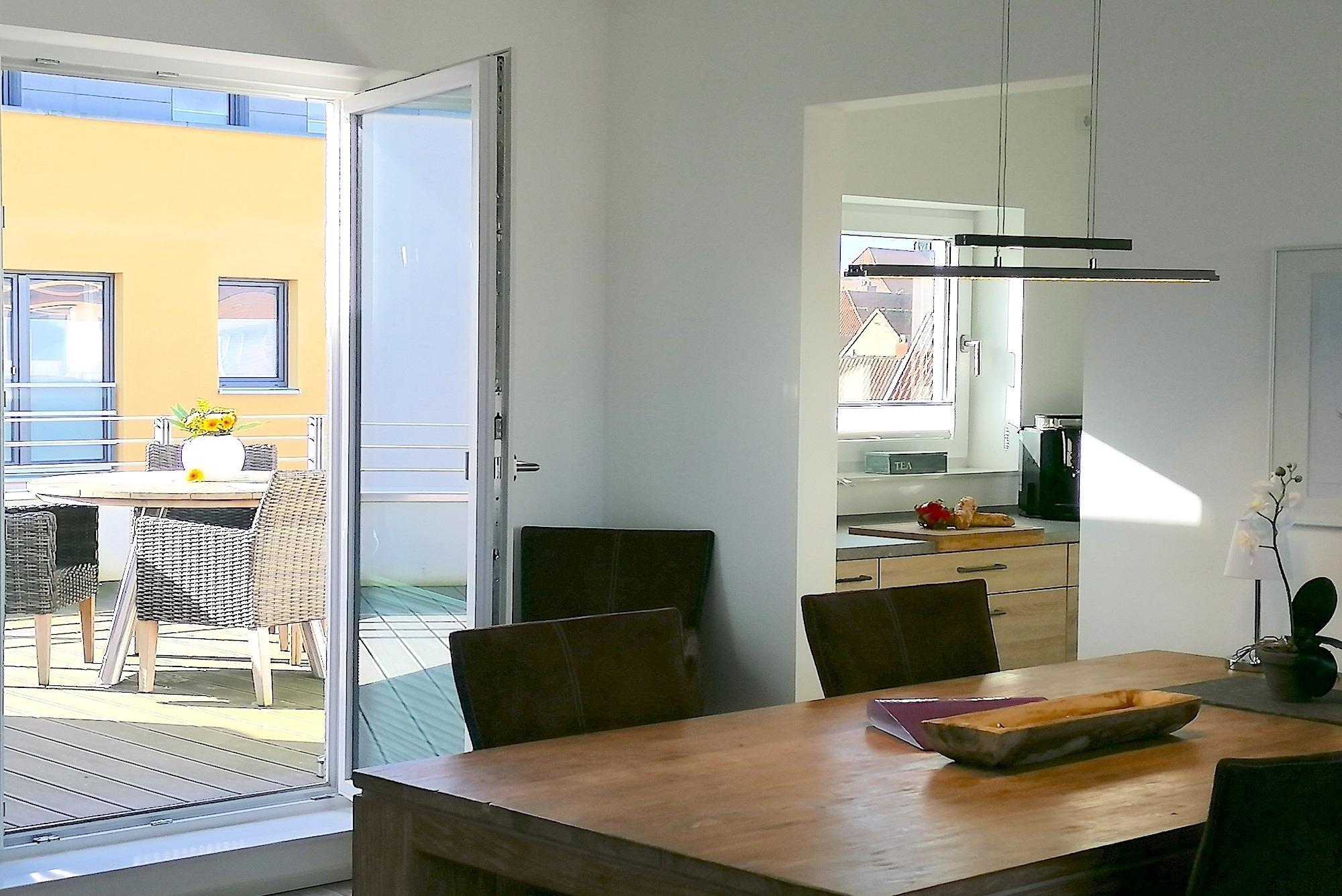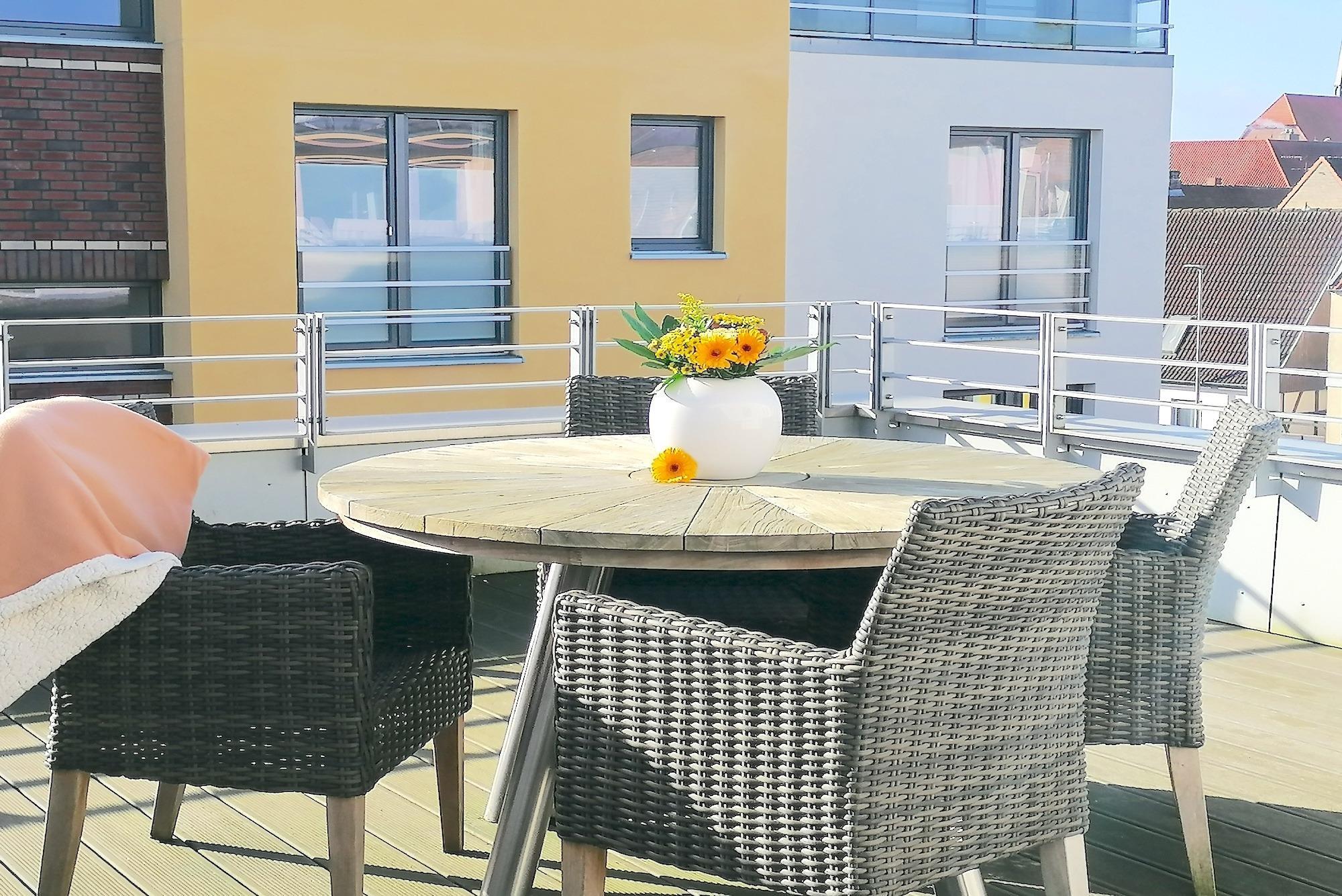 Die moderne 4-Sterne-Ferienwohnung Hafenglück in Eckernförde bietet 100 m², Hafenblick und eine große Dachterrasse nur 50 m von der Promenade entfernt.