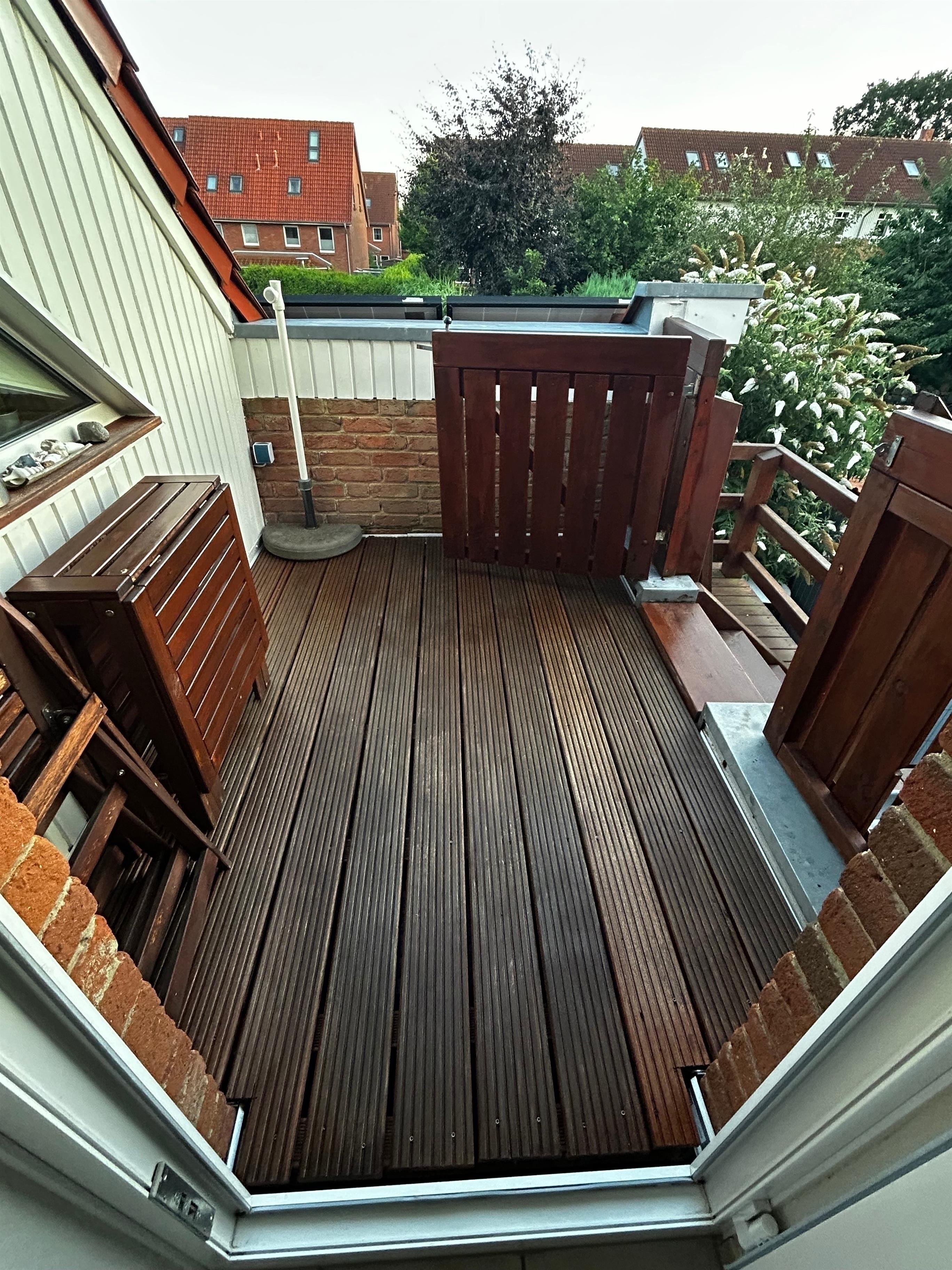 Die Wohnung befindet sich mit separatem Eingang im 1. OG unseres Einfamilienhauses. Auf das Grundstück kommen Sie direkt von der Spielstraße über die Holzbrücke und gehen dann durch den Garten zur außenliegenden Treppe. Über die schöne Loggia gelangen Sie dann in die Wohnung.
