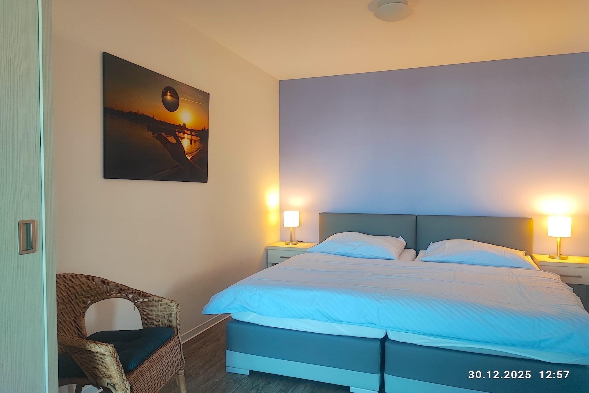 Genießen Sie durch die bodentiefen Fenster oder vom Balkon aus, den weiten Blick über die Hafenpromenade mit Wasserblick. Der gemütliche, modern eingerichtete Wohn- und Essbereich, mit voll ausgestatteter Küche, la¨dt zum gemeinsamen Entspannen und Kochen ein! Die Ferienwohnung verfügt über einen Balkon mit wunderschönem Blick auf das Hafenbecken. Das Schlafzimmer wurde mit zwei Einzelbetten (90x200), einem Kleiderschrank und einem TV-Gerät ausgestattet und bietet somit die gewünschte Erholung! Das Schlafsofa im Wohnzimmer bietet zudem U¨bernachtungsmo¨glichkeiten fu¨r 2 weitere Personen. Die Dusche im Badezimmer ist ebenerdig. Die komplette Wohnung ist mit Vinylboden und Fußbodenheizung ausgestattet. Die im 2. Deck des Appartementhauses gelegene Ferienwohnung kann über das Treppenhaus oder einem Aufzug erreicht werden. Die Symbole vom Wohngrundriss können in der Darstellung von der tatsächlichen Innen- und Außengestaltung der Wohnung abweichen!