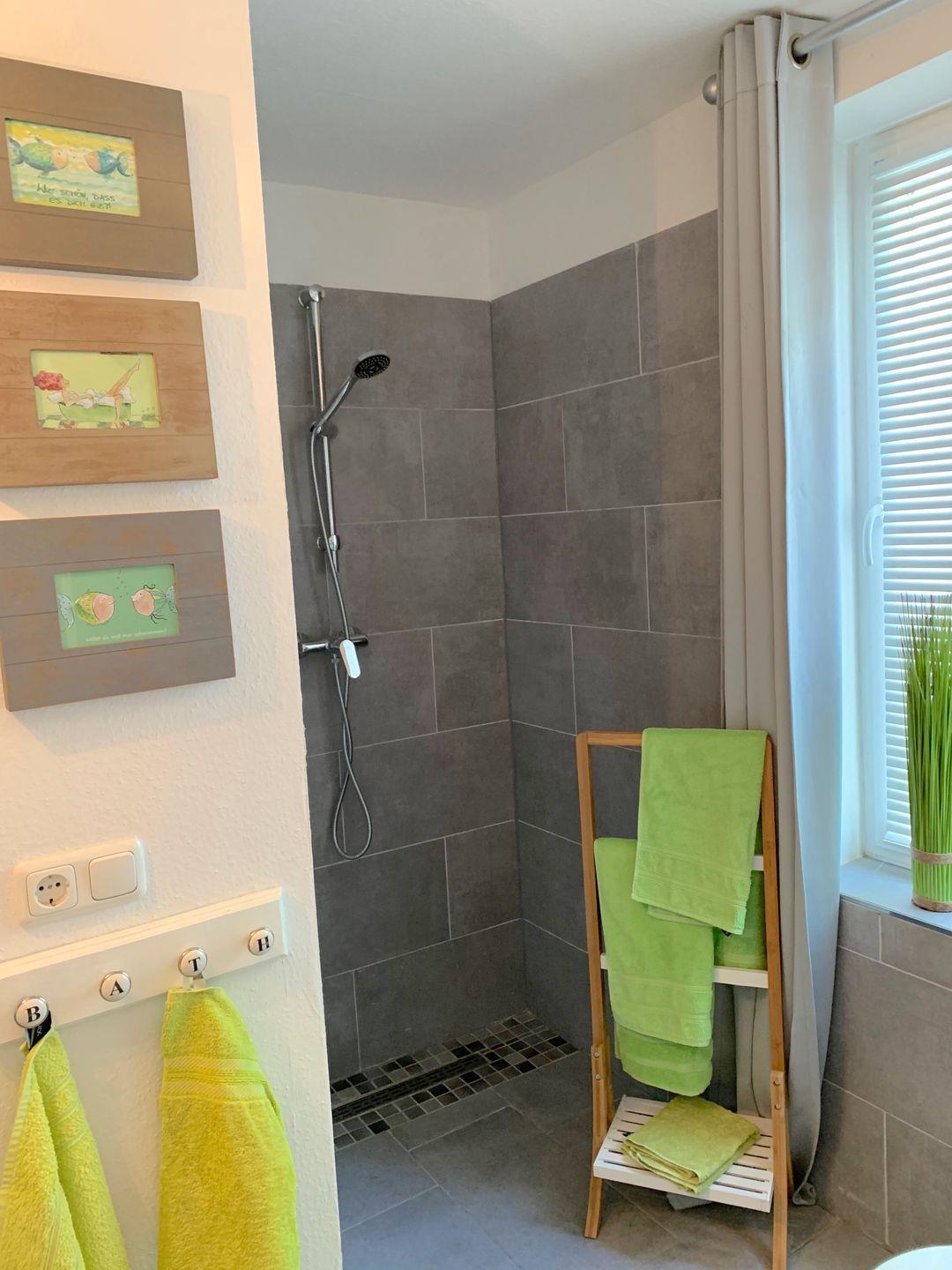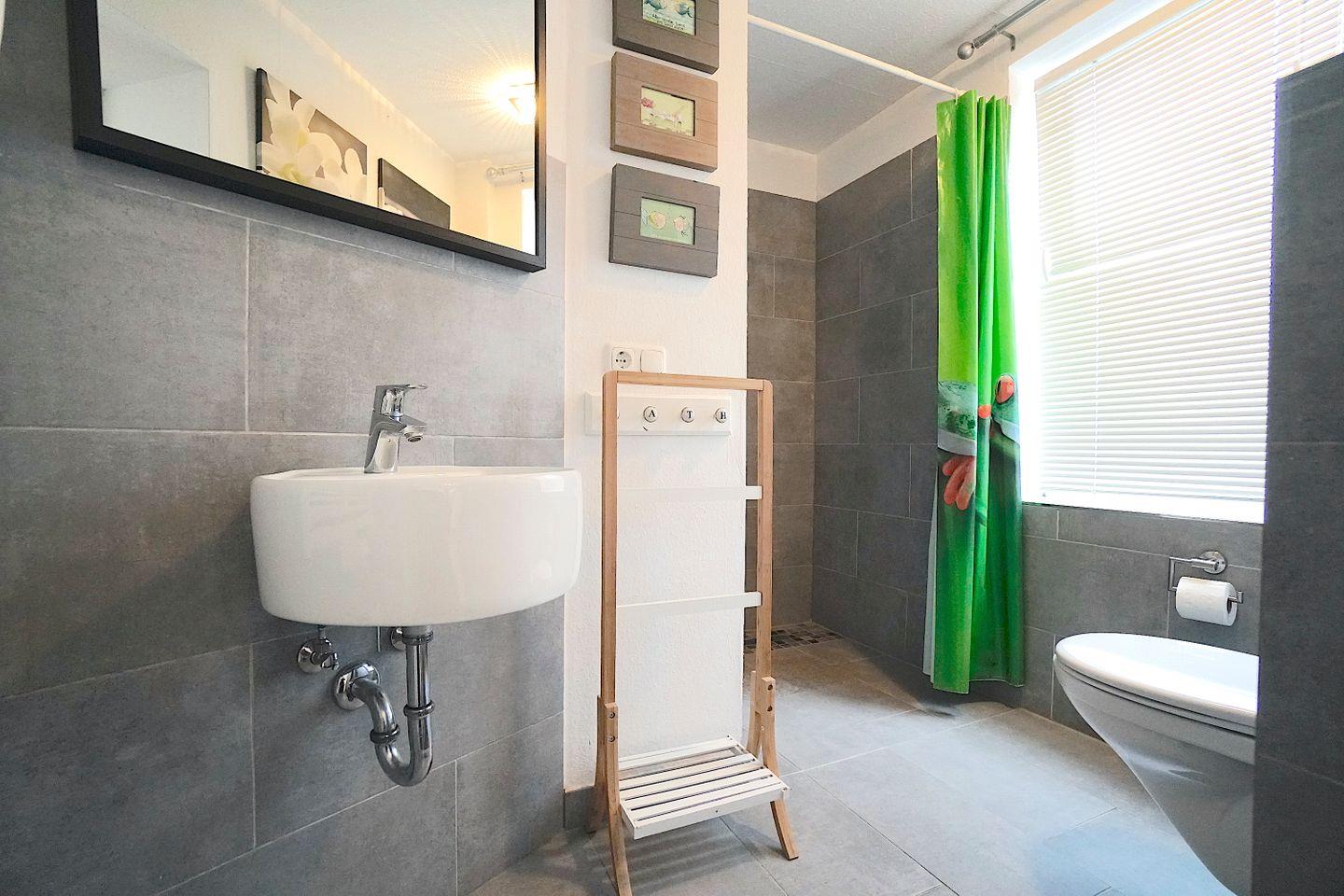 Das Badezimmer ist mit einer bodengleichen Dusche, WC und Waschbecken, Spiegel sowie einem Fenster für Tageslicht ausgestattet. Ein Haartrockner und warmes Wasser sind ebenfalls vorhanden, was den modernen Komfort unterstreicht.