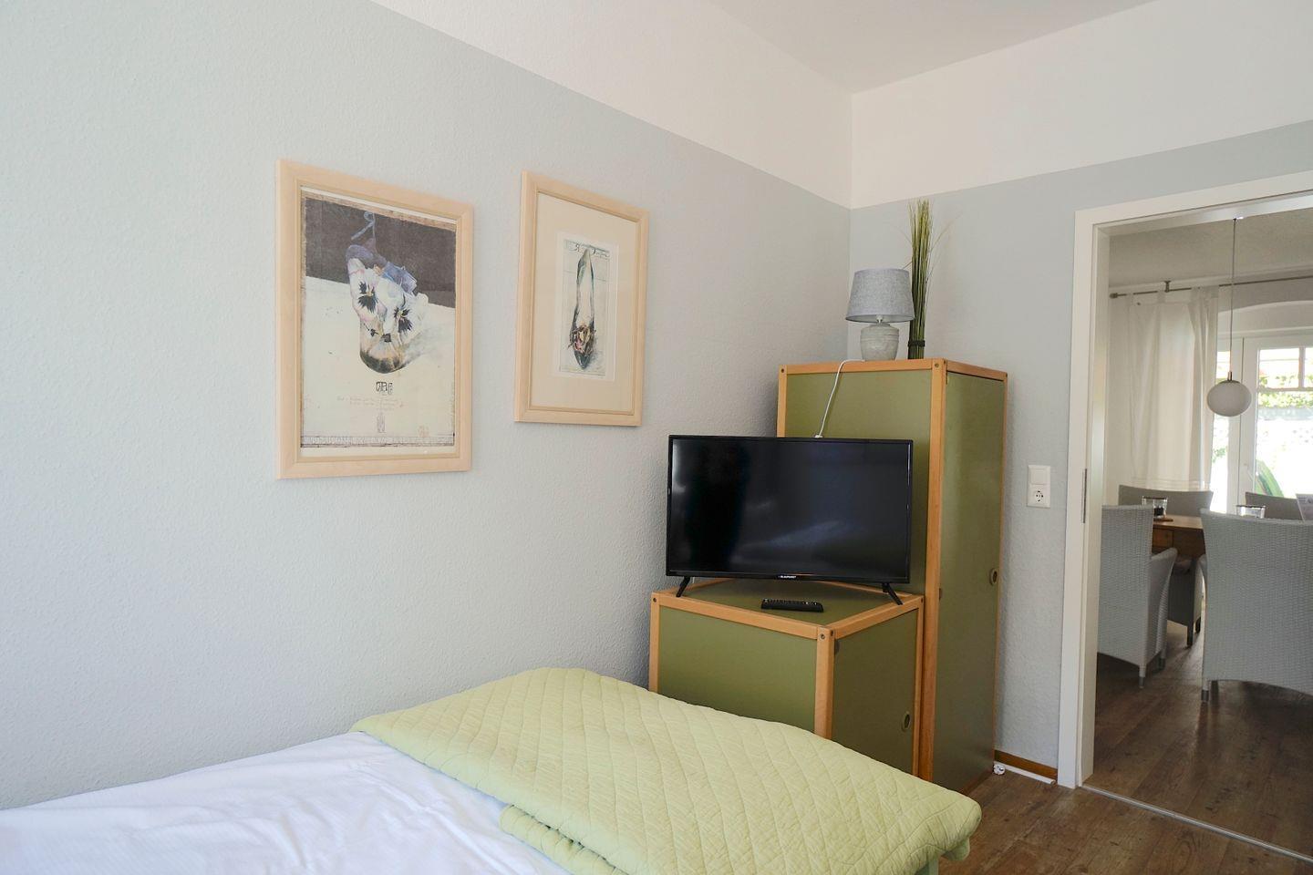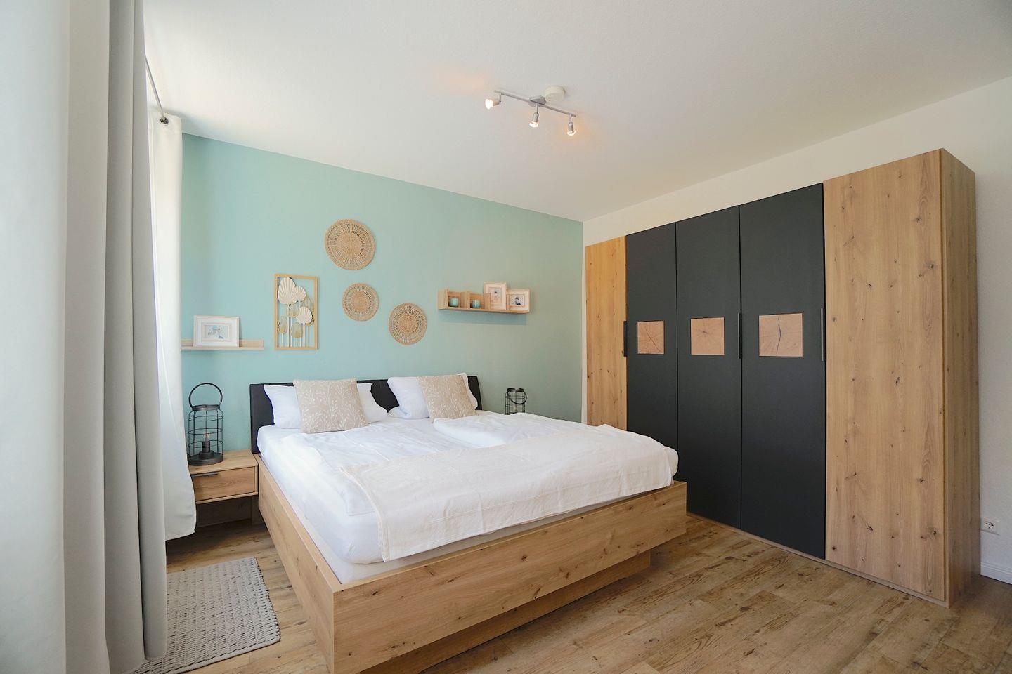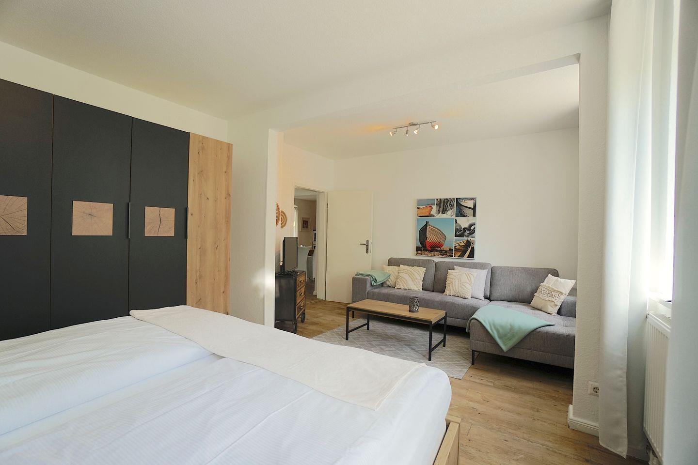 Zum Schlafen steht ein kleines Zimmer mit zwei Einzelbetten und ein größeres Schlafzimmer mit einem Boxspringbett zur Verfügung. In dem großen Schlafzimmer ist eine gemütliche Sofa und Fernsehecke integriert.