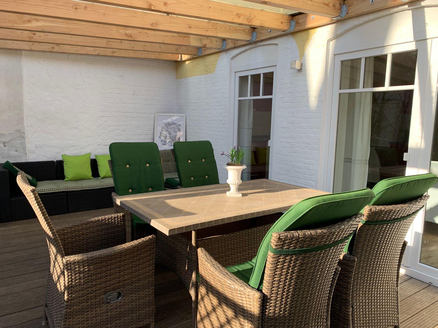 Die Wohnung liegt im Erdgeschoss und verfügt über einen eigenen Zugang rückseitig des Gebäudes. Direkt vor dem Haus befindet sich ein Stellplatz, über die Terrasse gelangt man in die für 4 Personen ausgestattete Wohnung.