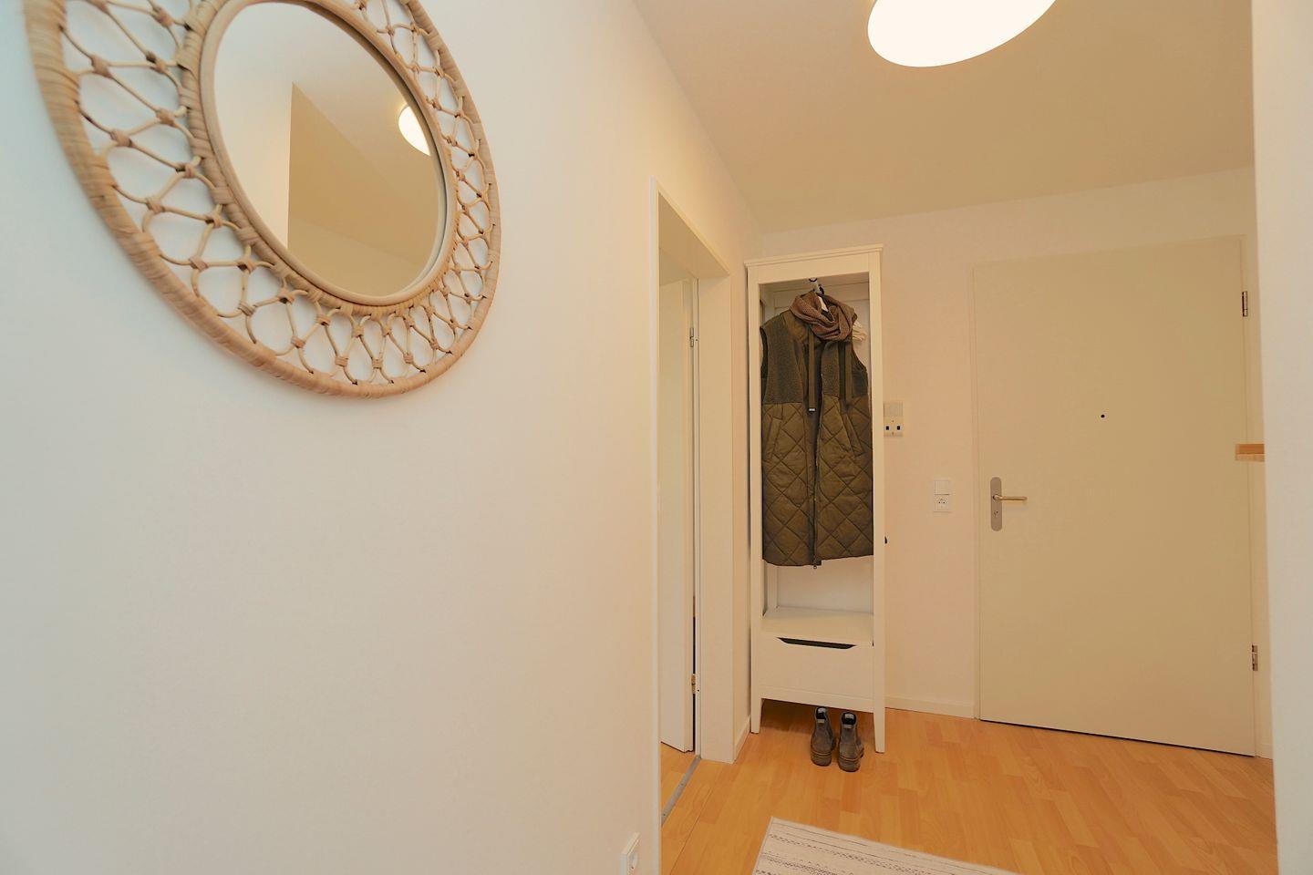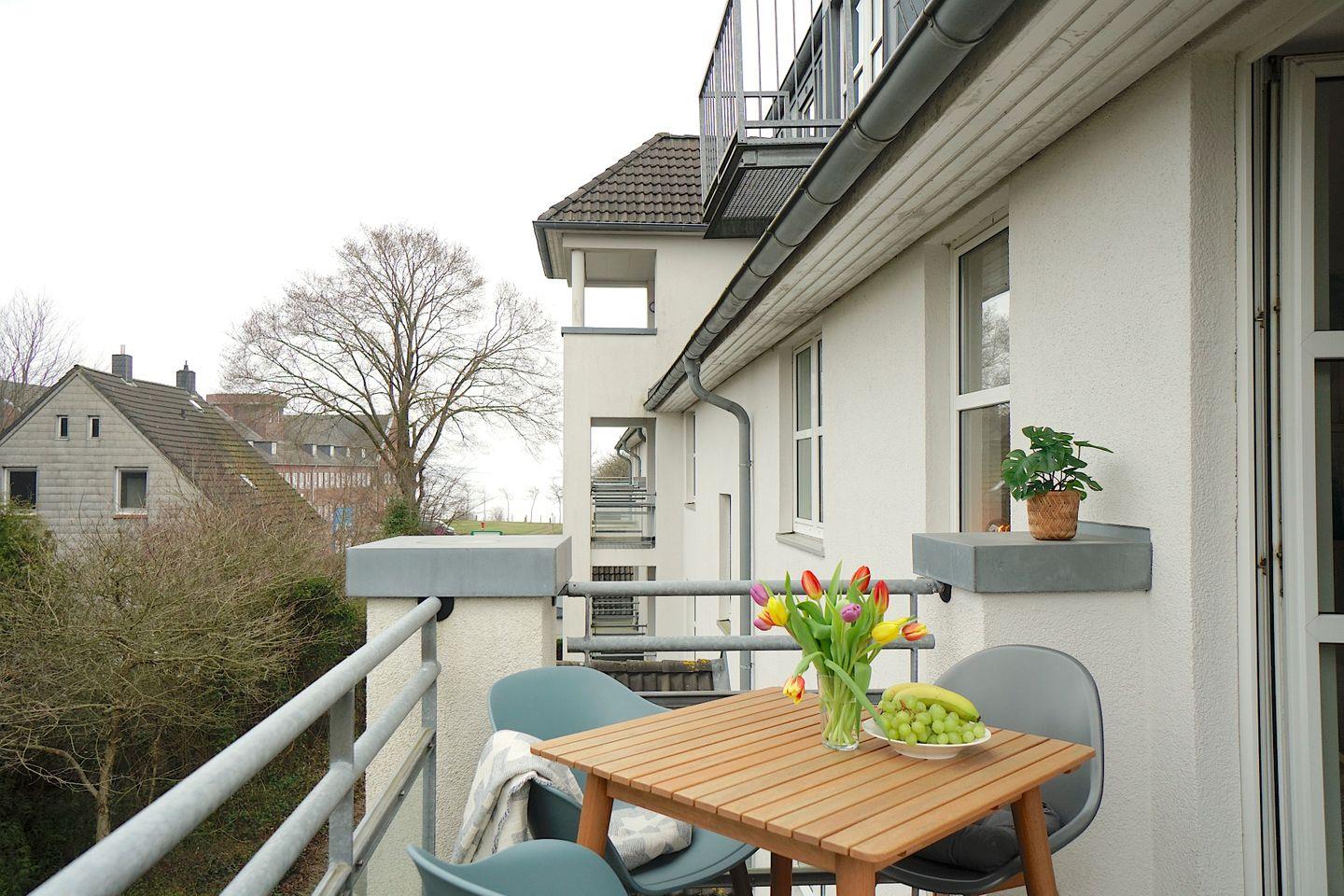 Die Wohnung befindet sich in einer gepflegten Wohnanlage mit Tiefgaragenstellplatz. Direkt hinter dem Haus verlaufen Bahnschienen – die Züge fahren jedoch langsam und leise zum nahegelegenen Bahnhof Eckernförde. Zwischen Strand und Wohnanlage liegt die B76 mit Tempo 30, die den Strandzugang unkompliziert macht.