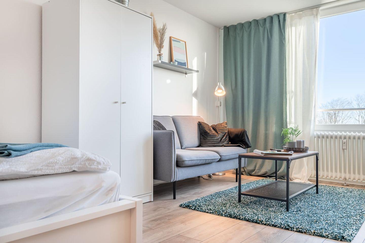 Sie beziehen eine neue Wohnung, die durch ihr modernes Design und ihre hochwertige Ausstattung besticht.