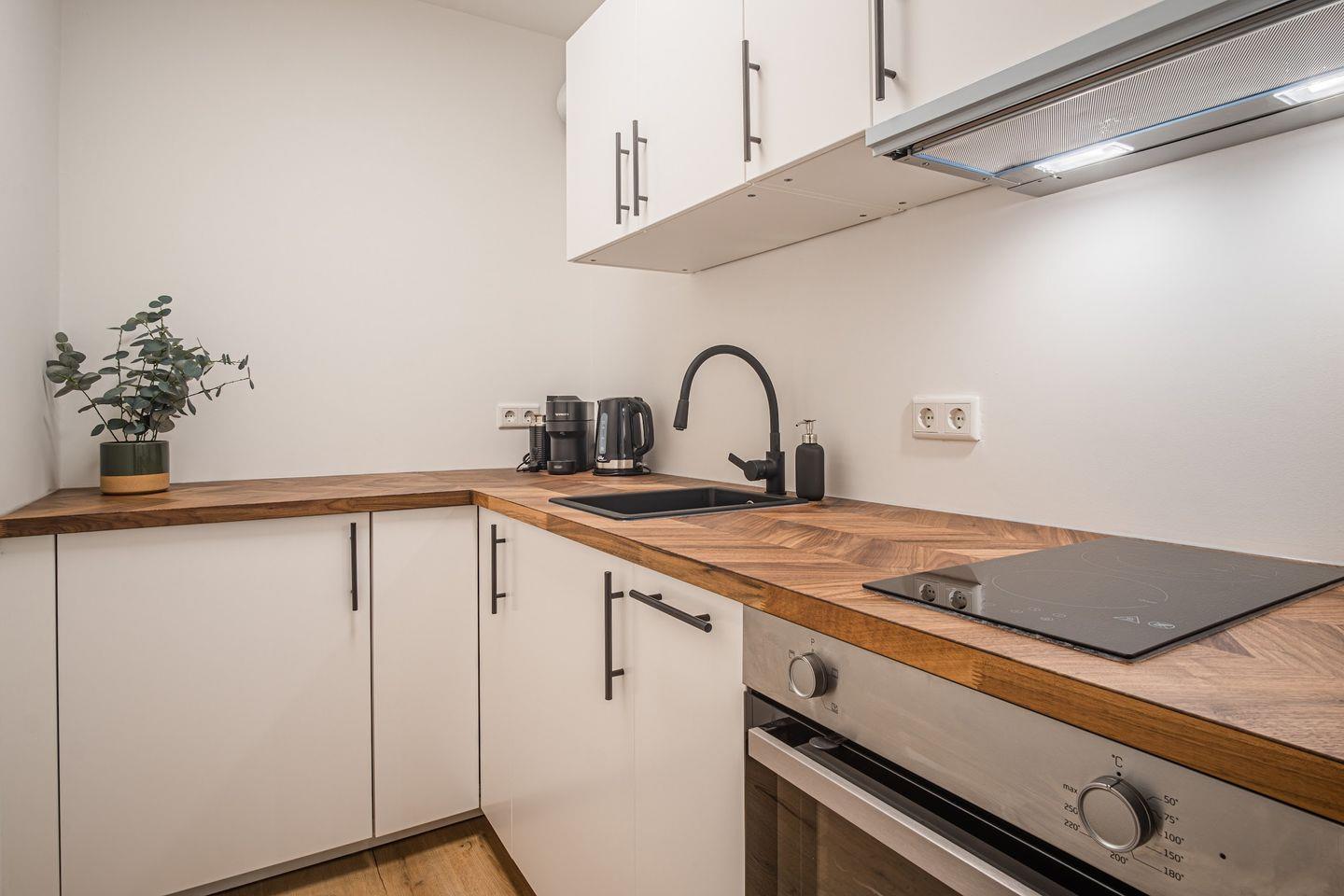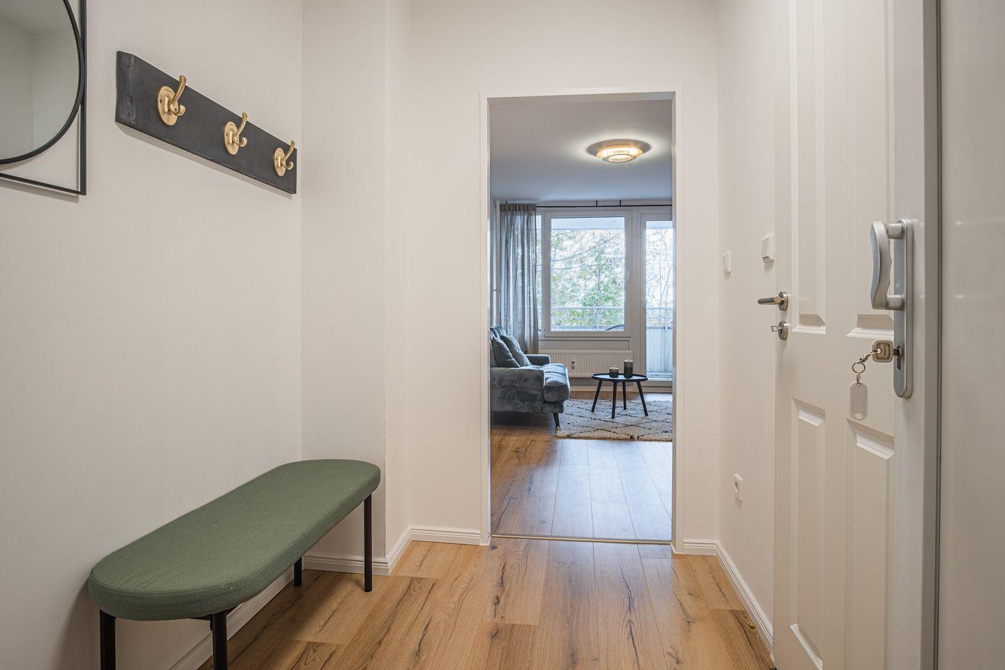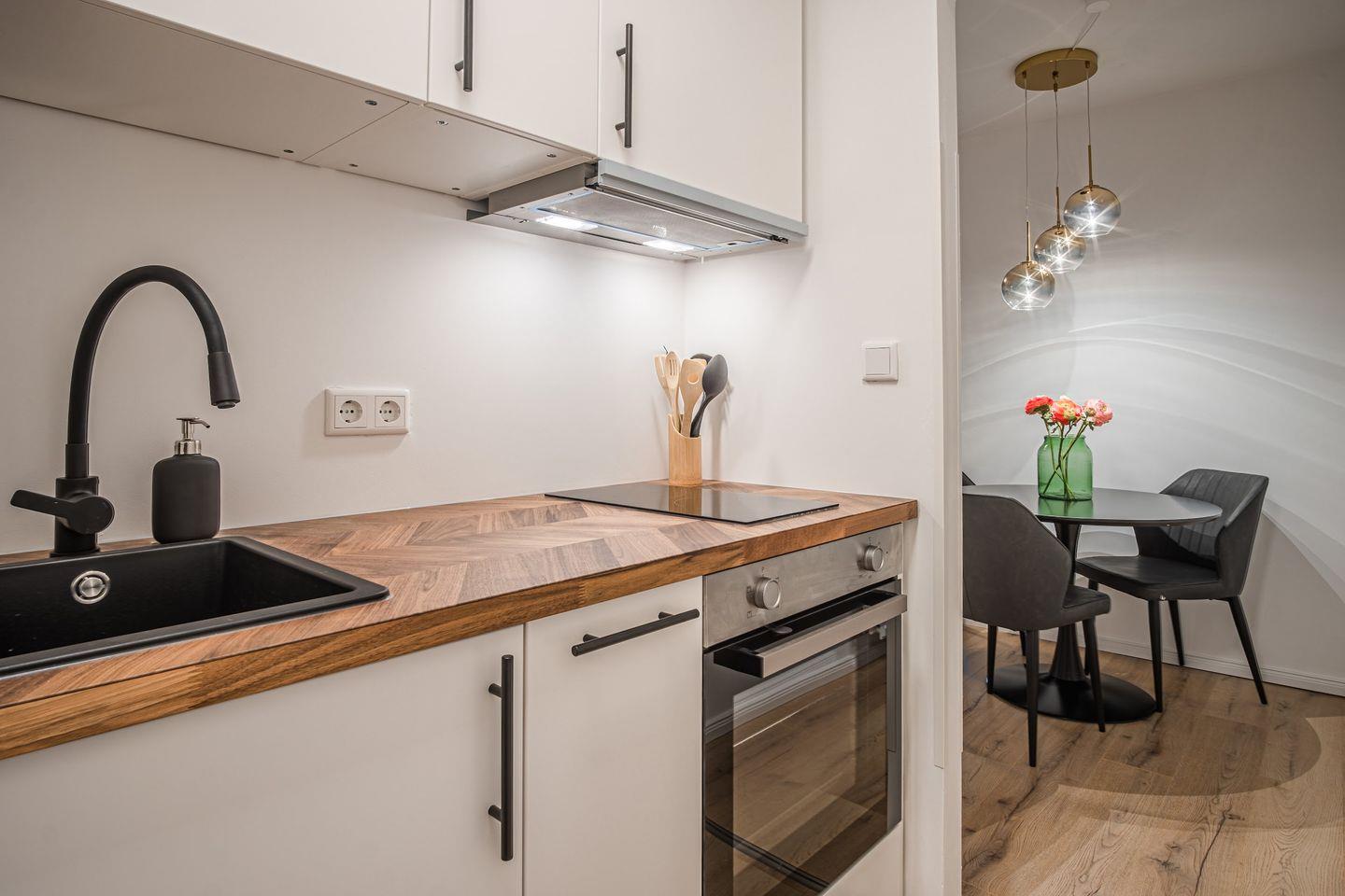 Verbringe einen tollen Aufenthalt in der hellen Wohnung mit Wohnzimmer, Schlafzimmer, Küche und einem Duschbad.