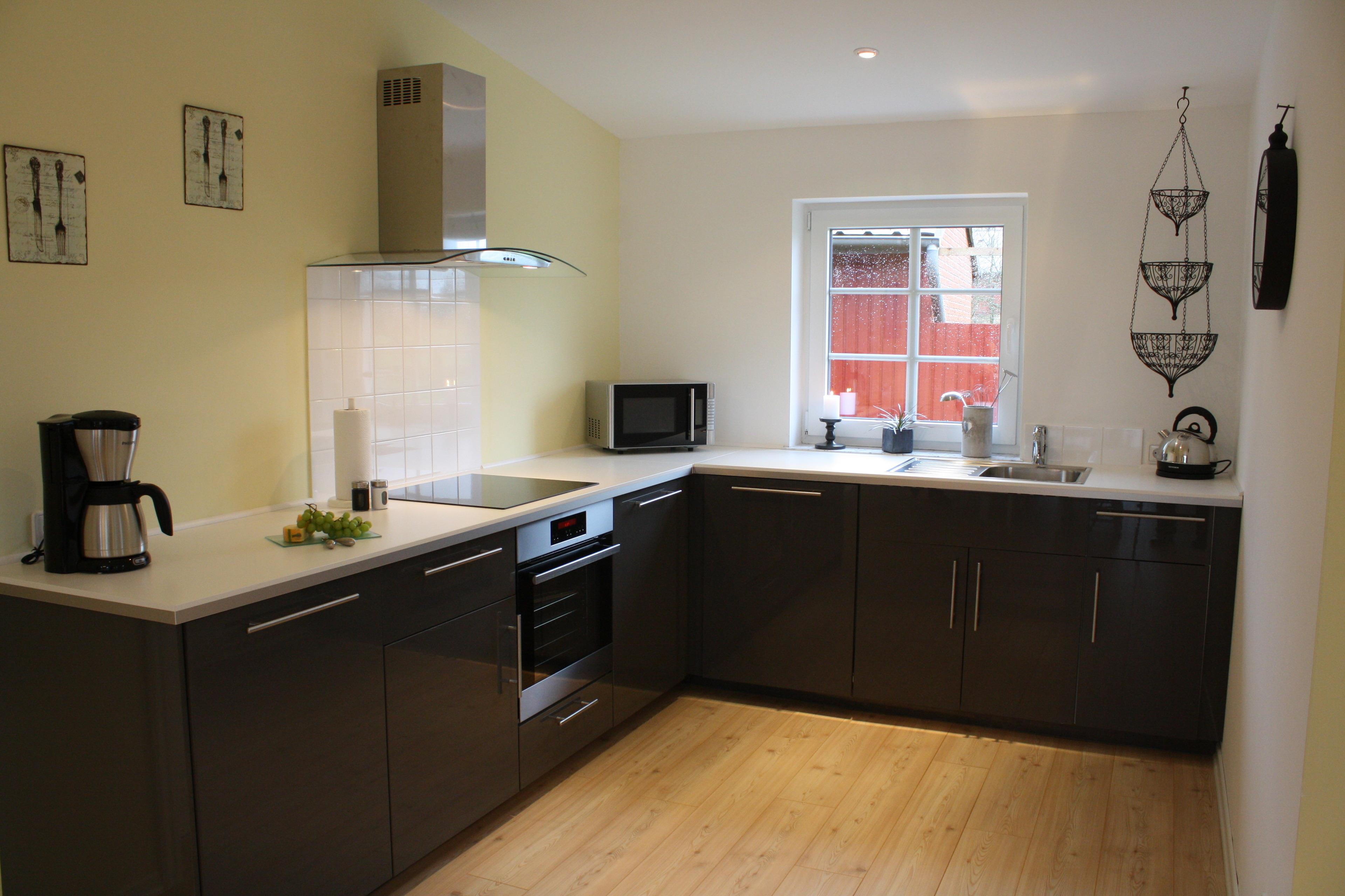 Unser hochwertig eingerichtetes, 112 qm großes Ferienhaus bietet Platz für bis zu 6 Personen. Es verfügt über einen sehr großzügigen Wohn-Essbereich, von dem aus man einen freien Blick in die Angelner Knicklandschaft genießen kann. Die moderne Küche ist harmonisch in den Wohnbereich eingebunden und hat einen Kühlschrank, einen Herd mit Ceranfeld und einen Backofen. Geschirrspüler, Wasserkocher, Kaffeemaschine, Toaster und Mikrowelle sowie Töpfe und Pfannen gehören zur Ausstattung dazu. Für den gemütlich gedeckten Tisch sind ausreichend Besteck, Gläser und Geschirr vorhanden. Ein Fondue und ein Raclette für gemütliche Stunden runden das Ganze ab.