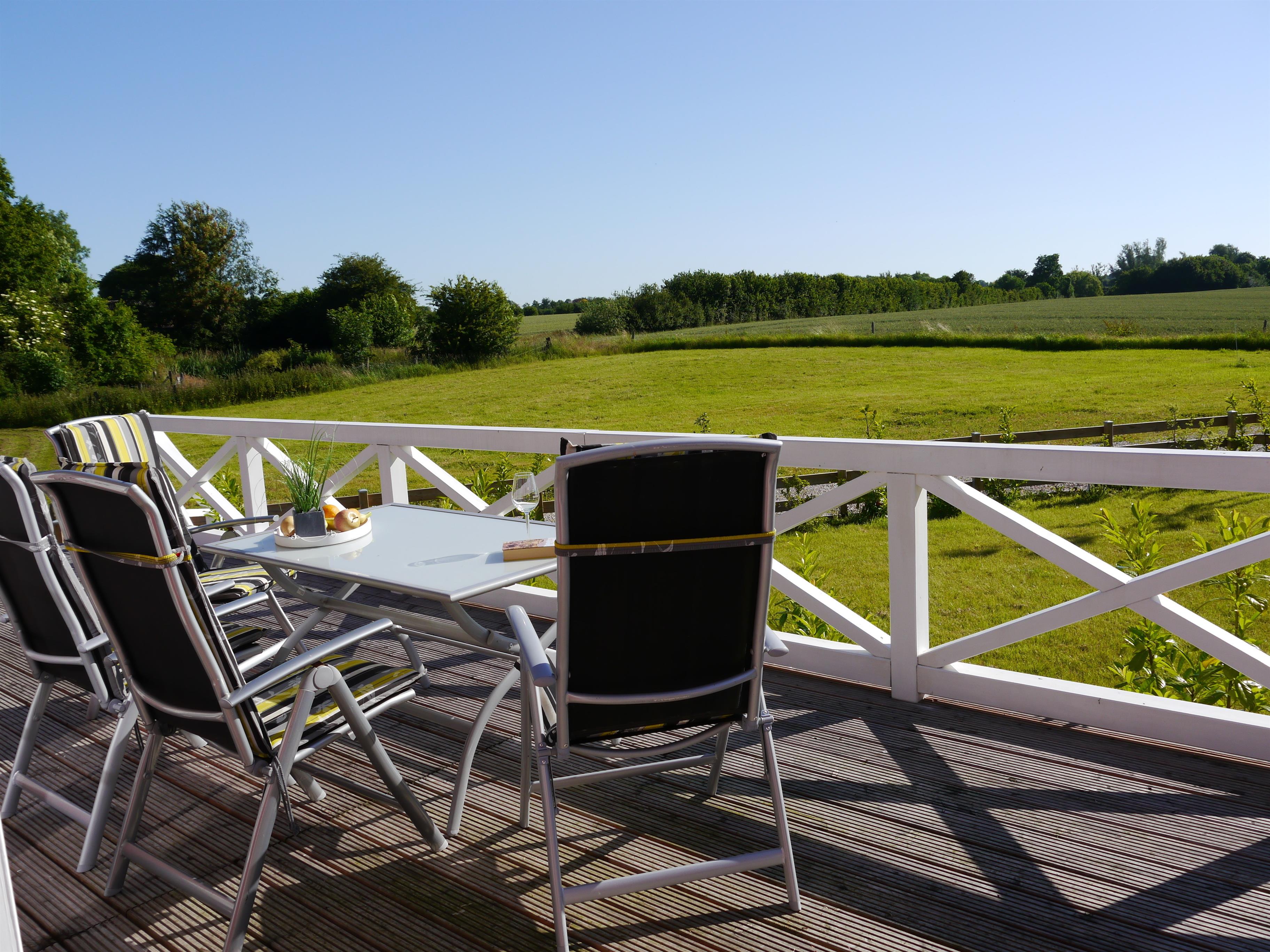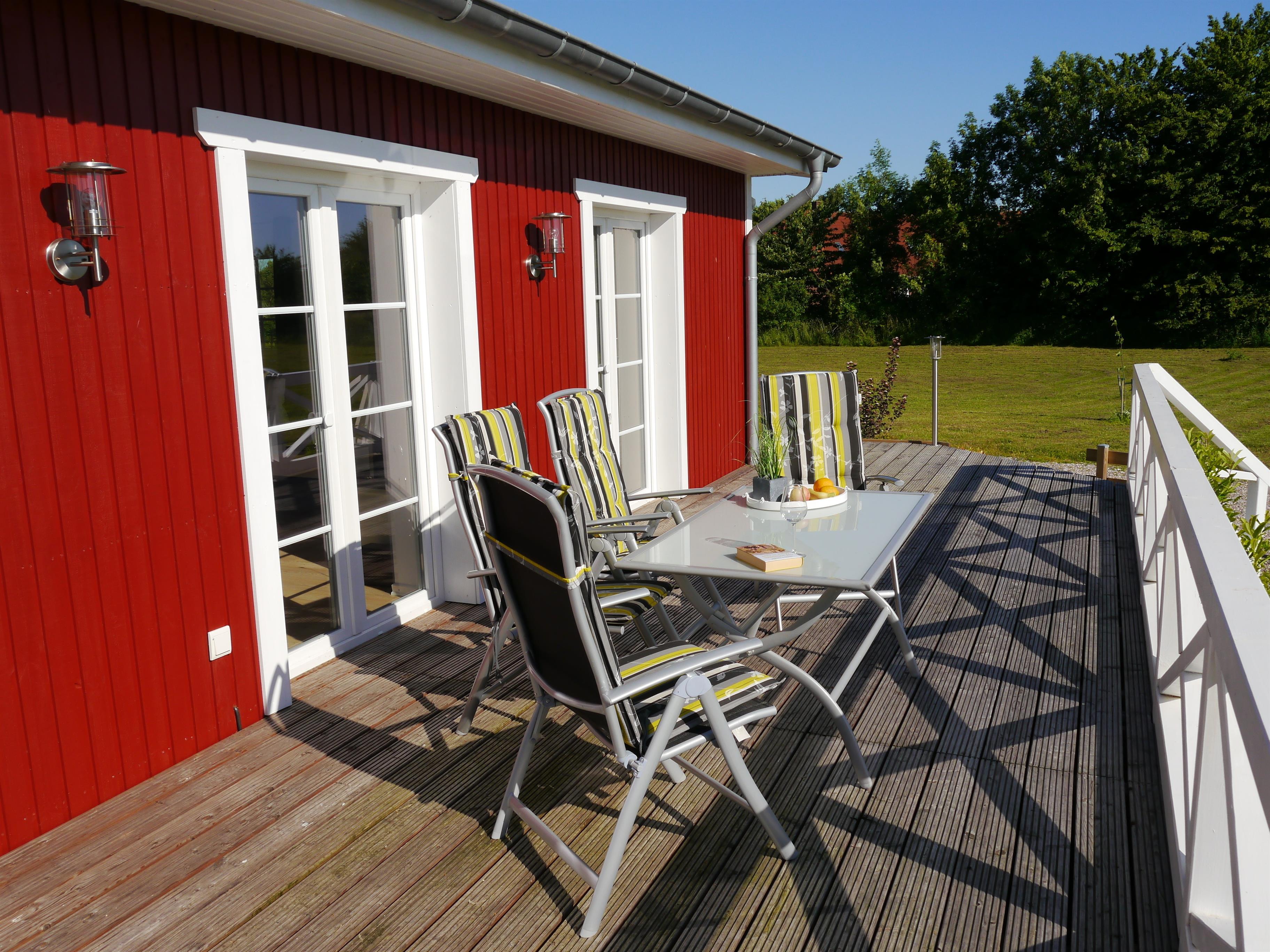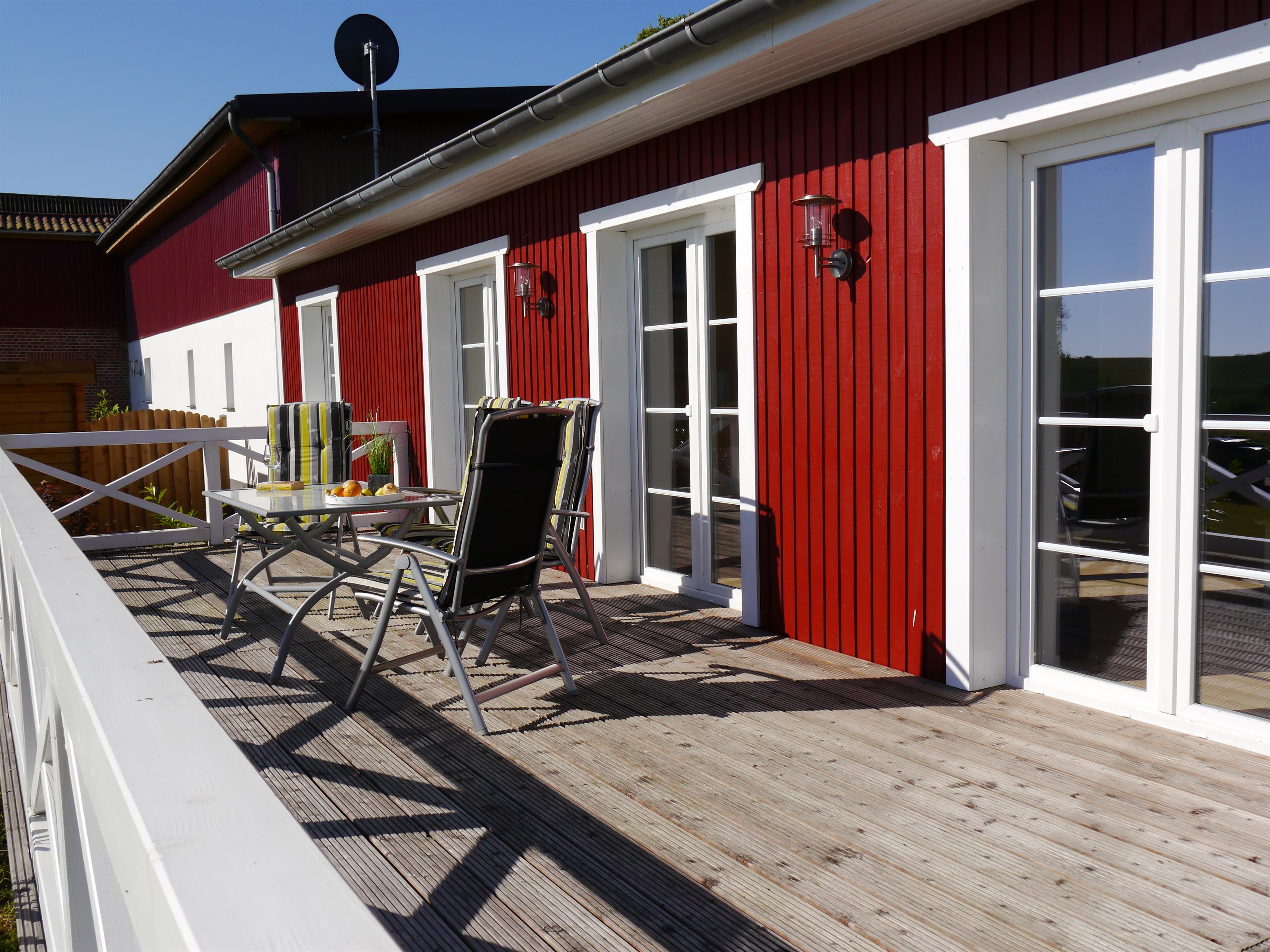 Auf unserem Bücherregal stehen verschiedene Bücher, Videos, DVD`s und Spiele für Kinder und Erwachsene. Von diesem großzügigen Wohnraum aus haben Sie direkten Zugang auf die 40 Quadratmeter große Holzterrasse mit gemütlichen Gartenmöbeln, Liegen und Sonnenschirm.