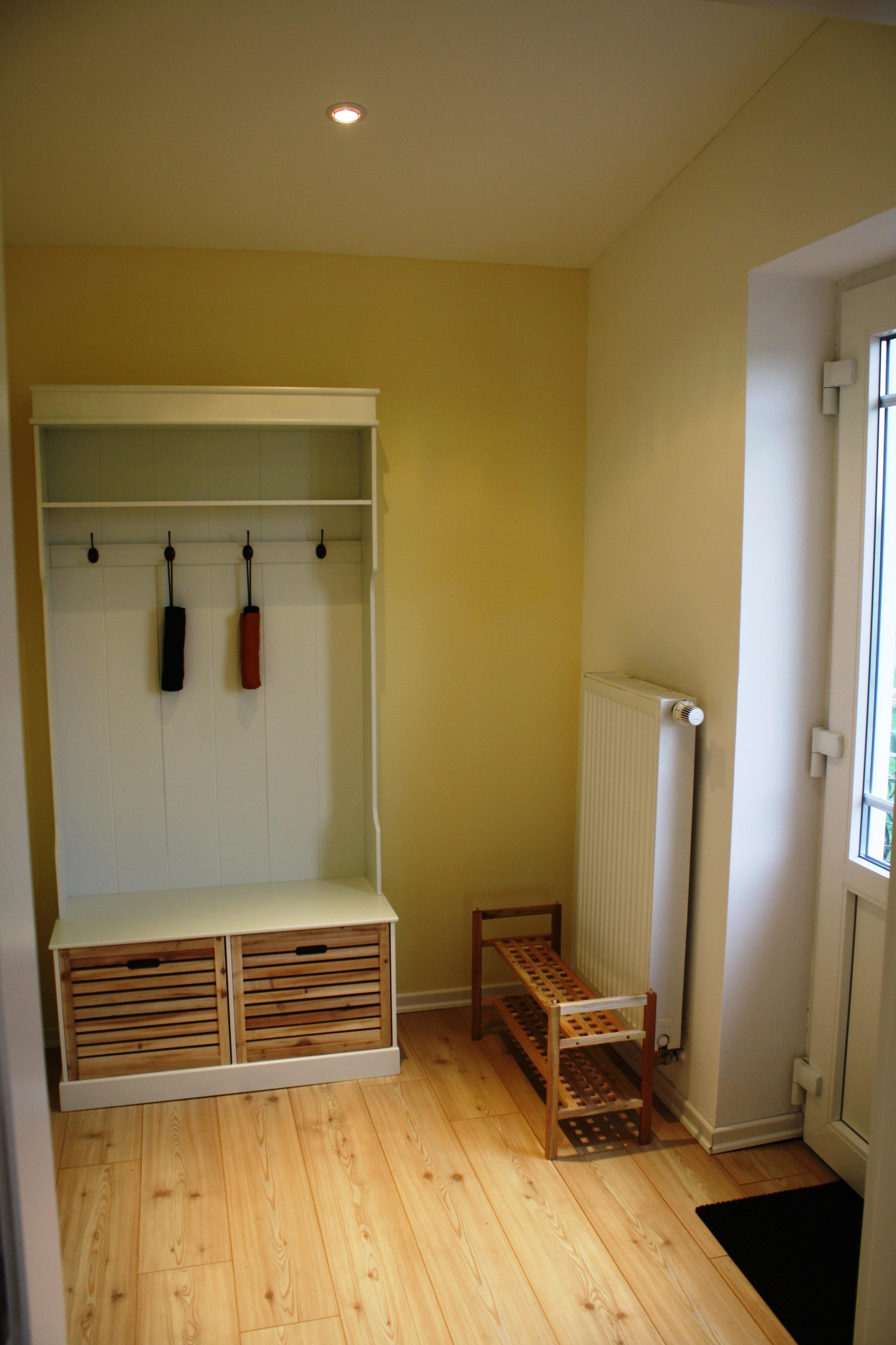 Sie betreten über eine großzügige Holzterrasse das Haus. Vom Eingangsbereich mit Garderobe, Schirmständer und Schuhablage aus gelangt man in den Wohnbereich.