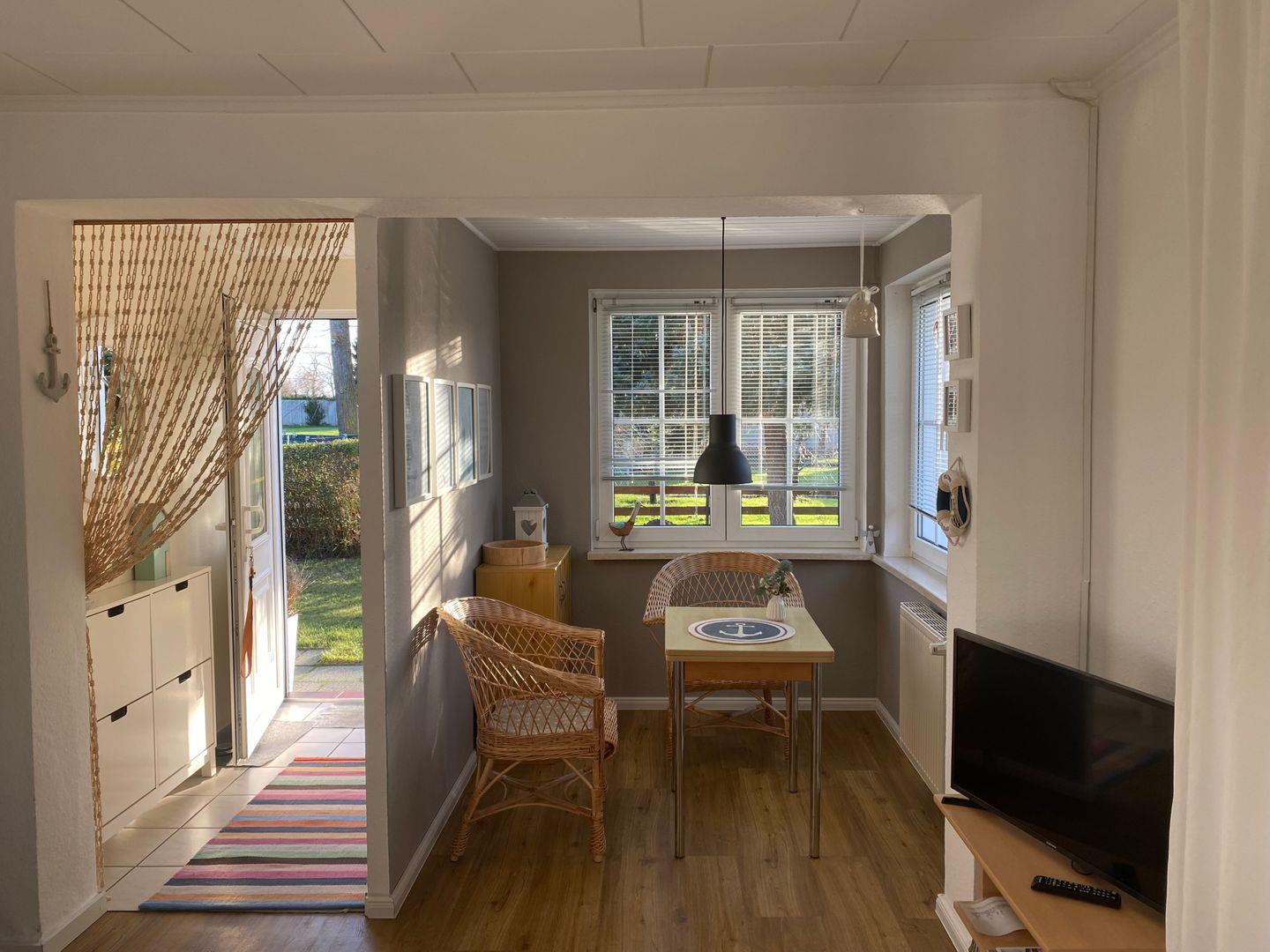 Dieses liebevoll eingerichtete 49 m² große Ferienhaus in Elmenhorst, ganz in der Nähe zu Warnemünde, ist der perfekte Ort für Paare oder Alleinreisende, die Komfort und Ruhe suchen. Über einen praktischen Vorflur mit Schuhschrank gelangen Sie in den gemütlichen Wohnbereich, der mit einem TV und einer kleinen Sitzecke zum Entspannen einlädt.
