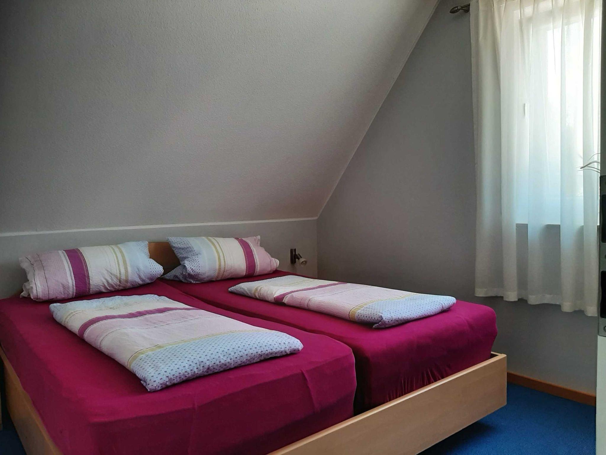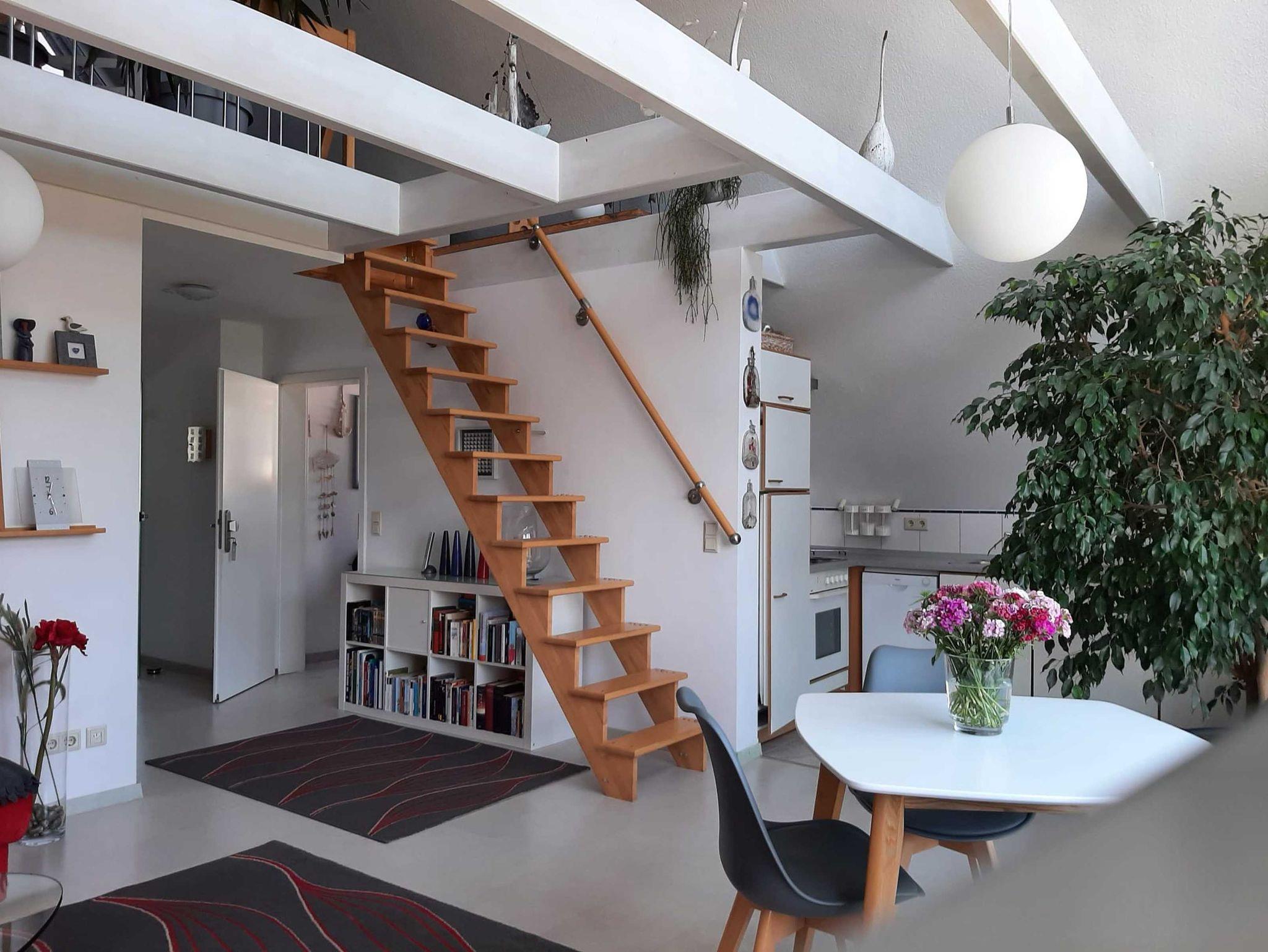 Die Ferienwohnung verfügt über zwei Schlafräume, einen ausgebauten Spitzboden, eine offene Küche zum Wohnraum sowie einem Bad mit Badewanne und separater Dusche.