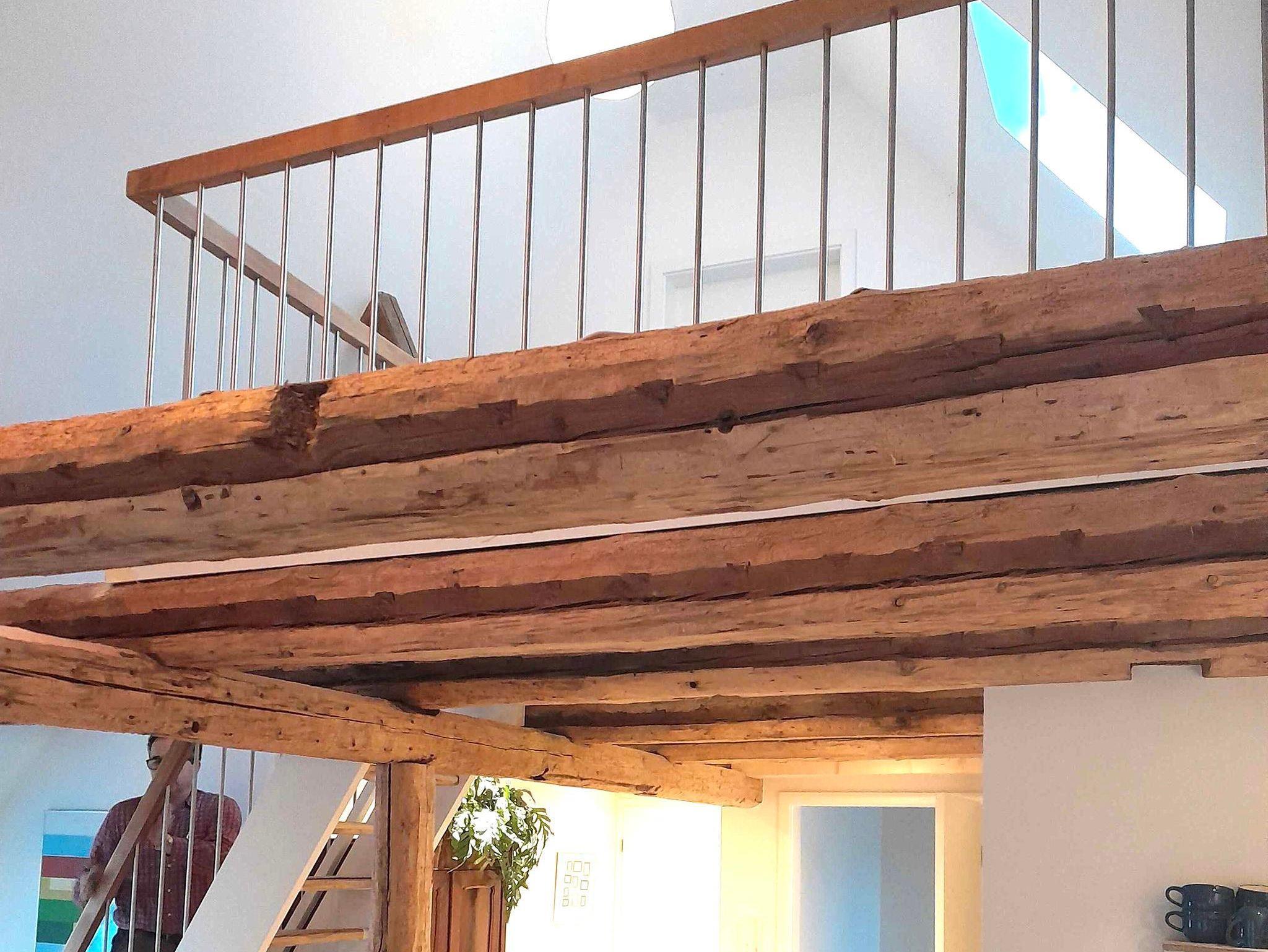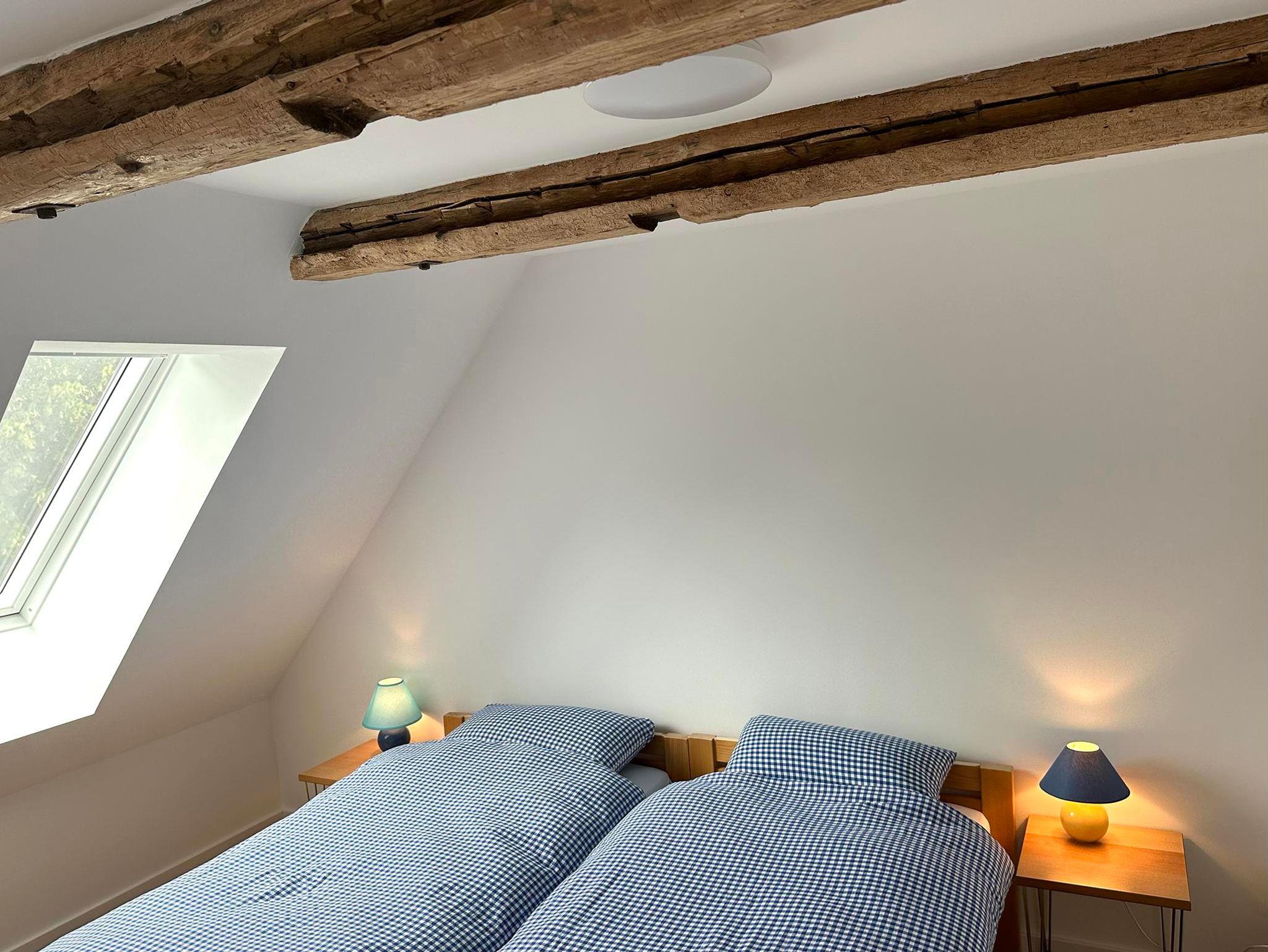 Die Fewo Horst2_ grün im OG ist grundsaniert und ganz neu. Die 60 qm plus 6 qm Empore bieten Raum für 4-5 Personen. Der großzügige Wohnbereich ist zum Dach geöffnet. Die freigelegten Balken und der Holzfußboden geben der Wohnung ein besonderes Flair – attraktiv ist die Empore als Rückzugsort oder zum Spielen. Es gibt zwei Schlafzimmer: einen Doppelbett-Schlafraum und einen weiteren mit zwei Einzelbetten. Zusätzlich gibt es eine Schlafkammer mit einem Einzelbett (offen zum Wohnraum). Das Duschbad ist gräumig und hell. Die Küchenzeile und die Elektrogeräte darin sind neu.