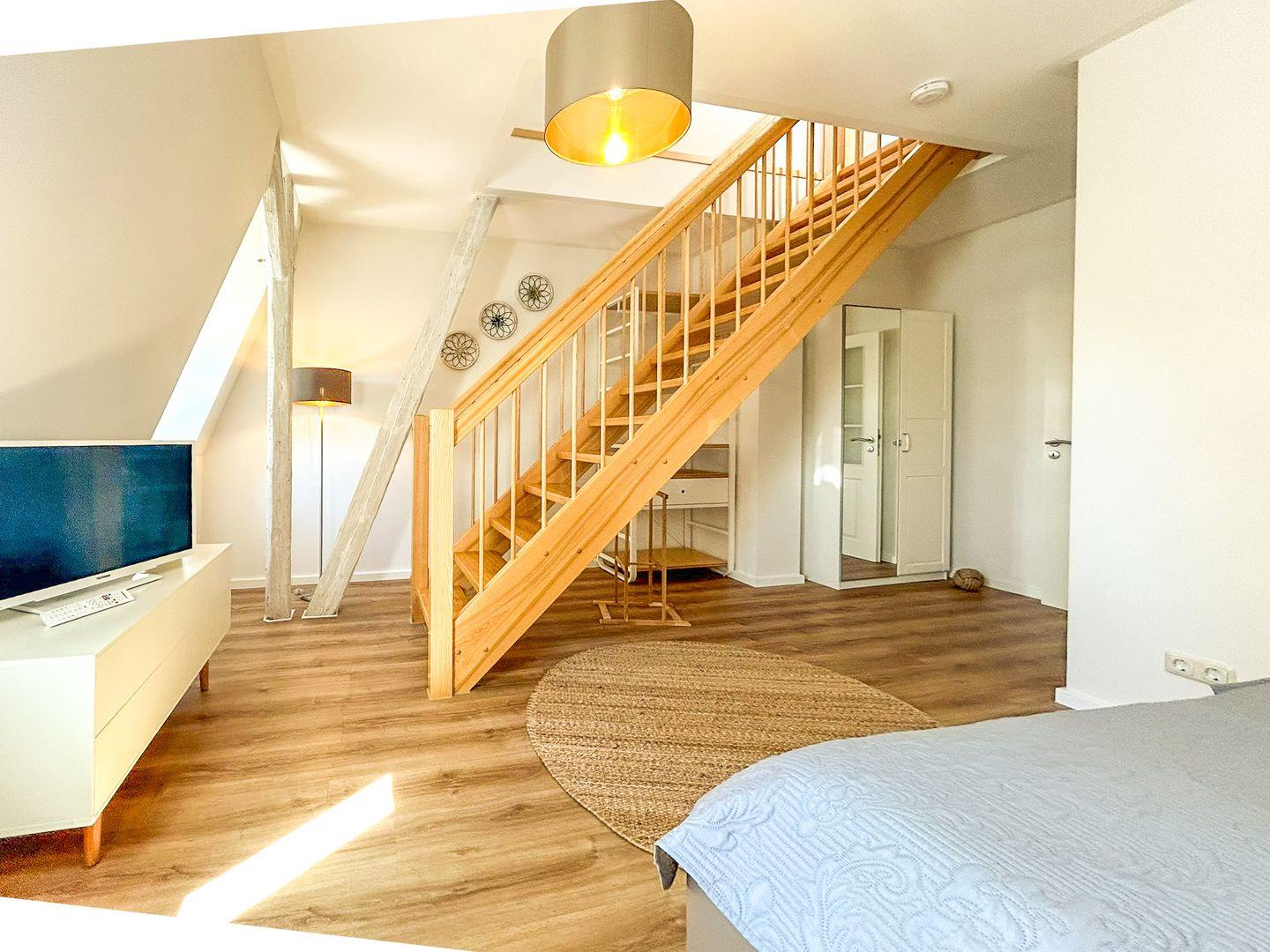 Über eine große Holztreppe gelangt ihr in den Flur des 1. Obergeschosses. Von hier aus könnt ihr das geräumige Duschbad oder das gemütliche Schlafzimmer (Doppelbett 160 x 200 cm) betreten. Dort ist ebenfalls ein TV verfügbar. Außerdem ist das Zimmer mit einem kleinen Schreibtisch möbliert, an dem ihr Postkarten über euren fantastischen Aufenthalt an der Ostseeküste schreiben könnt. In dem Kleiderschrank und einem offenen Regal habt ihr die Möglichkeit, eure Urlaubsgarderobe zu verstauen.