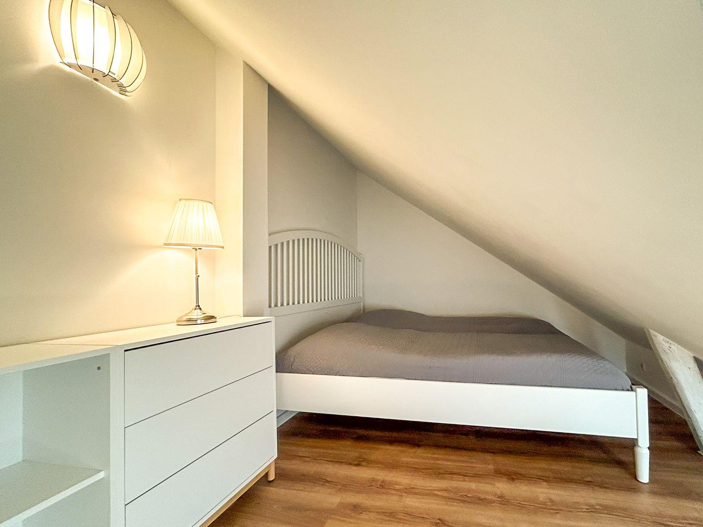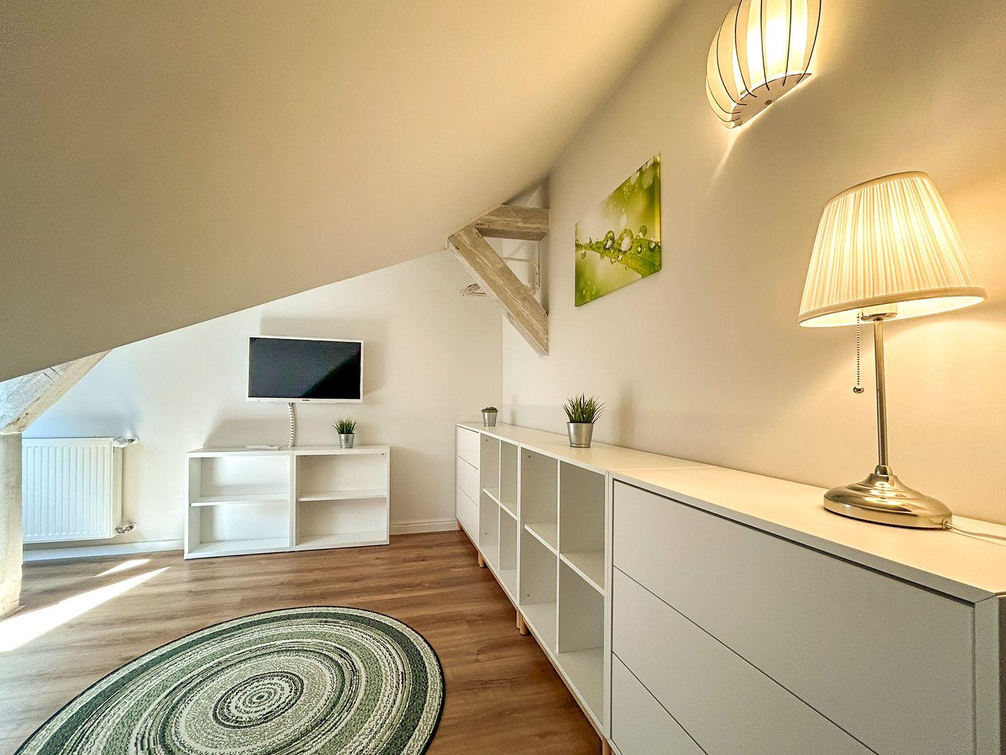 Eine weitere offene Stiege führt ins zweite, mit Liebe zum Detail eingerichtete Schlafzimmer. Dieses ist ebenfalls mit einem Doppelbett (160 x 200 cm) unter der Dachschräge eingerichtet. Zudem verfügt das Zimmer über eine weitere einzelne Schlafgelegenheit (80 x 200 cm) und ausreichend Stauraum. Selbstverständlich ist auch hier für etwas Kurzweil ein TV zu finden.