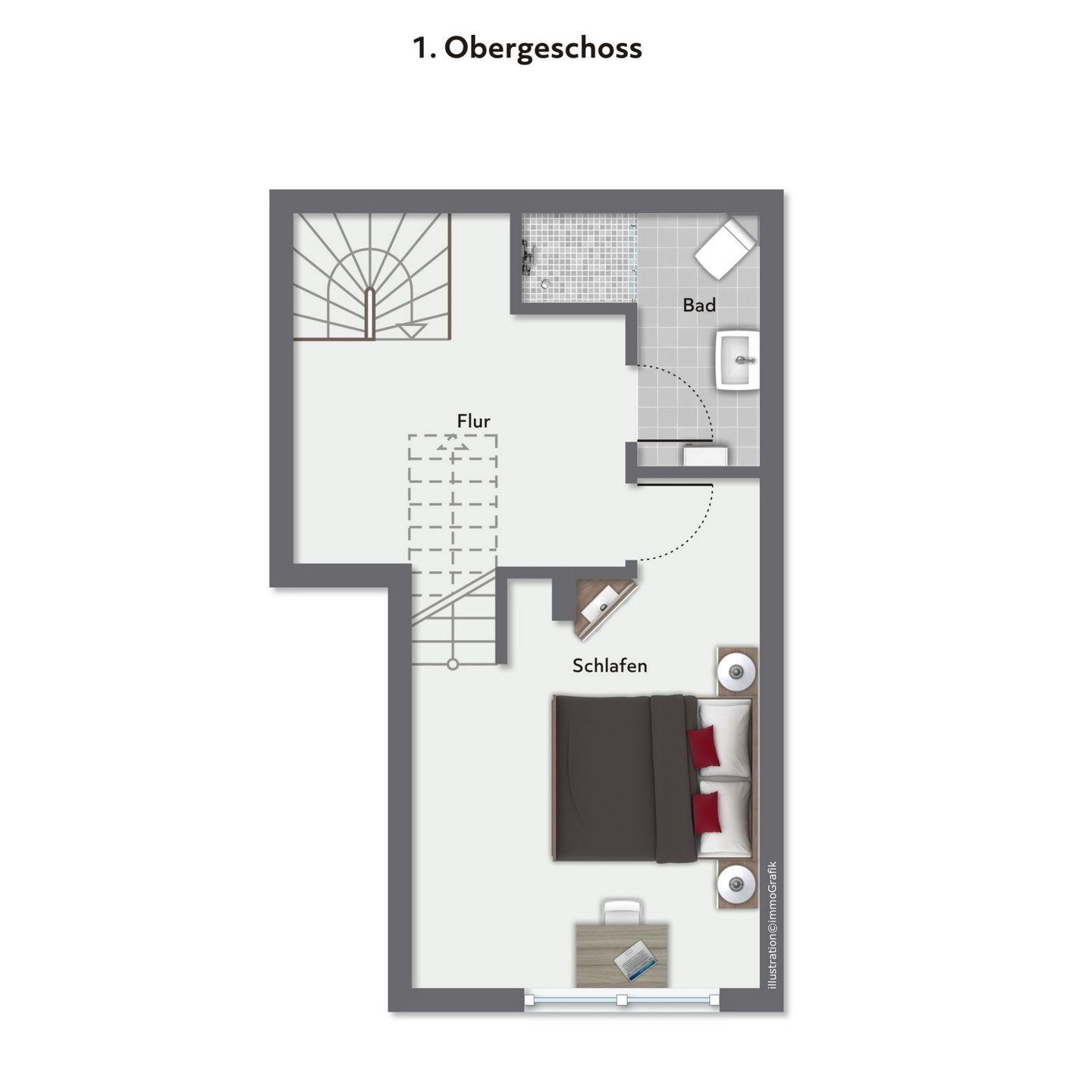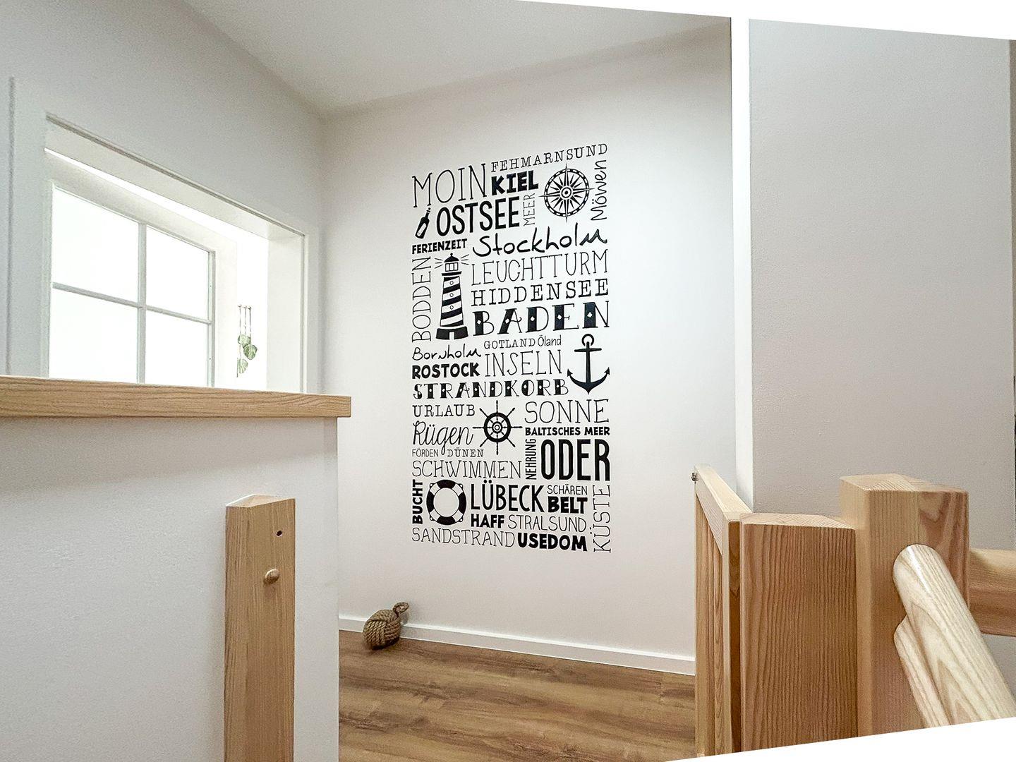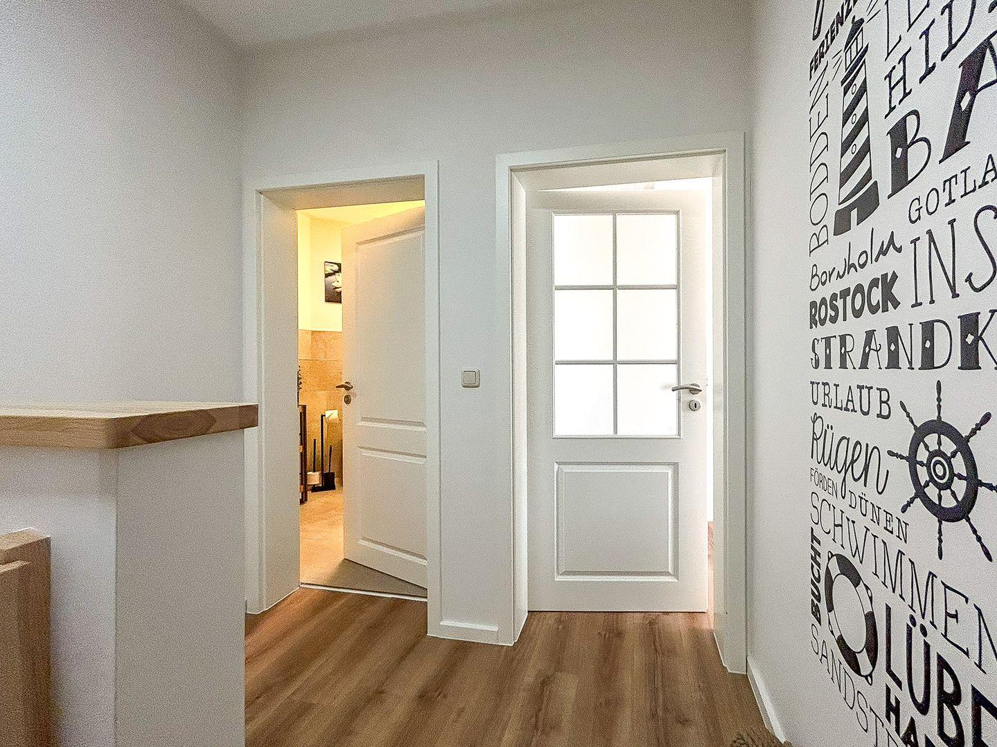 Über eine große Holztreppe gelangt man in den Flur des 1. Obergeschosses. Von hier aus kannst du das geräumige Duschbad mit Dusche oder das gemütliche Schlafzimmer (Doppelbett 160 x 200 cm) betreten. Hier steht dir ebenfalls ein TV zur Verfügung. Außerdem ist das Zimmer mit einem Schreibtisch versehen, an dem du Postkarten über deinen fantastischen Aufenthalt an der Ostseeküste schreiben kannst. In dem Kleiderschrank und einem offenen Regal hast du Gelegenheit, deine Urlaubsgarderobe zu verstauen.