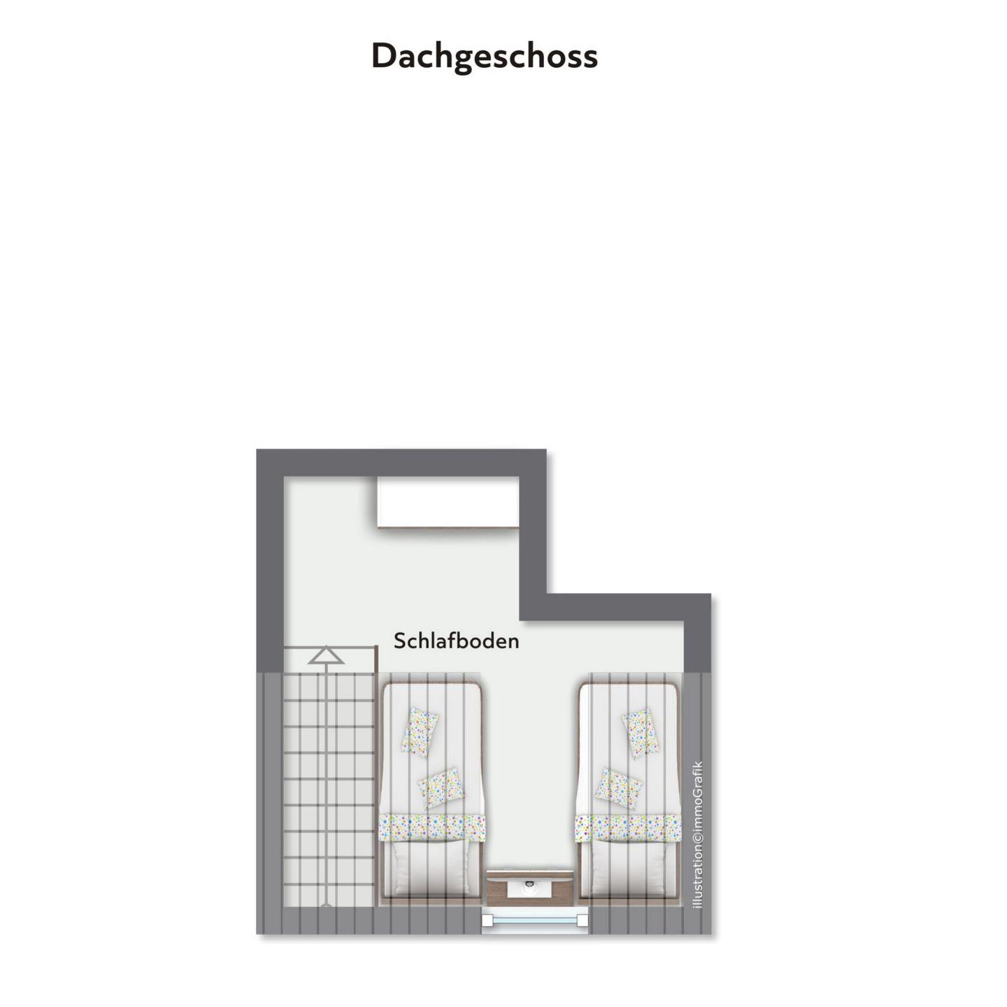 Eine weitere Stiege führt ins zweite räumlich offene Schlafzimmer, das mit zwei Einzelbetten (80 x 200 cm) eingerichtet ist. Diese lassen sich jeweils noch ausziehen und den Raum zur großen Liegewiese umfunktionieren. Von diesem charmanten Zimmer kannst du dir durch die Rundbogenfenster einen herrlichen Ausblick in den Garten verschaffen. Selbstverständlich ist auch hier für etwas Kurzweil ein TV zu finden.