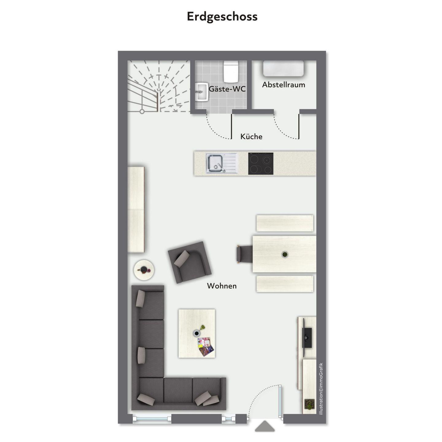 Im Erdgeschoss dieser mit individuellem Grundriss geschnittenen Ferienwohnung befindet sich weiterhin das modern eingerichtete Gäste-WC. Außerdem ist ein Abstellraum vorhanden, in dem sich ein Staubsauger und weitere Utensilien finden lassen und in welchem du deine Koffer abstellen kannst.