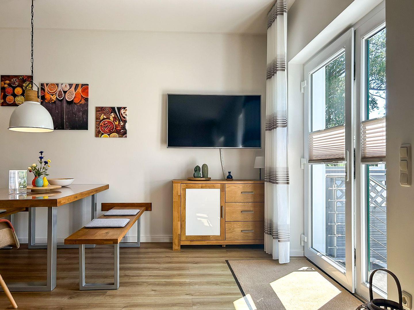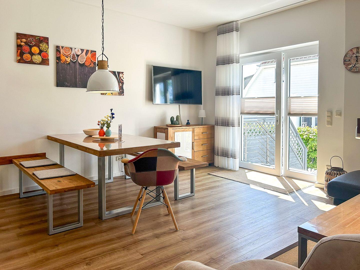Die gesamte Wohnung ist schick und funktional eingerichtet und lässt ein Wohlfühlgefühl aufkommen. Im Wohnbereich steht dir ein 55-Zoll großer TV zur Verfügung. Der angrenzende Esstisch bietet ausreichend Platz für Mahlzeiten mit der ganzen Familie.