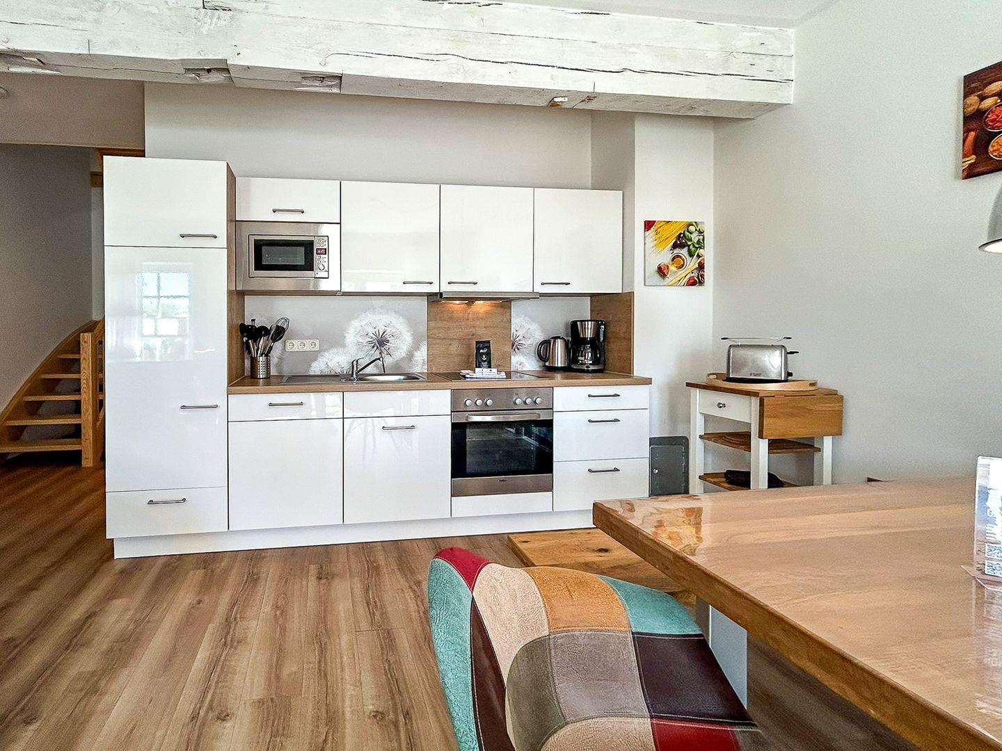 Über eine Außentreppe neben der großzügigen Südterrasse erreichst du den stilvoll eingerichteten Wohn- und Essbereich. Die angrenzende moderne Küche beinhaltet neben einem Kühlschrank mit Tiefkühlkombination, einem 4-Platten-Cerankochfeld mit Backofen, Spülmaschine und Mikrowelle selbstverständlich auch alle nötigen Küchenutensilien wie Toaster, Wasserkocher etc.