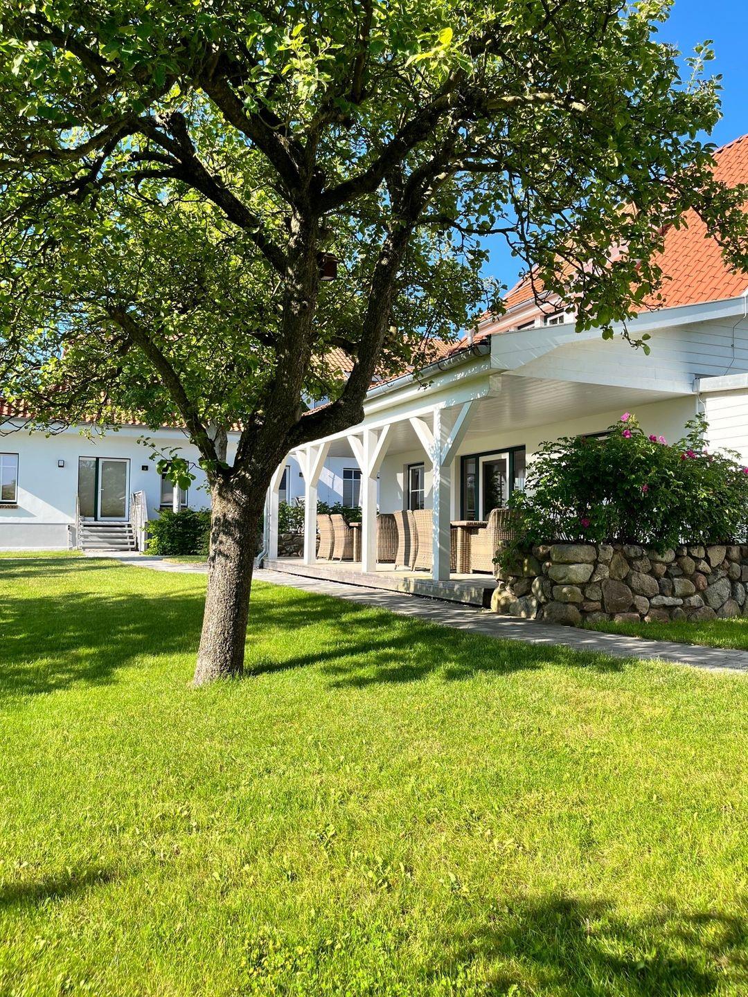 Die überdachte Holzterrasse des angrenzenden Gebäudes ist für alle Gäste frei nutzbar. Von hier aus kannst du auch prima die untergehende Sonne genießen.