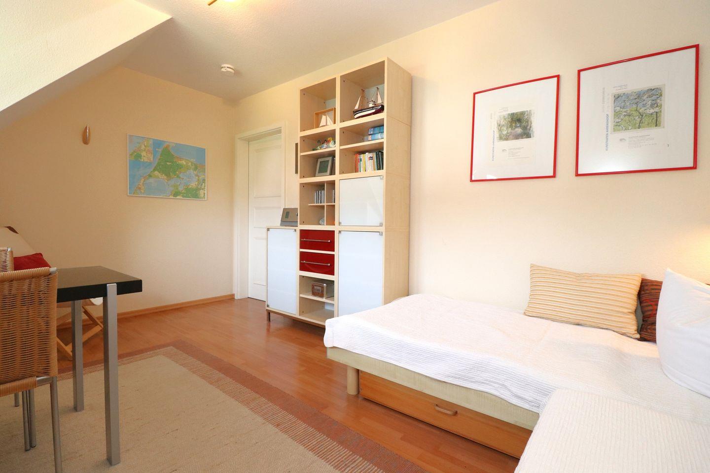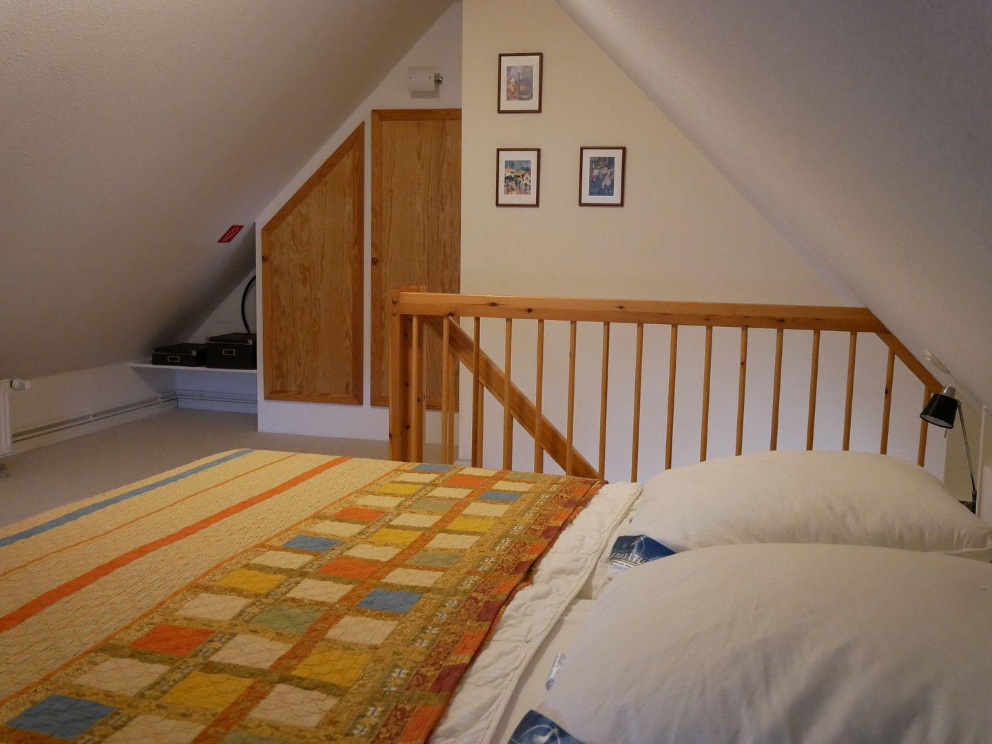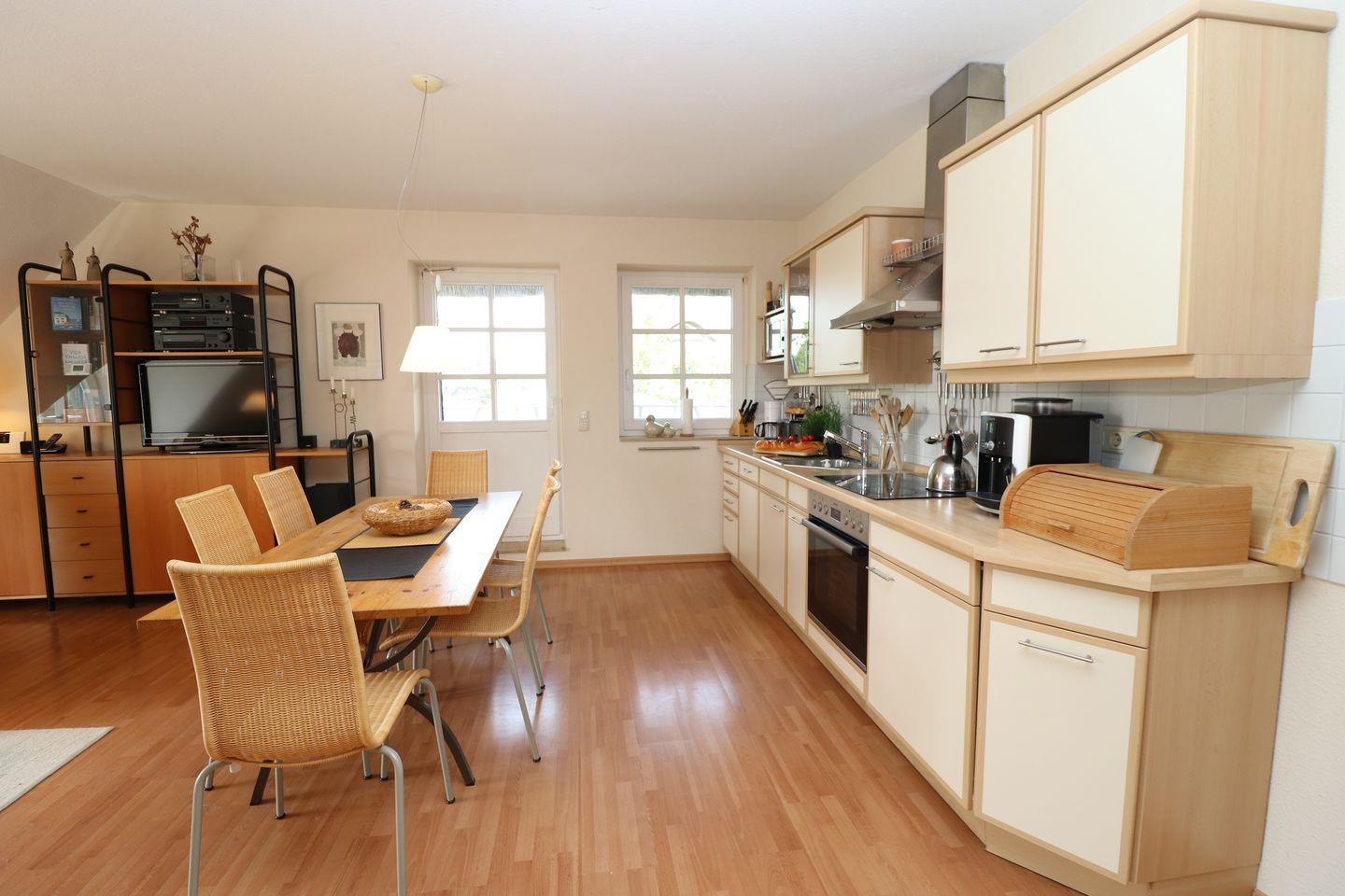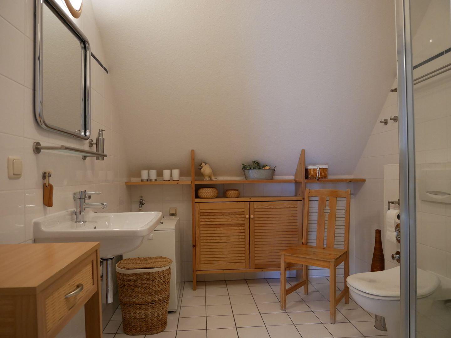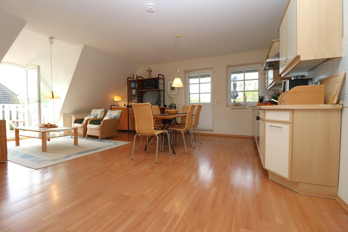 Ein gemütliches Maisonette-Appartement im Obergeschoss, nahe Badestelle perfekt für maximal 4 Personen. Genießen Sie zwei Balkone an der West- und Südseite mit Blick auf den Bodden, ideal für entspannte Stunden im Freien und wunderschöne Sonnenuntergänge. Im Obergeschoss befindet sich das Wohnzimmer mit einer praktischen Küchenzeile, damit Sie sich selbst versorgen können, sowie ein Bad mit Fußbodenheizung, einer Waschmaschine und Dusche/WC sowie ein Wohn-/ Schlafzimmer mit zwei Einzelbetten. Das zweite Schlafzimmer befindet sich im Dachgeschoss und verfügt über ein komfortables Doppelbett für erholsamen Schlaf. In der Wohnung steht Ihnen WLAN für einen bequemen Internetzugang während des Aufenthalts zur Verfügung. Der PKW-Stellplatz sowie ein abschließbarer Fahrradschuppen, in dem Ihnen 2 Fahrräder zur kostenlosen Nutzung zur Verfügung stehen, befinden sich direkt am Grundstück. Vierbeinige Gäste sind bei viel Auslauf in Boddennähe willkommen.