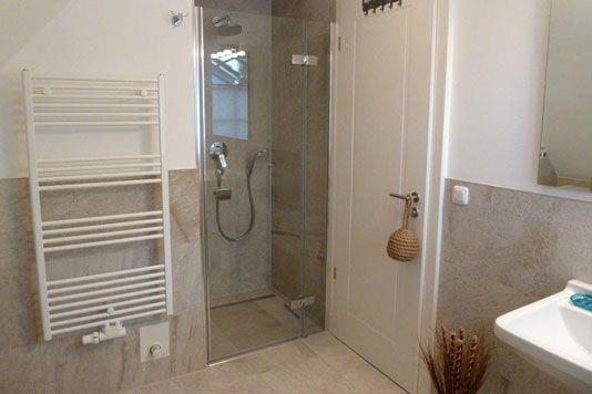 Im Obergeschoss erwarten Sie drei Schlafzimmer: zwei mit komfortablen Doppelbetten sowie ein weiteres Zimmer mit ausziehbarem Bett (1,60 × 2,00 m). Ein zusätzliches Badezimmer mit Dusche und WC sorgt für zusätzlichen Komfort.