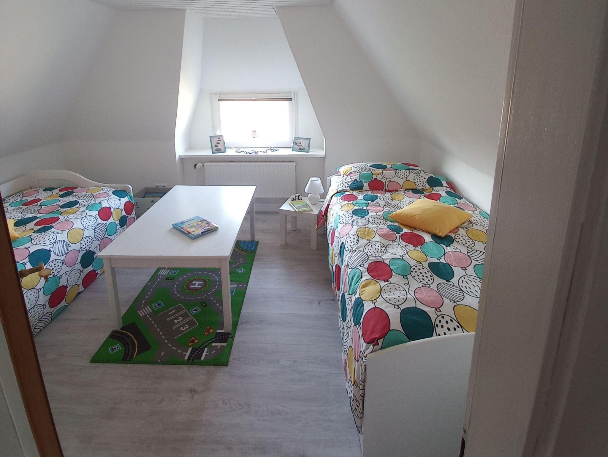 • Schlafzimmer mit 2 Einzelbetten (90x200), Spieltisch und Spielteppich; Bettwäsche zu buchbar