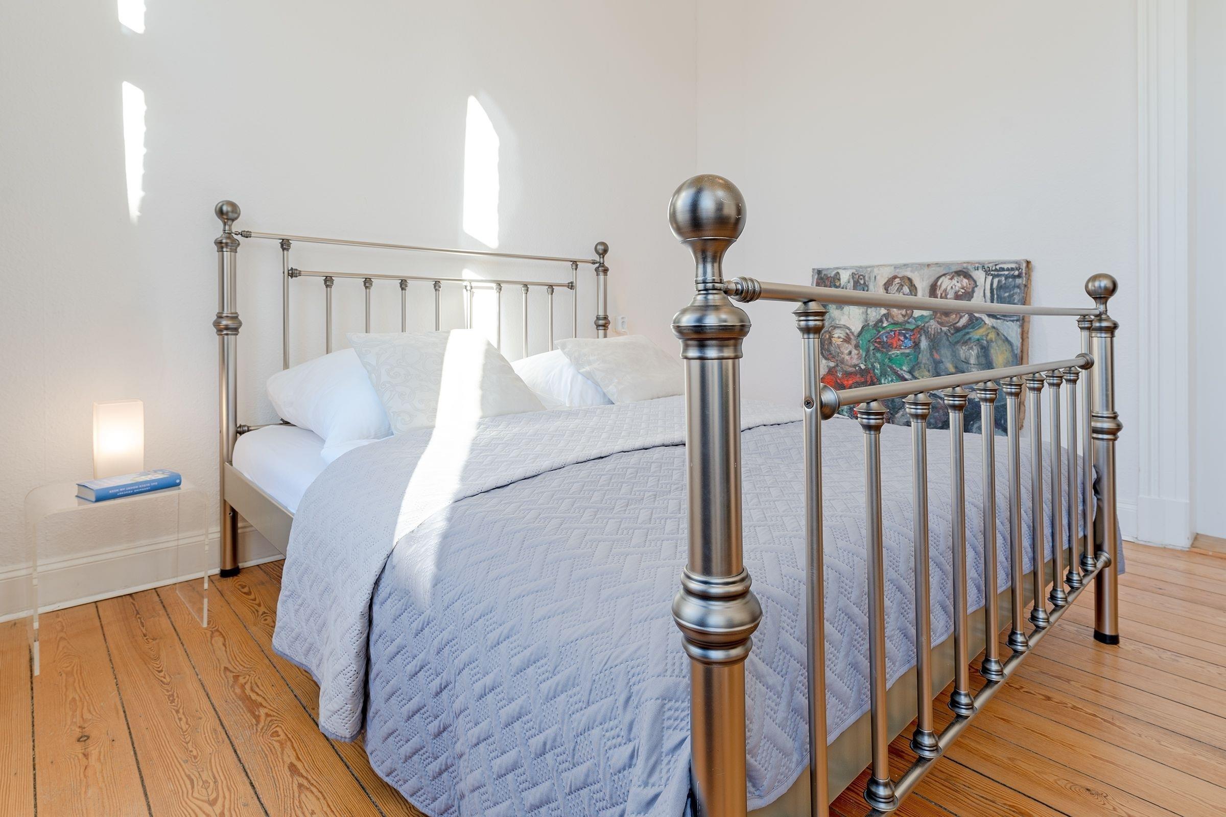 Schlafzimmer 1: Doppelbett (180x200 cm), Kleiderschrank, Verdunkelung: Vorhänge, Platz für Babybett vorhanden