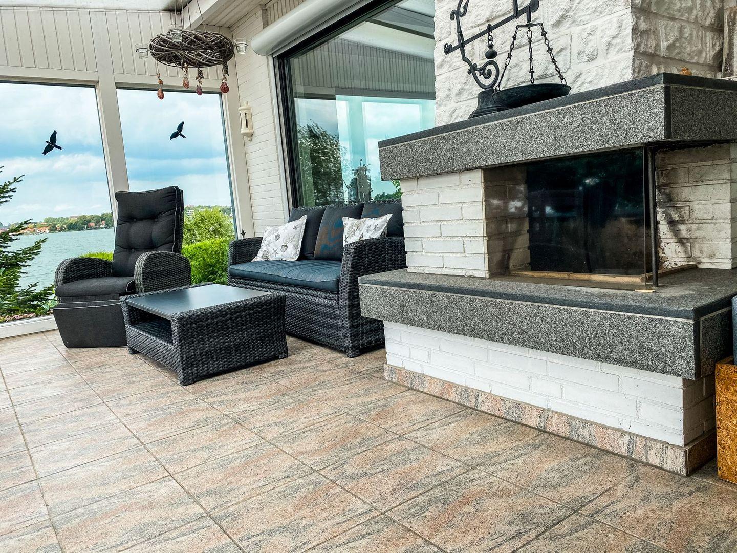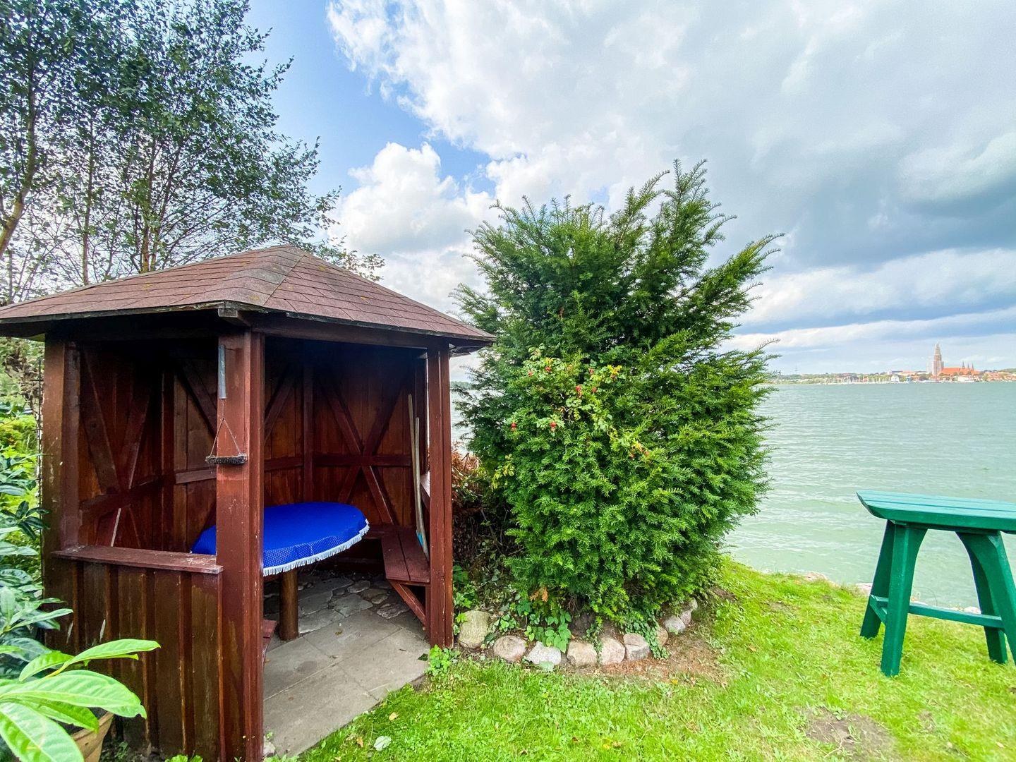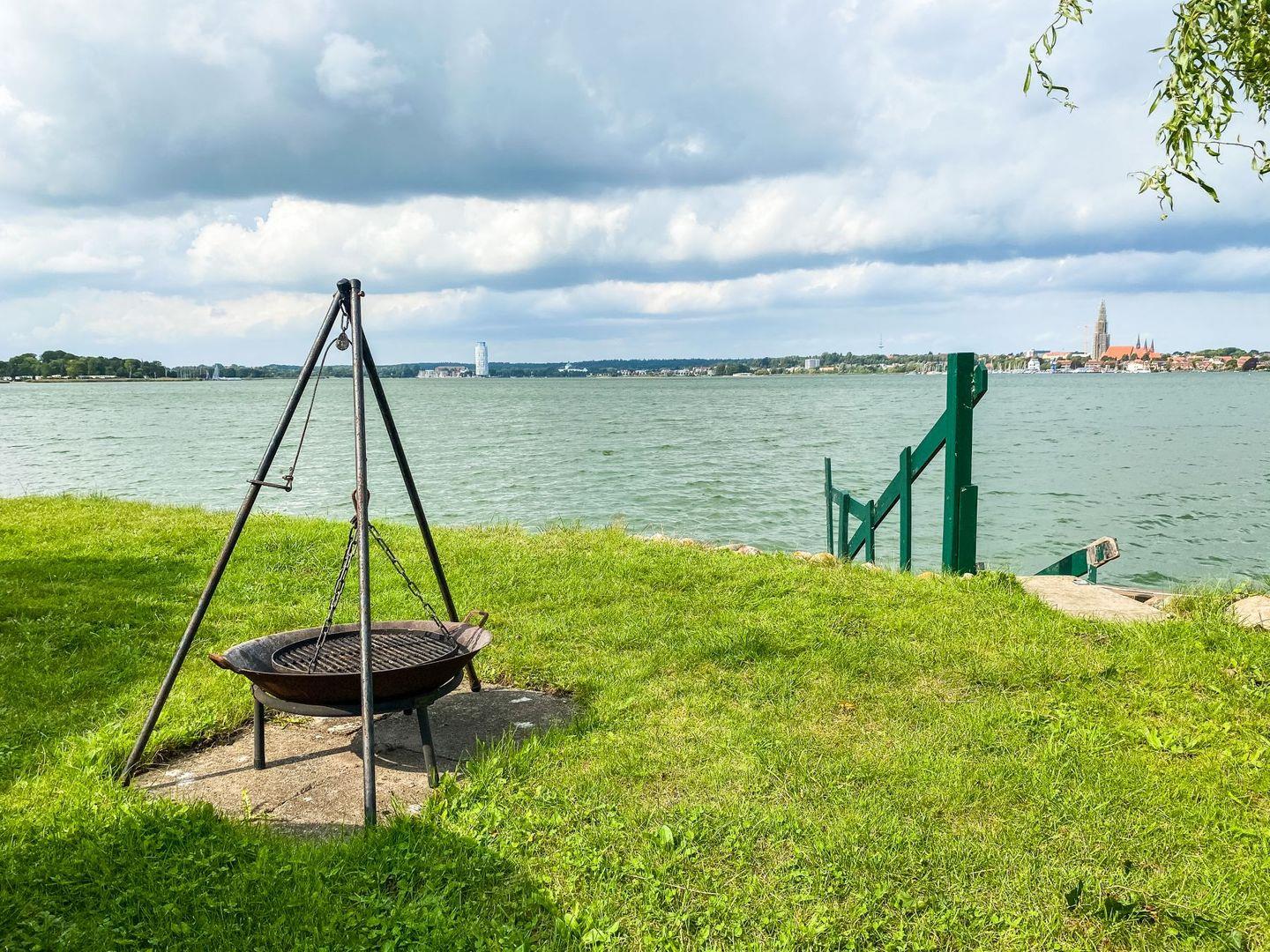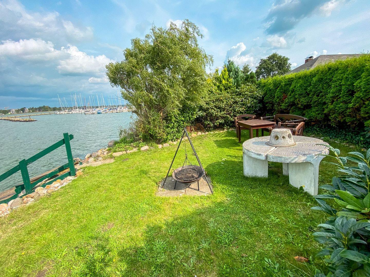 Das Grundstück ist großzügig geschnitten. Von der halb-überdachten großen Terrasse können Sie über eine Treppe direkt zum Wasser gehen. Dort stehen ausreichend Sitzmöglichkeiten und eine Feuerschale für Sie bereit.