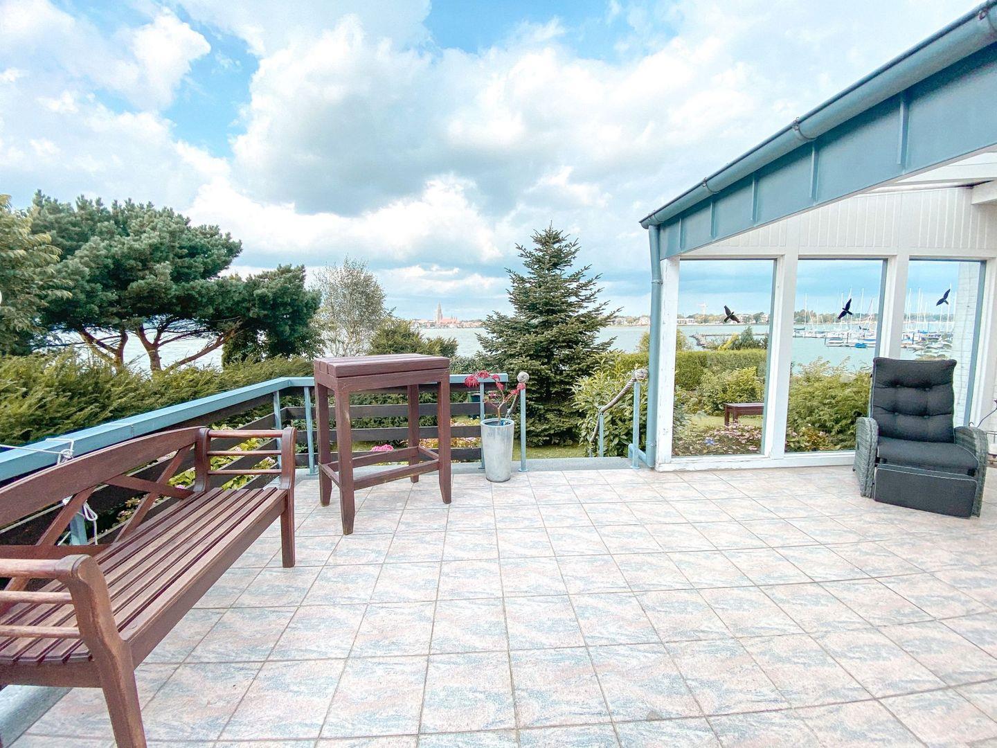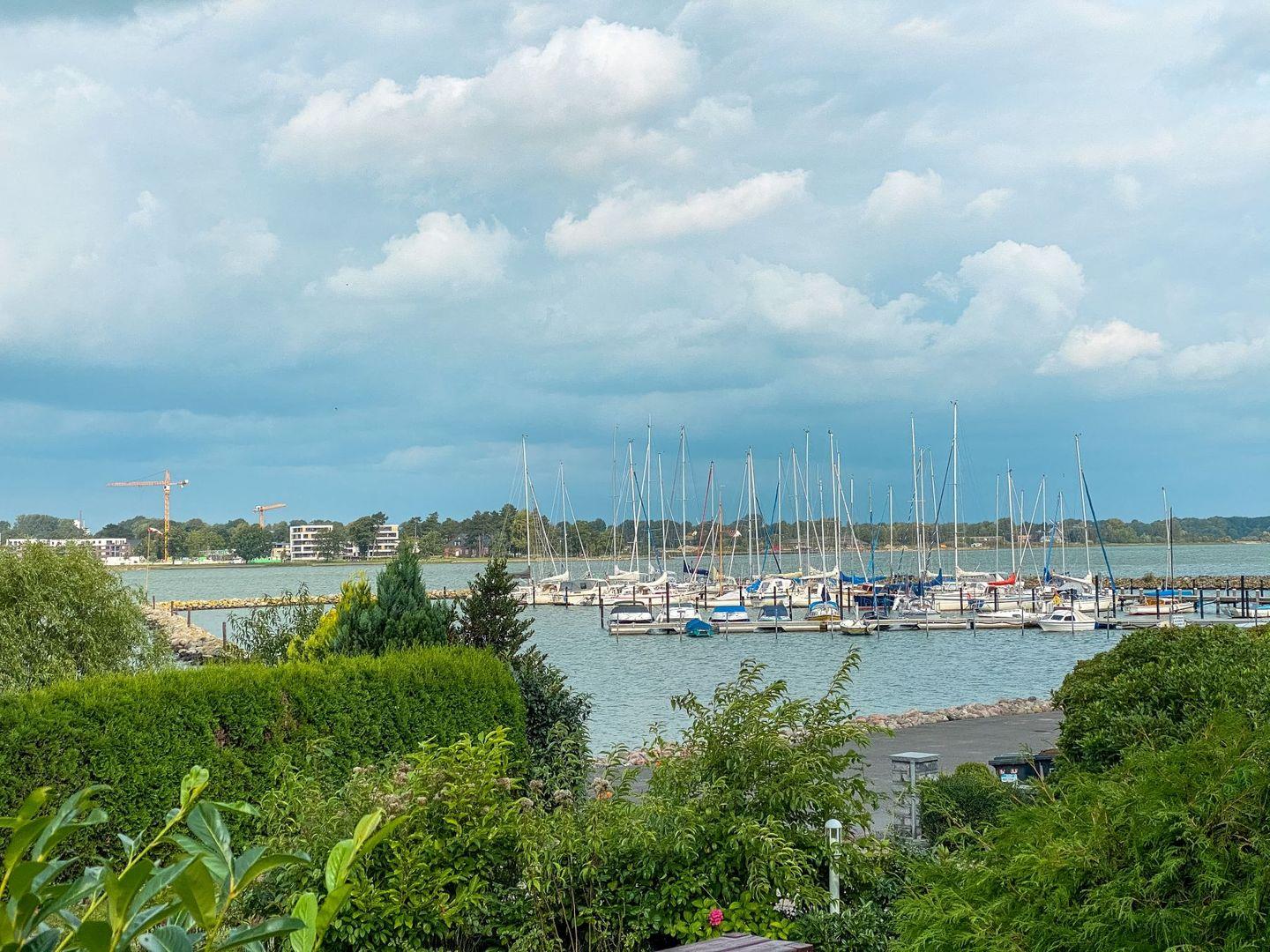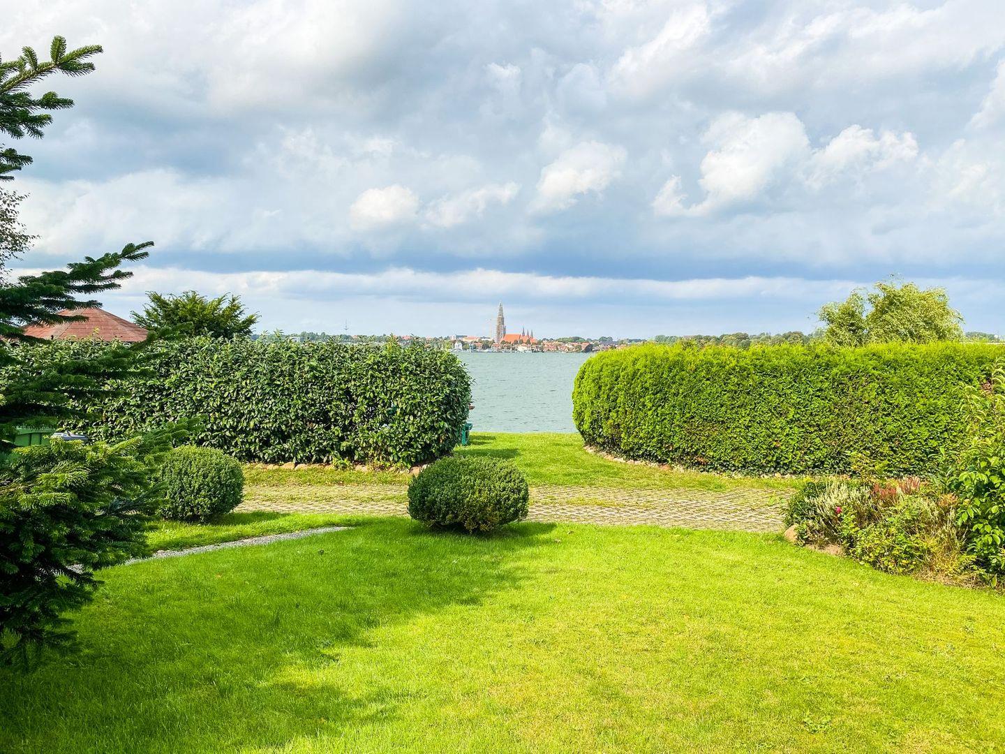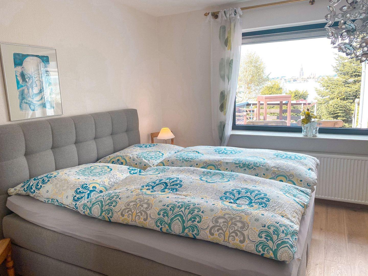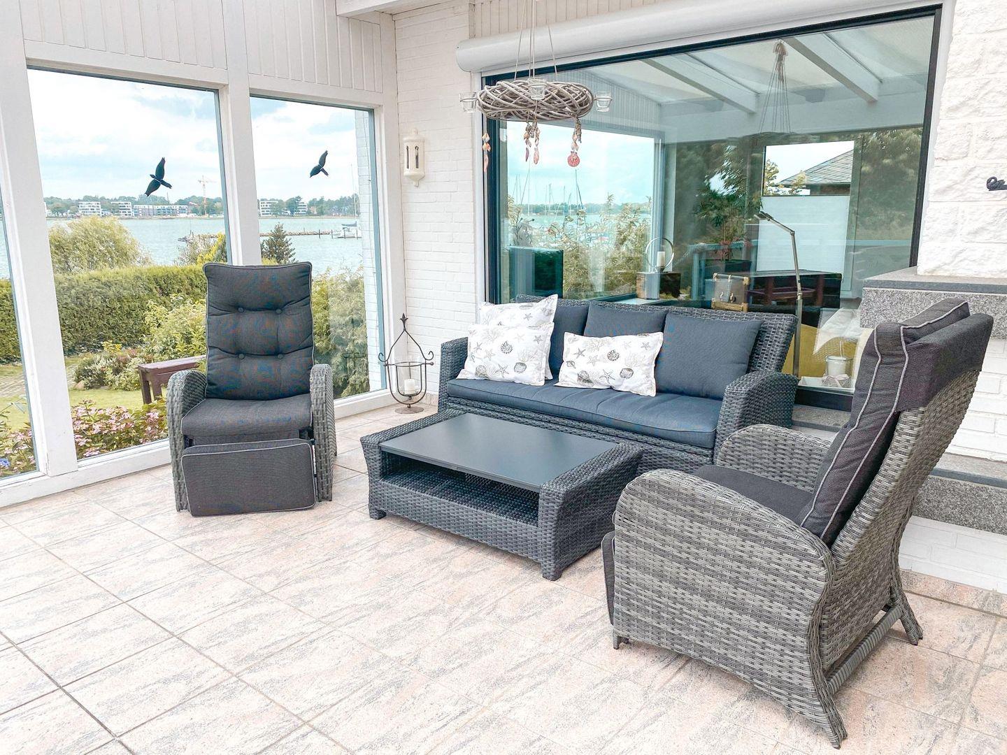 Wer sich lieber drinnen aufhält kann den traumhaften Blick auf die Schlei und den Schleswiger Dom vom Wohnzimmer durch das Panoramafenster aus betrachten.