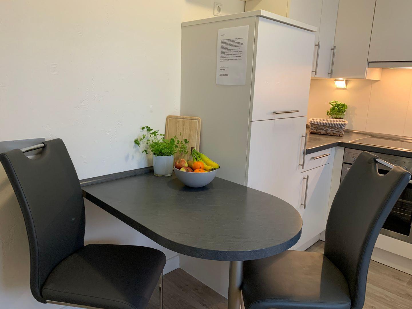 Die kleine Wohnung bietet neben einer vollausgestatteten Küche auch ein modernes Wohn-/Schlafzimmer mit einem Schlafsofa, das sich mit wenigen Handgriffen in ein gemütliches Bett umwandeln lässt.