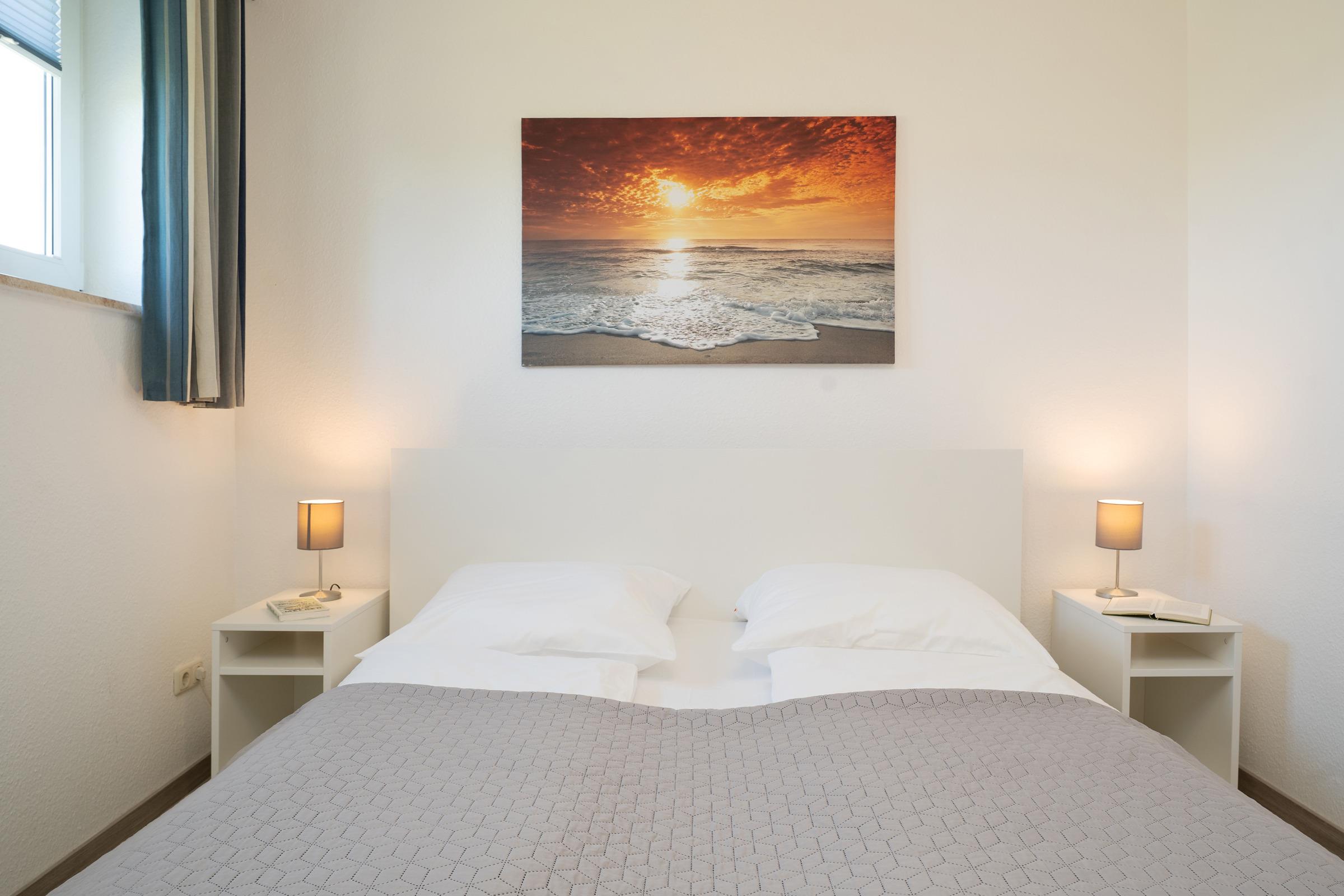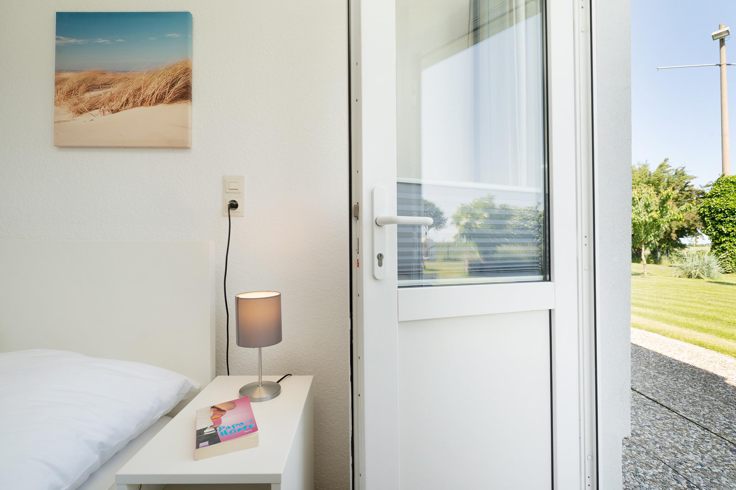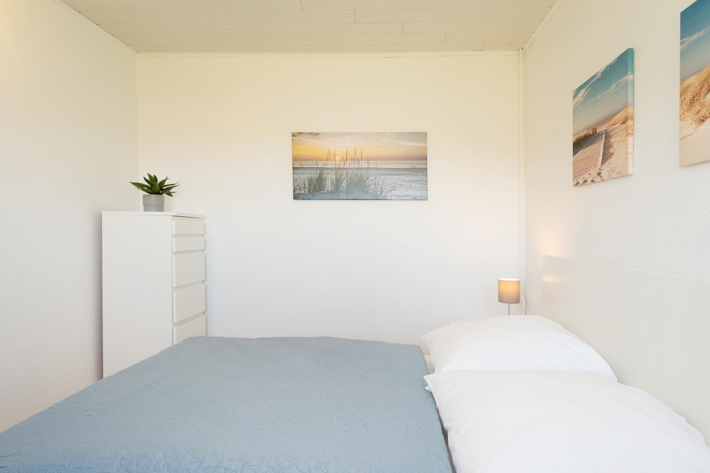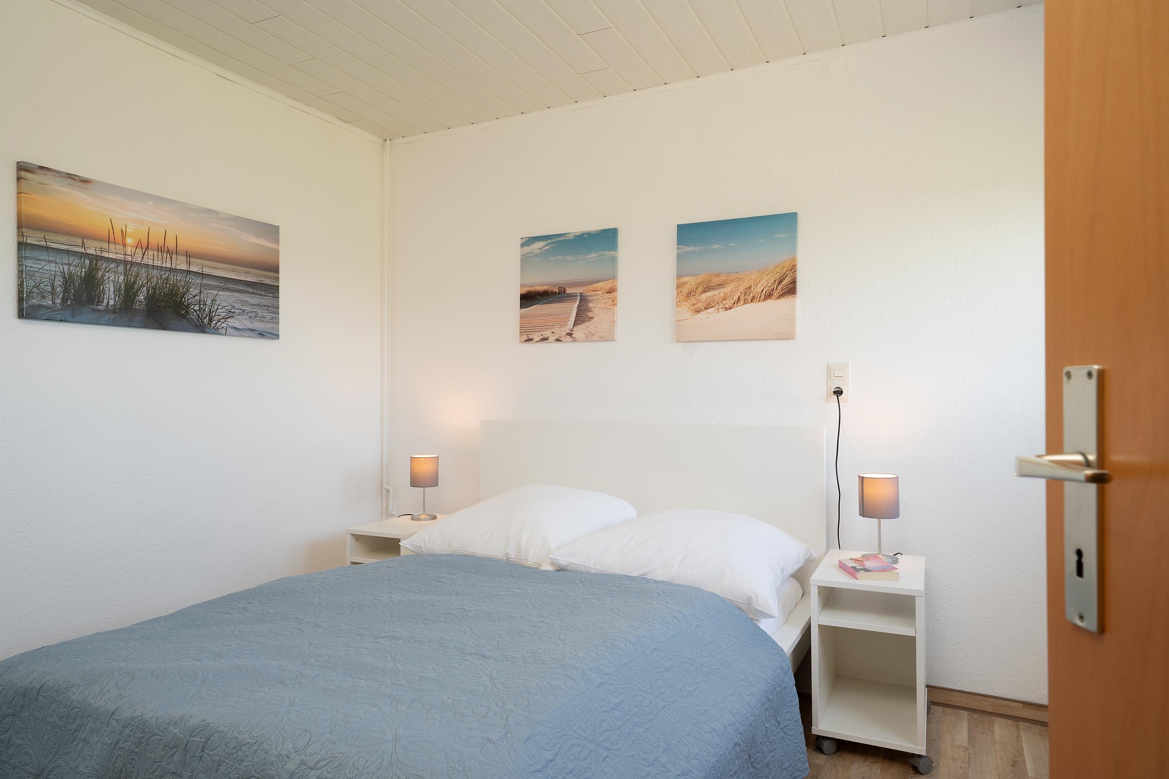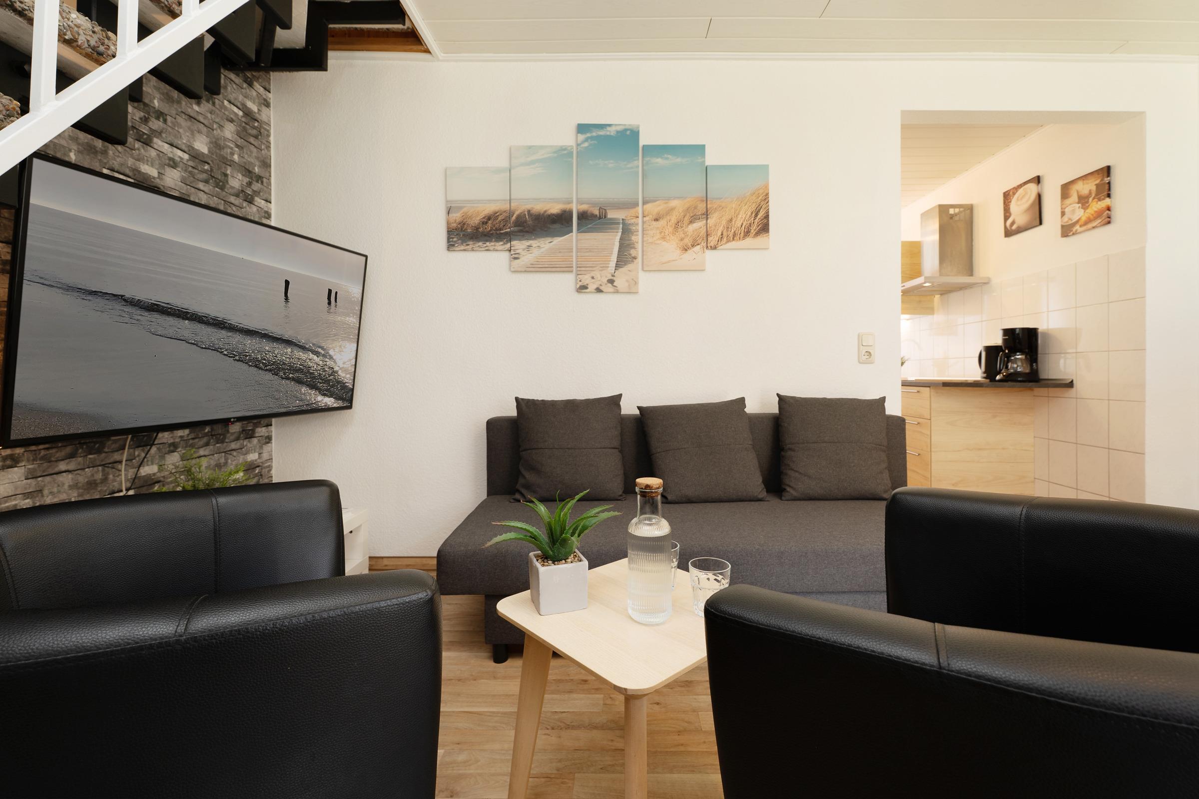 Der gemütliche Wohnbereich ist mit einem Fernseher ausgestattet und bietet ausreichend Platz für entspannte Stunden mit der Familie oder Freunden. Die Terrasse lockt mit Gartenmöbeln und der Gemeinschaftsgarten mit einem Strandkorb – der perfekte Ort im Freien. In der gut ausgestatteten Küche u. a. mit Backofen, Ceran-Herd (4 Kochfelder), Kühlschrank sowie Kaffeemaschine können Sie problemlos alle Mahlzeiten zubereiten. Ein gemütlicher Essplatz lädt zum gemeinsamen Genießen ein. In den zwei separaten Schlafzimmern stehen Ihnen jeweils Doppelbetten bereit – ideal für erholsamen Schlaf nach einem erlebnisreichen Urlaubstag. Das Badezimmer verfügt über Dusche und WC und ist funktional ausgestattet.