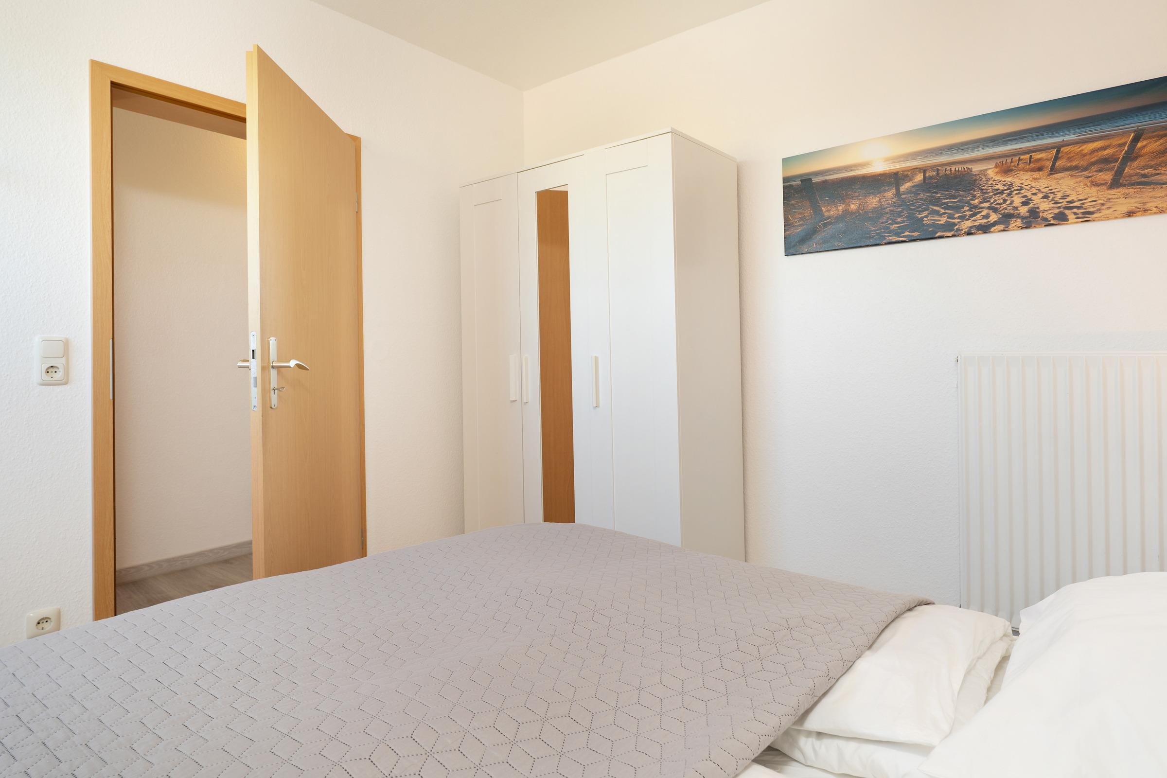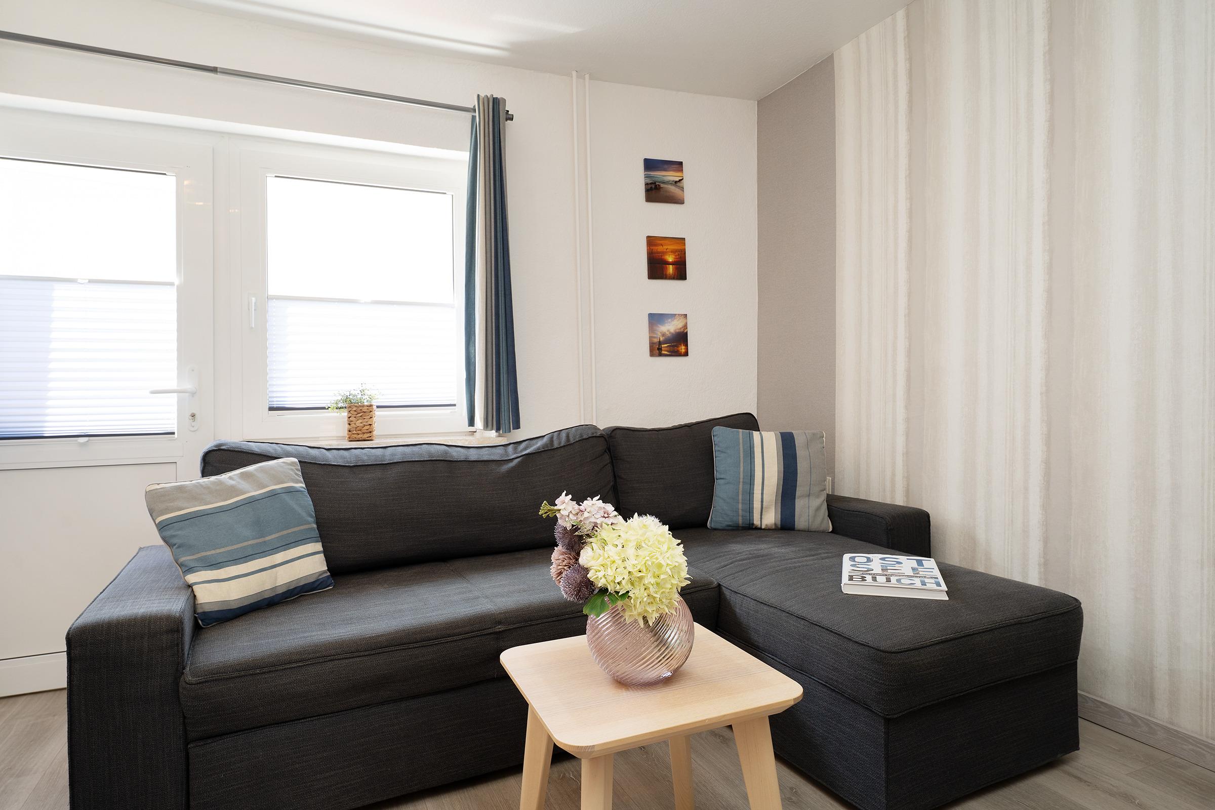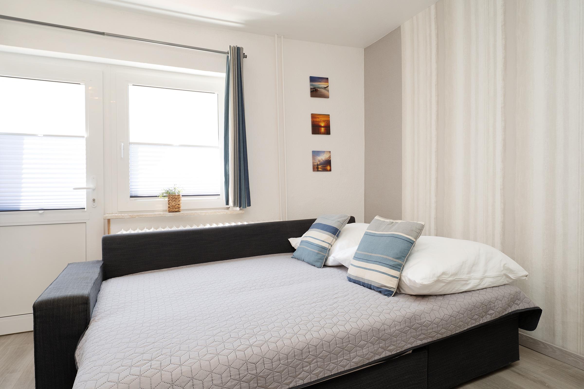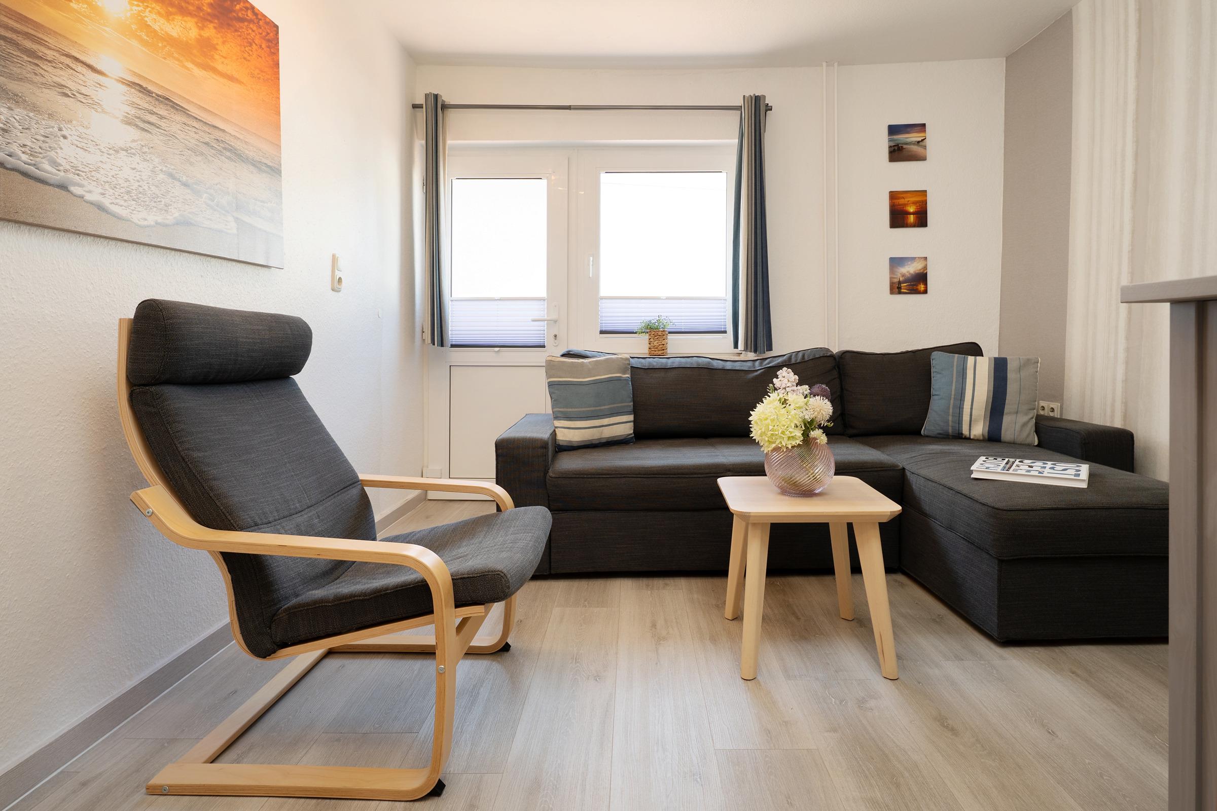 Die freundlich eingerichtete Ferienwohnung bietet einen kombinierten Wohn-/Schlafbereich mit einem Schlafsofa und einem Fernseher – ideal für entspannte Abende. Der offene Küchenbereich ist u. a. mit Kaffeemaschine, Herd, Mikrowelle und Kühlschrank mit Gefrierfach gut ausgestattet. Im separaten Schlafzimmer finden Sie ein gemütliches Doppelbett (2x 90x200 cm), das Platz für zwei Personen bietet. Das Badezimmer verfügt über Dusche, WC sowie einen Föhn. Der Gemeinschaftsgarten erwartet Sie mit Sonnenliegen und Strandkorb zur gemeinschaftlichen Nutzung.