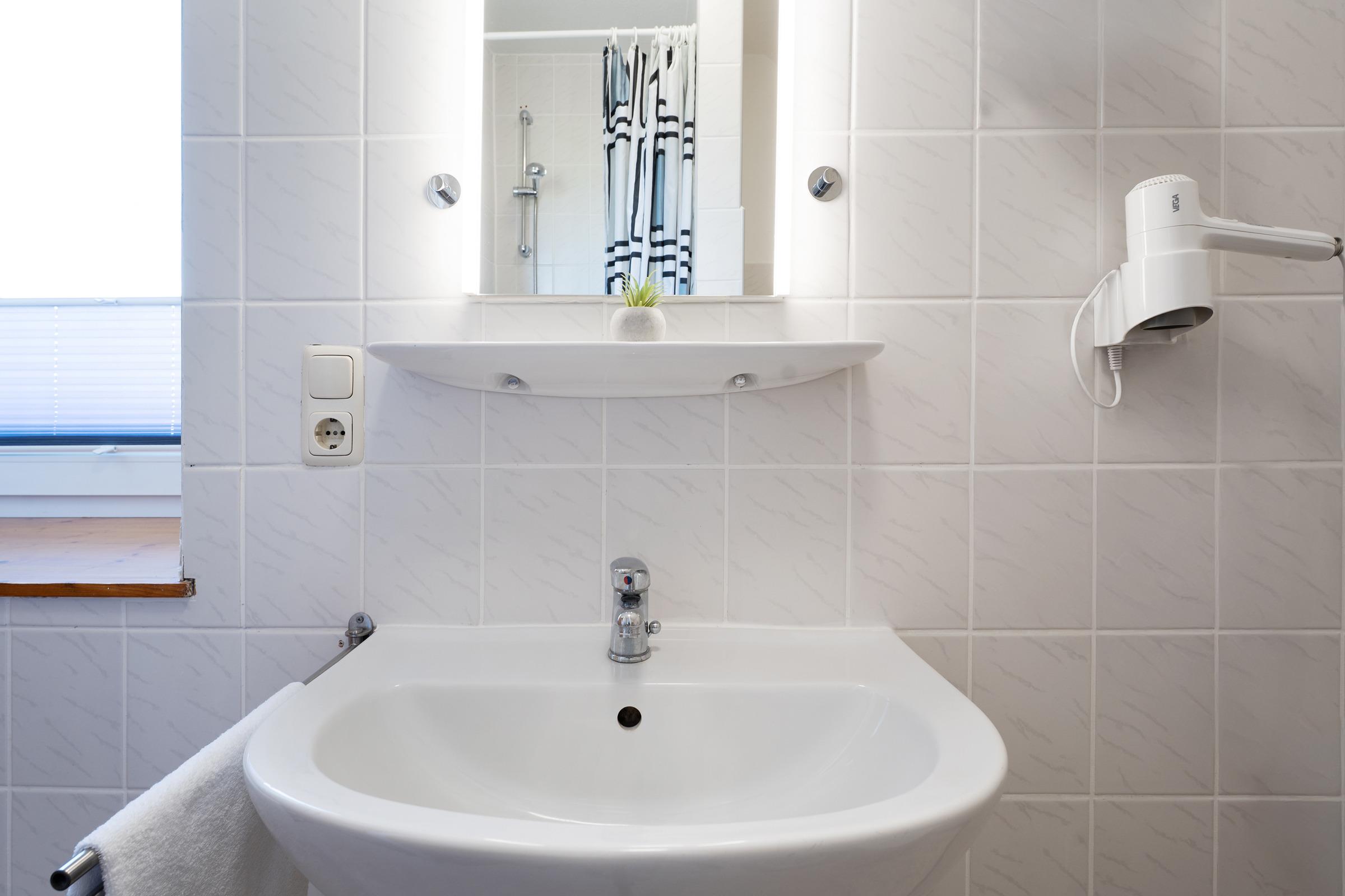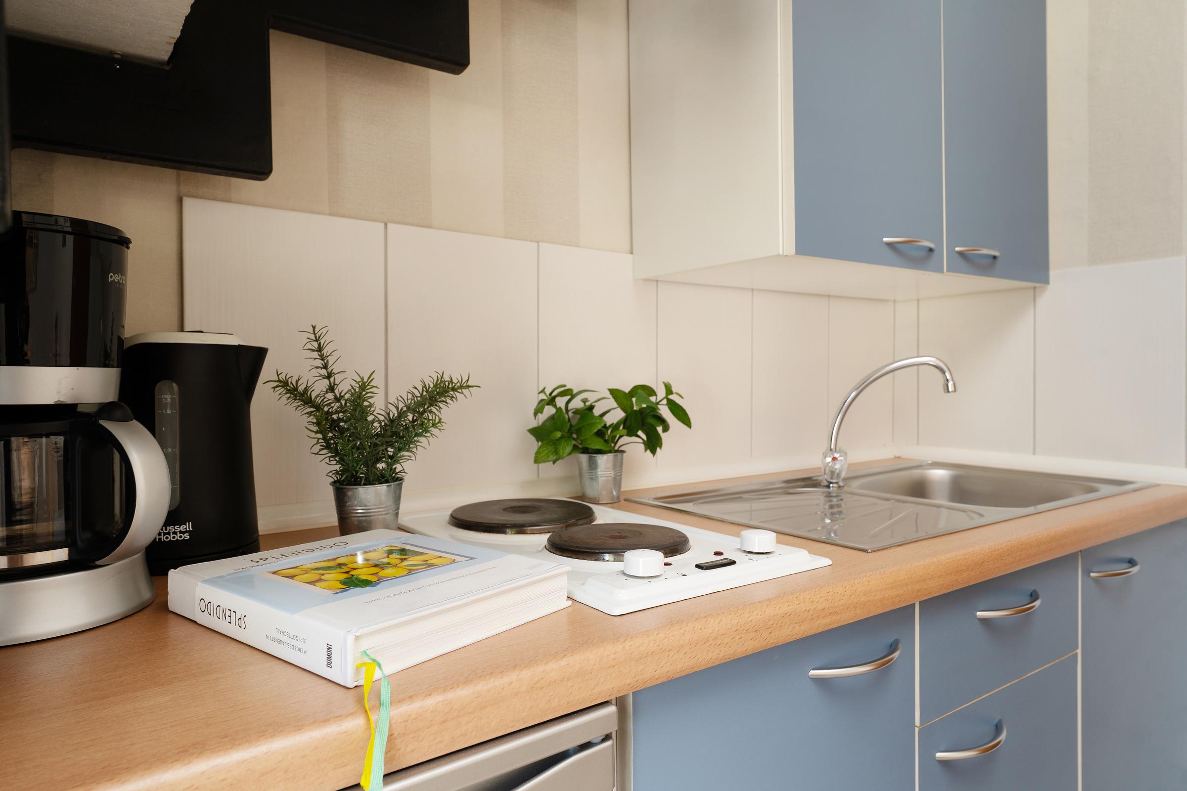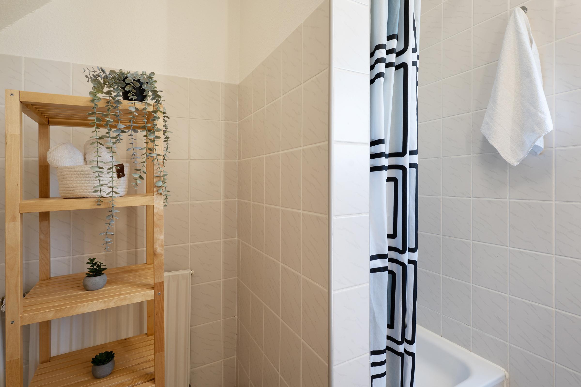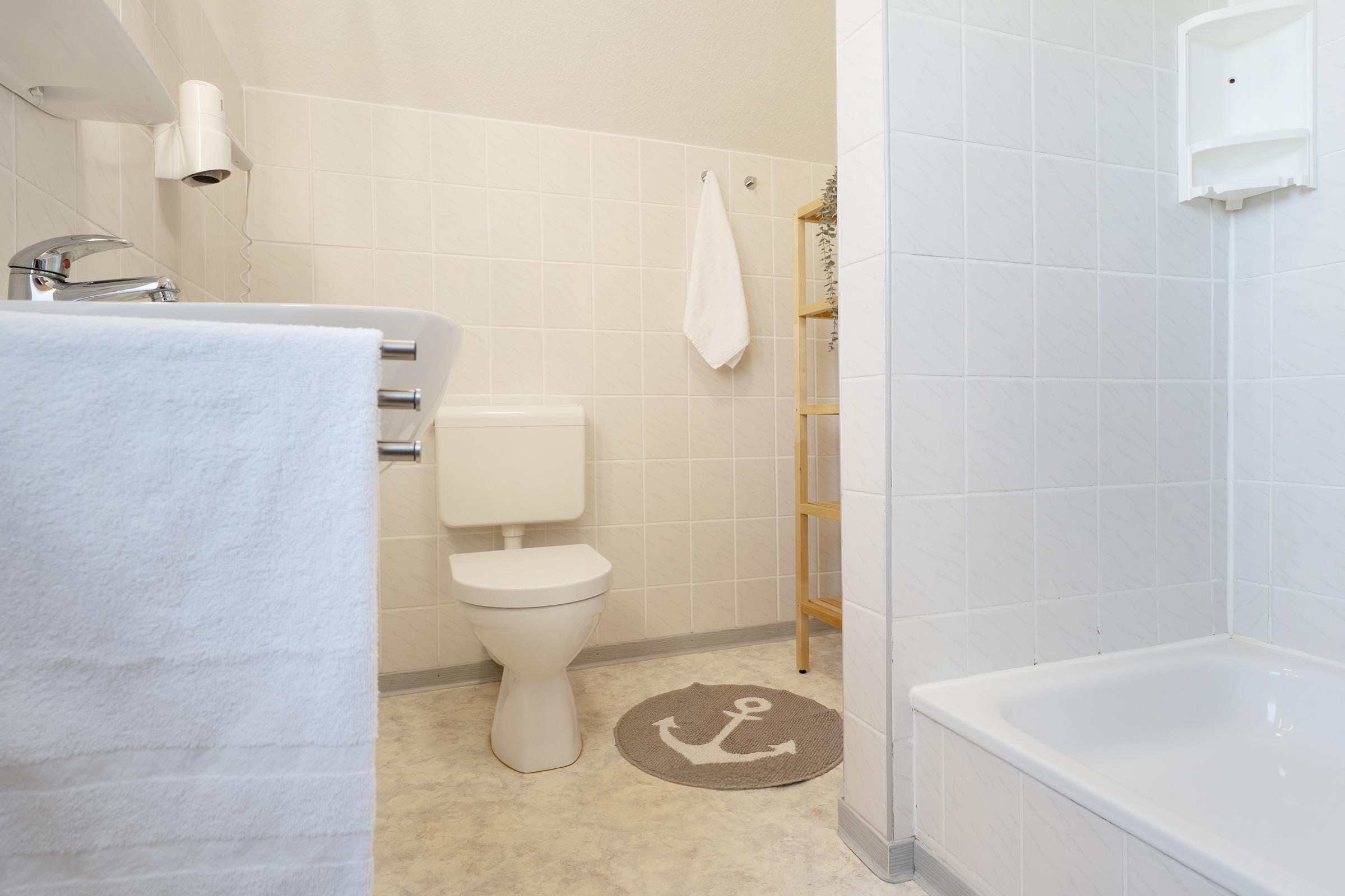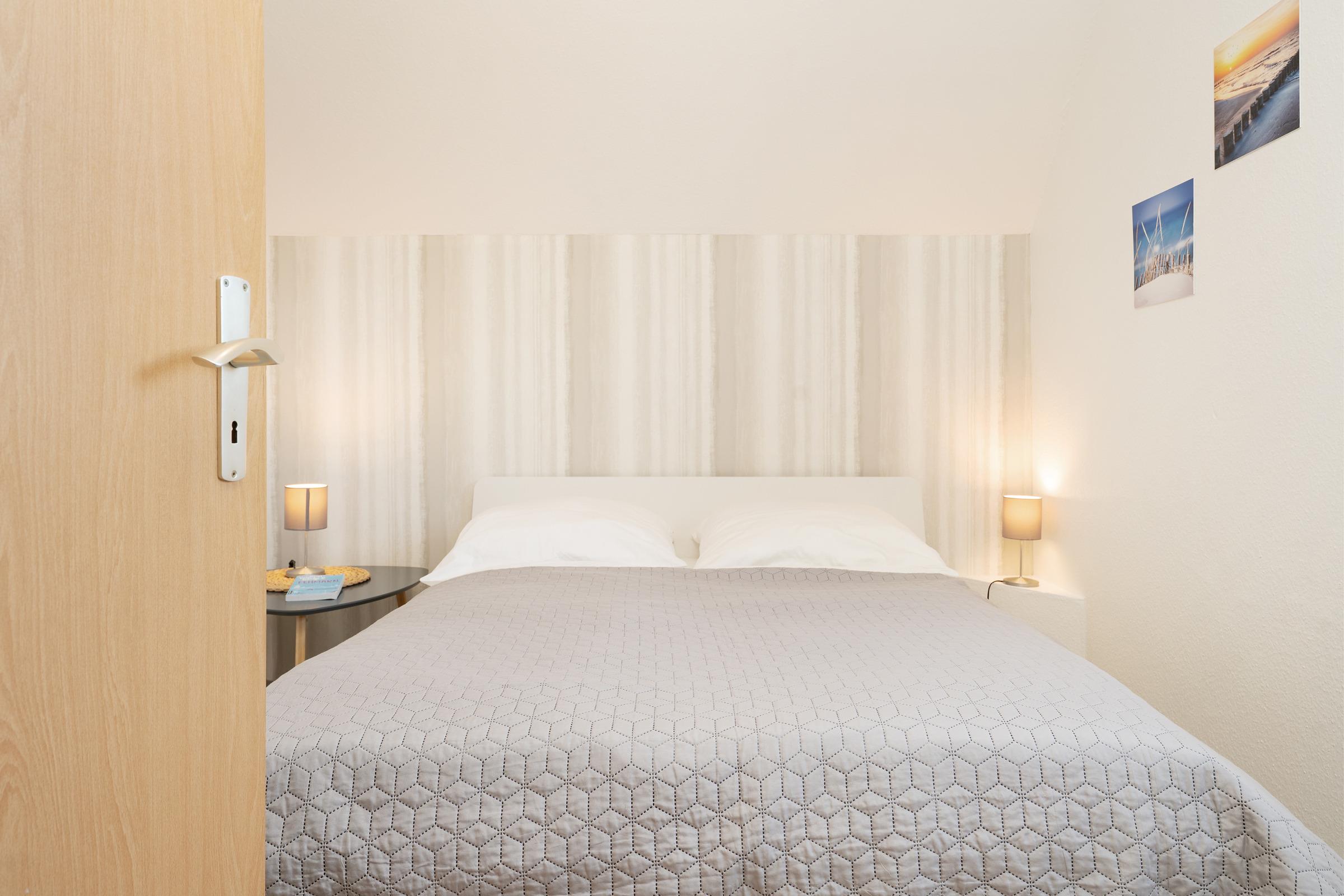 Die freundlich eingerichtete Ferienwohnung bietet einen kombinierten Wohn-/Schlafbereich mit einem Schlafsofa und einem Fernseher – ideal für entspannte Abende. Der offene Küchenbereich ist u. a. mit Kaffeemaschine, Herd, Mikrowelle und Kühlschrank mit Gefrierfach gut ausgestattet. Im separaten Schlafzimmer finden Sie ein gemütliches Doppelbett (2x 90x200 cm), das Platz für zwei Personen bietet. Das Badezimmer verfügt über Dusche, WC sowie einen Föhn. Der Gemeinschaftsgarten erwartet Sie mit Sonnenliegen und Strandkorb zur gemeinschaftlichen Nutzung.