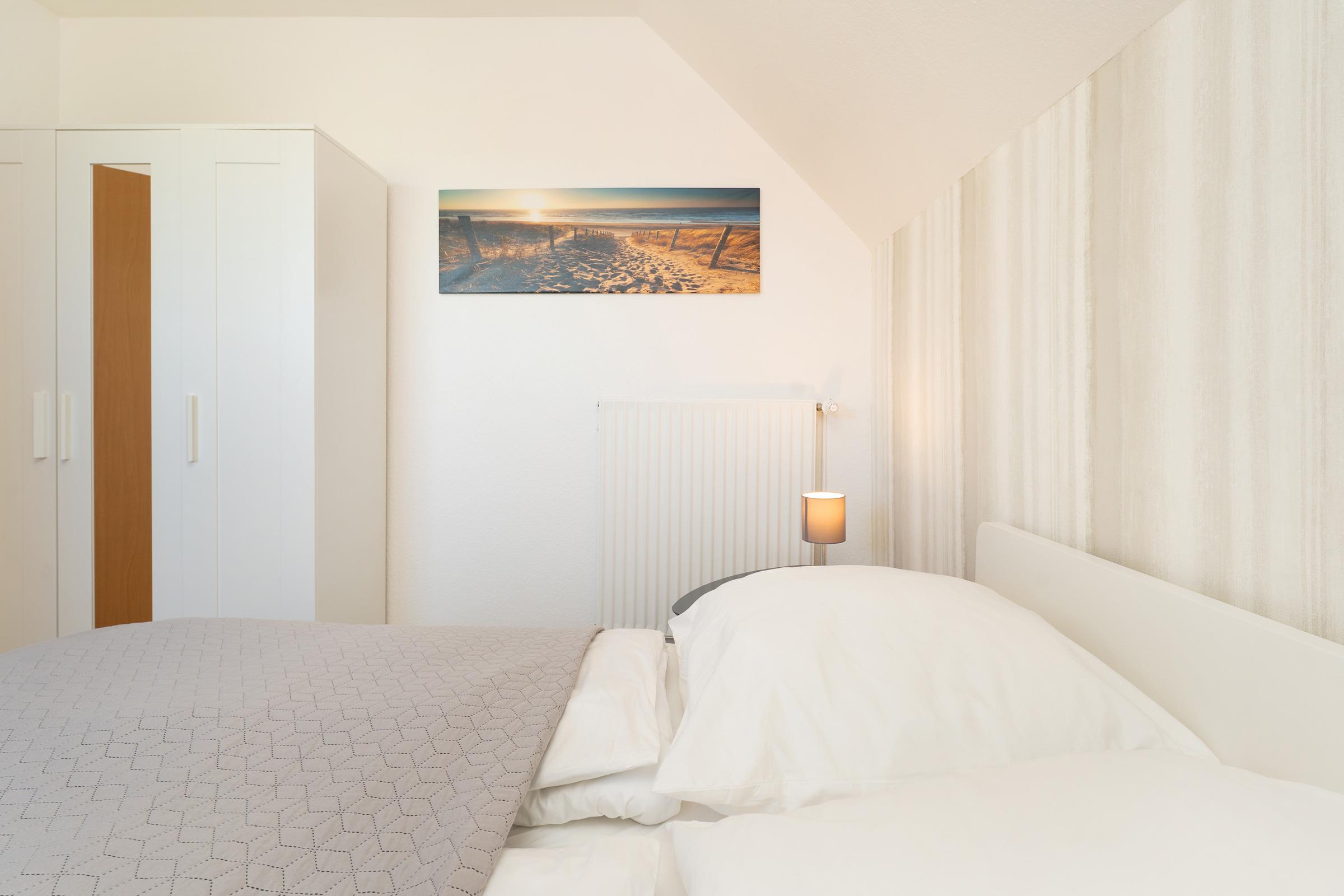 Schlafzimmer (1. OG): 1 Doppelbett (2x 90x200 cm), Kleiderschrank, Verdunkelung: Plissees und Vorhänge, kein Platz für ein Babybett