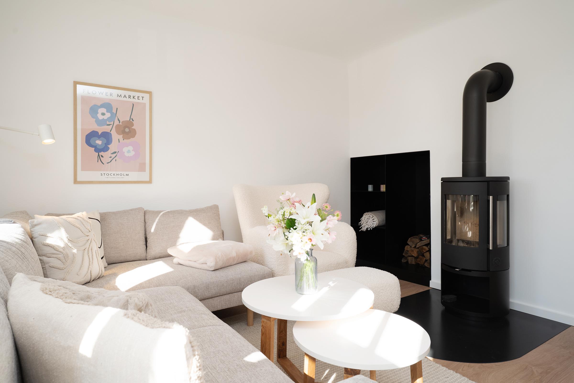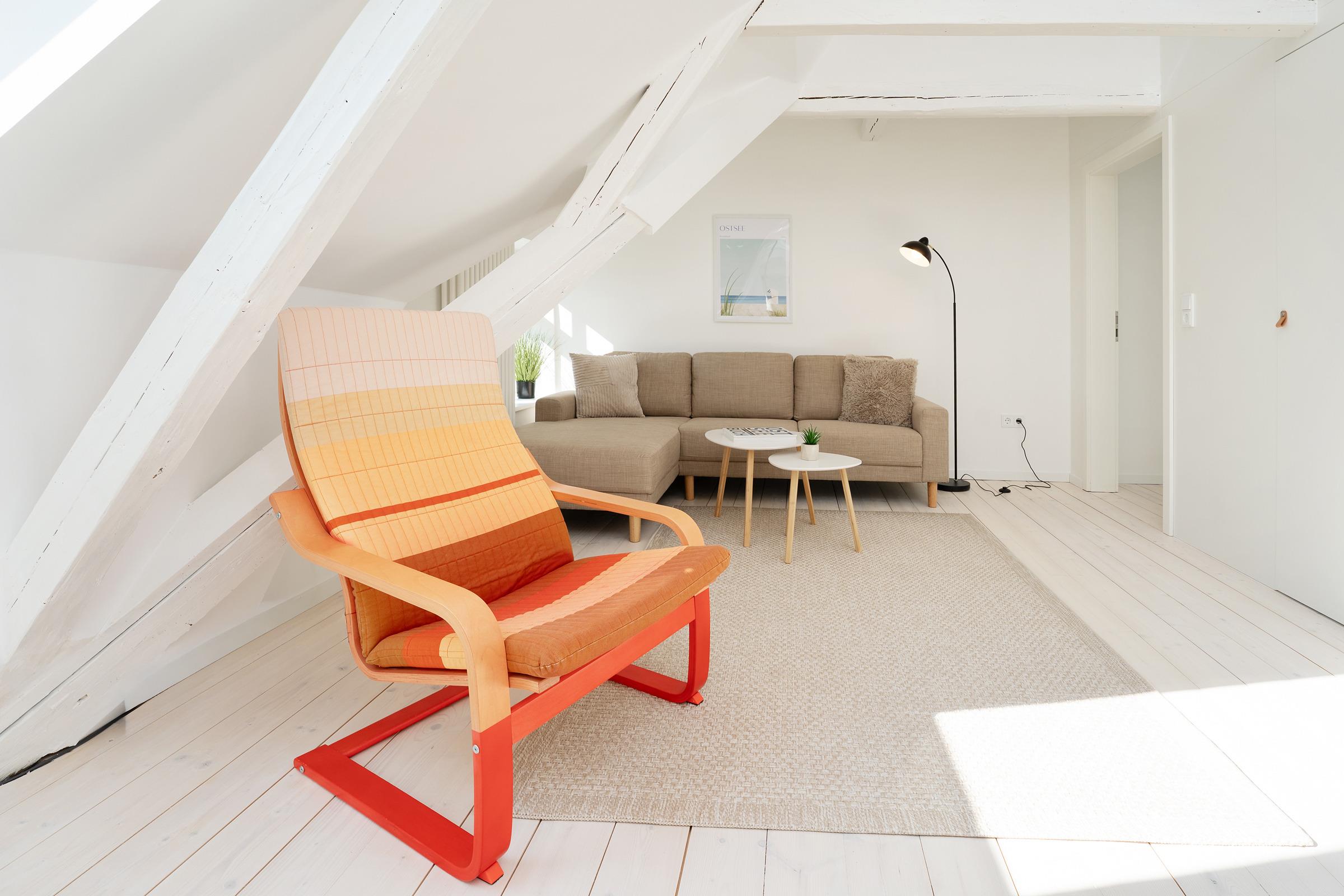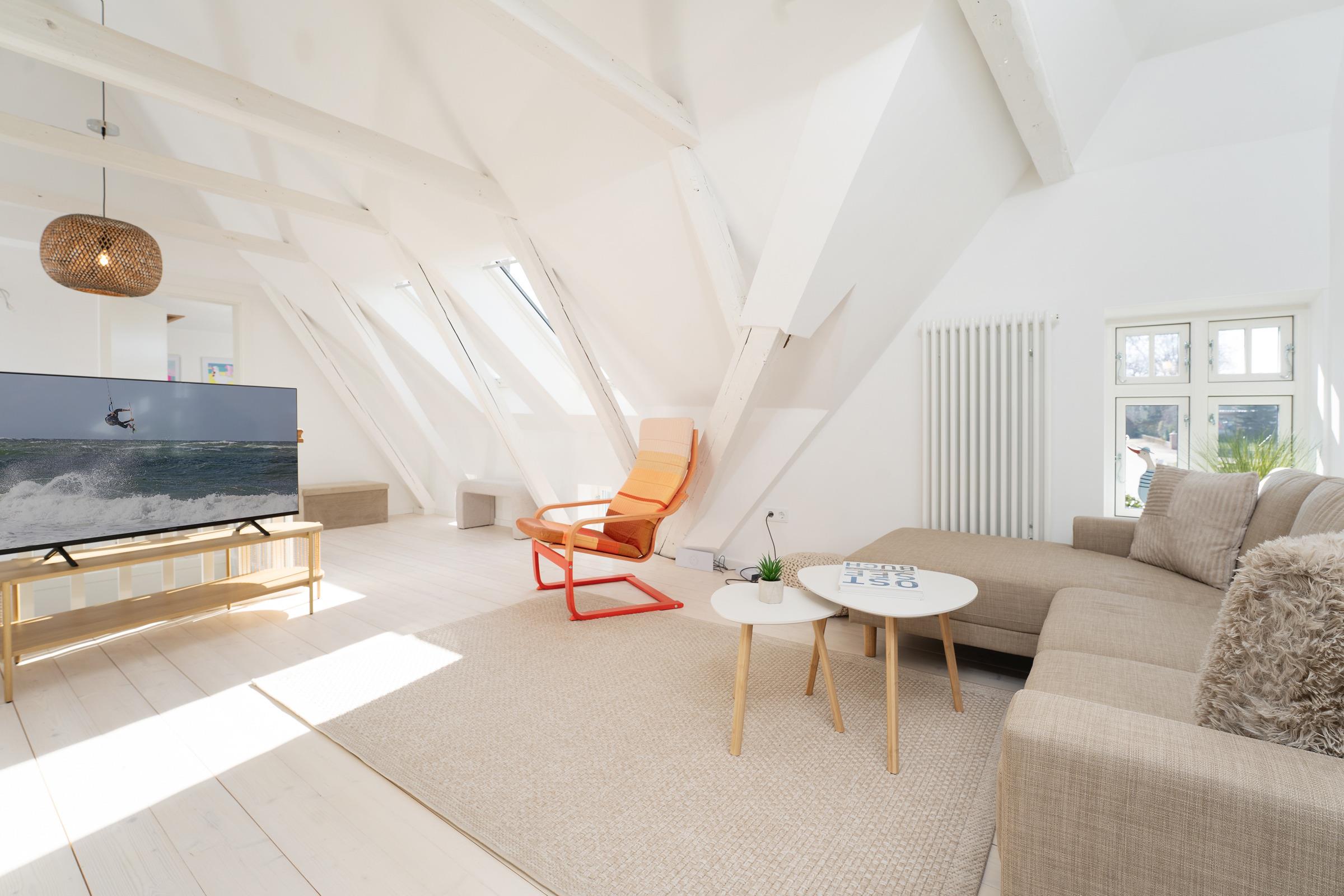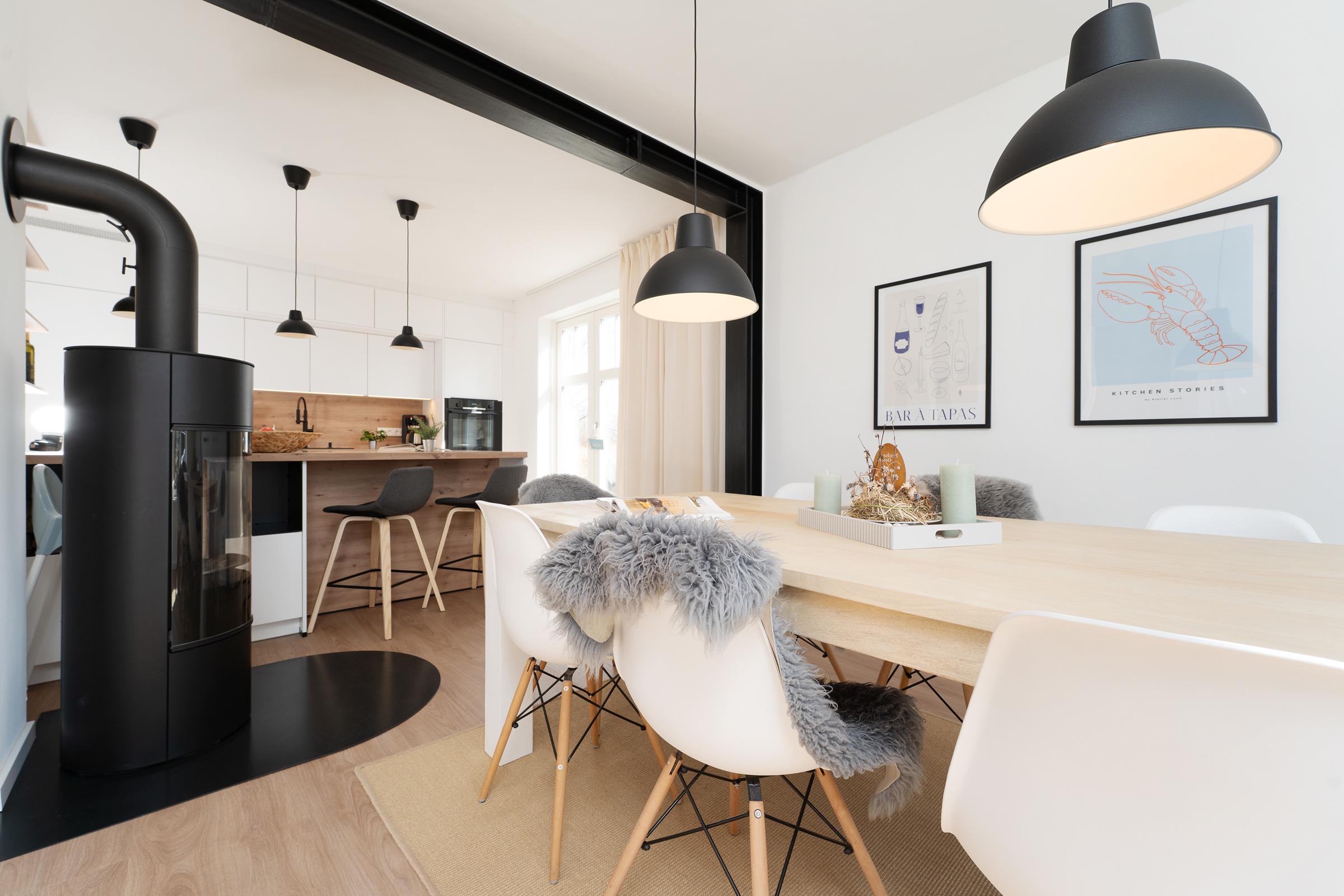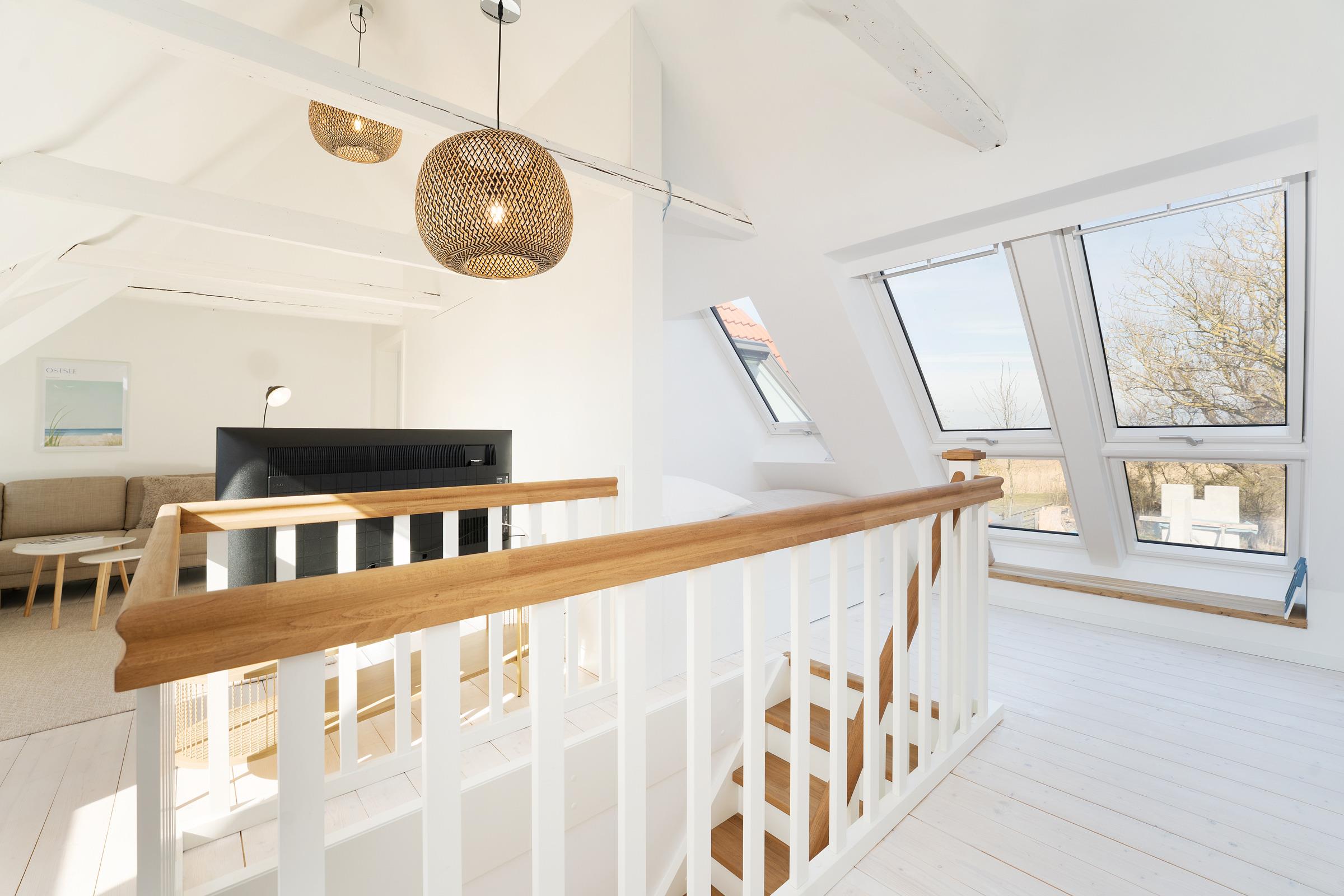 Das Ferienhaus empfängt Sie mit einem hellen und großzügigen Wohnbereich, der mit gemütlichen Sitzmöbeln und einem Fernseher zu entspannten Stunden einlädt. Von hier aus gelangen Sie direkt in den eigenen Garten mit herrlichem Blick auf Felder und einen idyllischen Teich – ideal für ruhige Stunden in naturnaher Umgebung. Die offene Küche ist komfortabel ausgestattet und bietet gemeinsam mit dem Essbereich beste Voraussetzungen für gesellige Mahlzeiten. Die Schlafräume verteilen sich auf mehrere Ebenen - zusätzlich steht im Spitzboden ein gemütlicher Schlafbereich für zwei Kinder zur Verfügung. Bitte beachten Sie, dass dieser Bereich eine geringe Deckenhöhe aufweist und nicht für stehende Erwachsene geeignet ist. Im Obergeschoss befindet sich in der Diele ein weiterer Fernseher, sodass insgesamt zwei TV-Geräte (Wohnzimmer und Diele im OG) zur Verfügung stehen. Das Badezimmer ist modern ausgestattet und verfügt über Dusche und WC. Für Familien ist ein Kinderhochstuhl vorhanden.