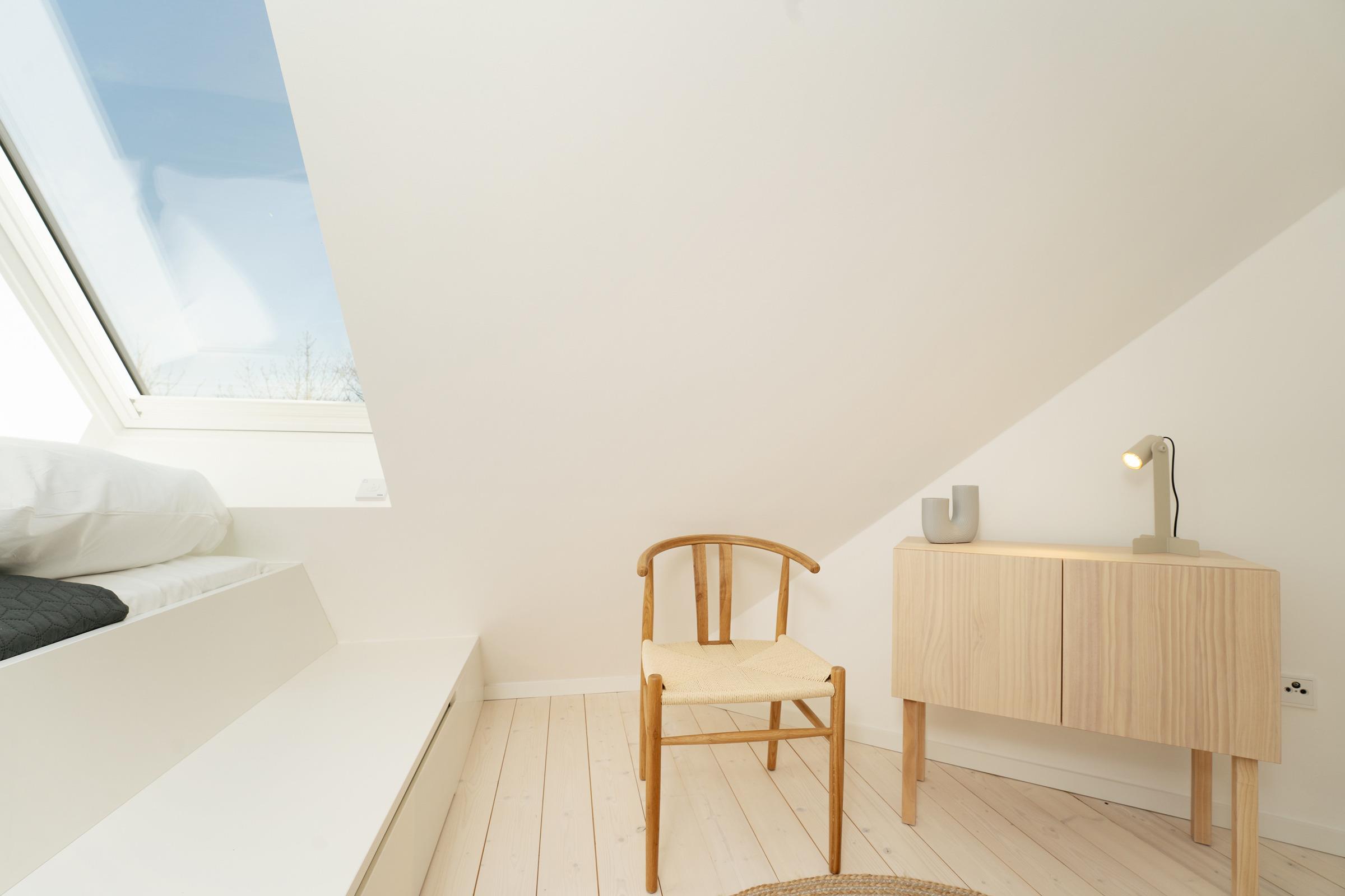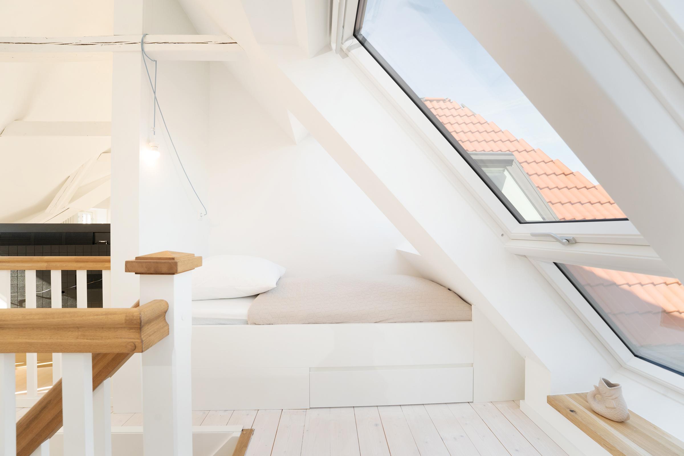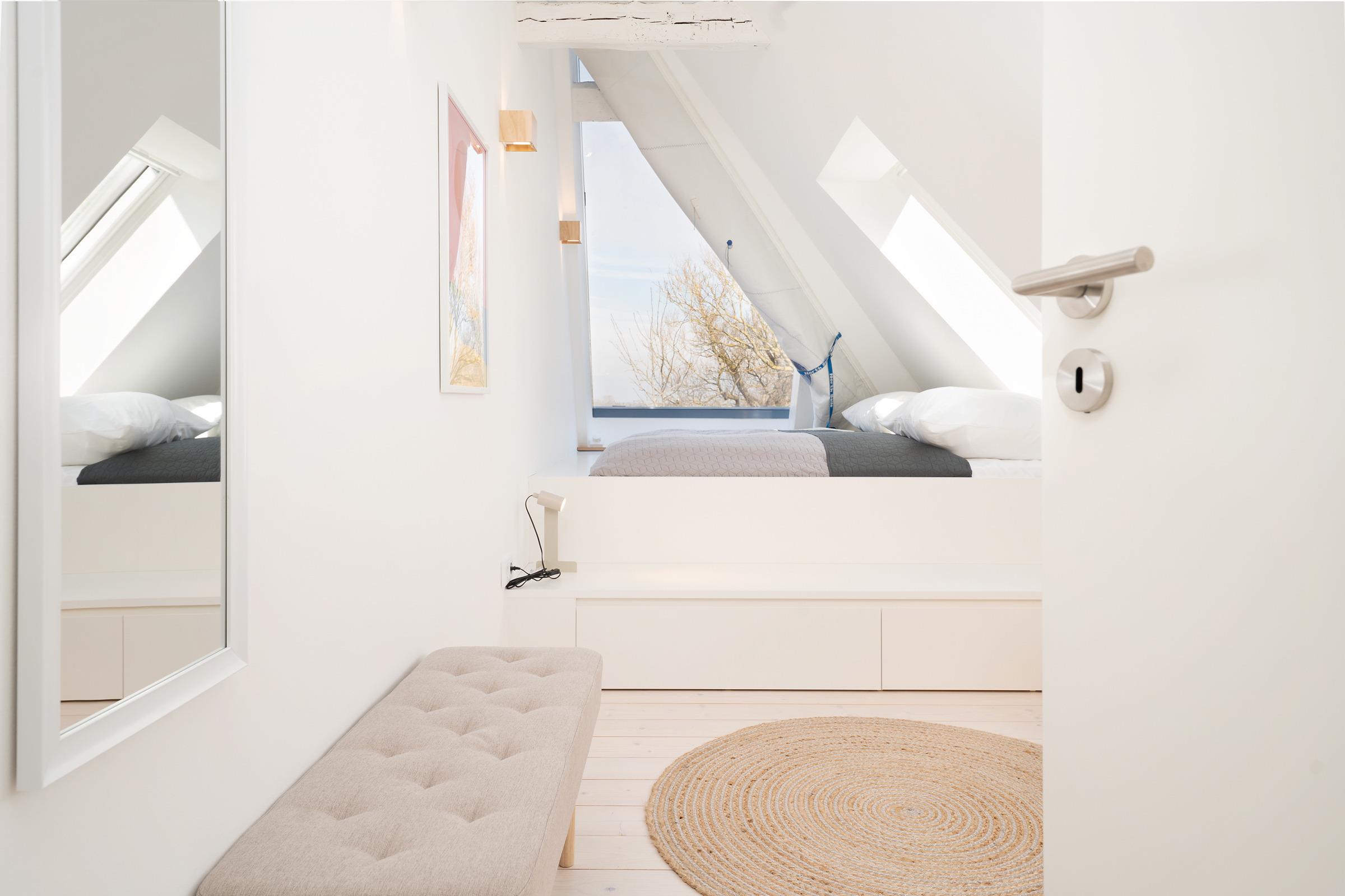 Schlafzimmer 1 (OG): 1 Doppelbett (2x 90 x 200 cm), Ankleide, Verdunkelung: Velux Rolladen/ Verdunkelungsrollos, Platz für ein Babybett vorhanden