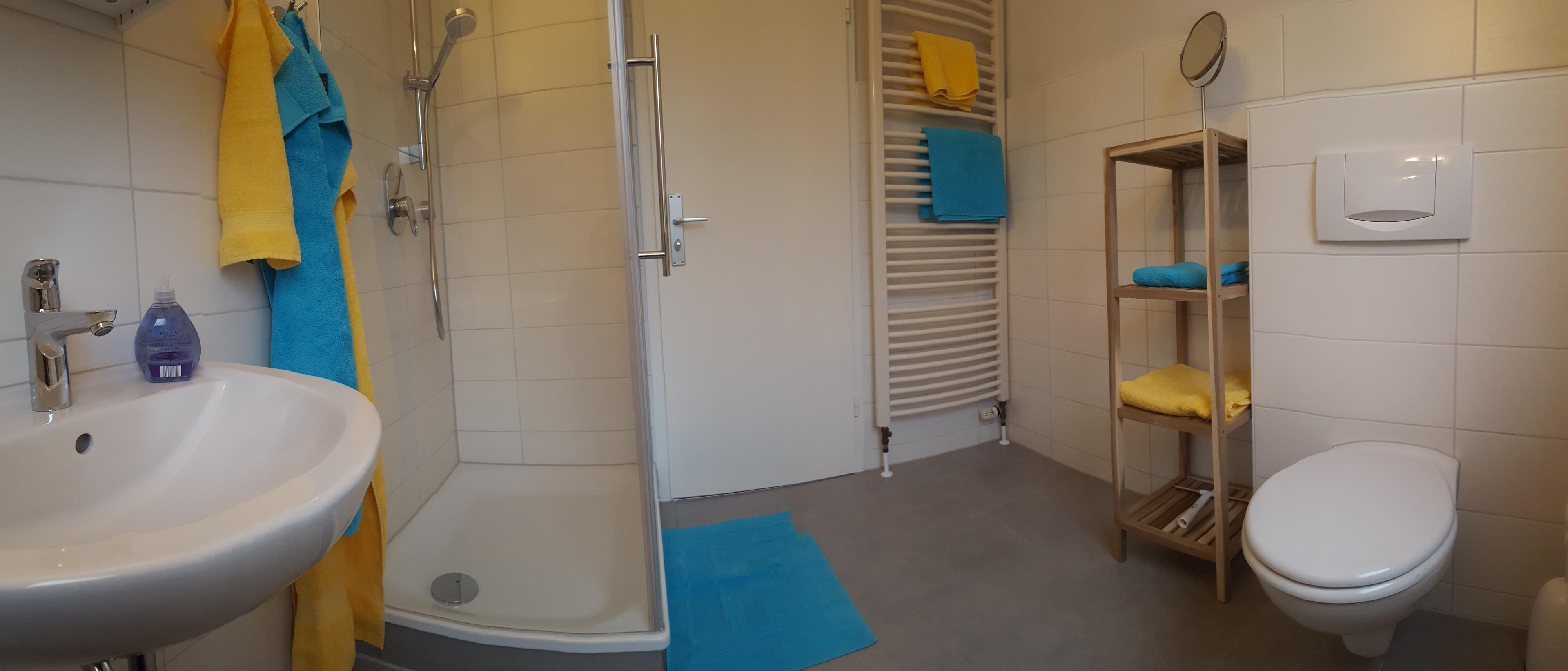 Im kleinen, aber feinen, Duschbad gibt es eine Handtuchheizung, ein Regal zur Ablage und einen Föhn.
