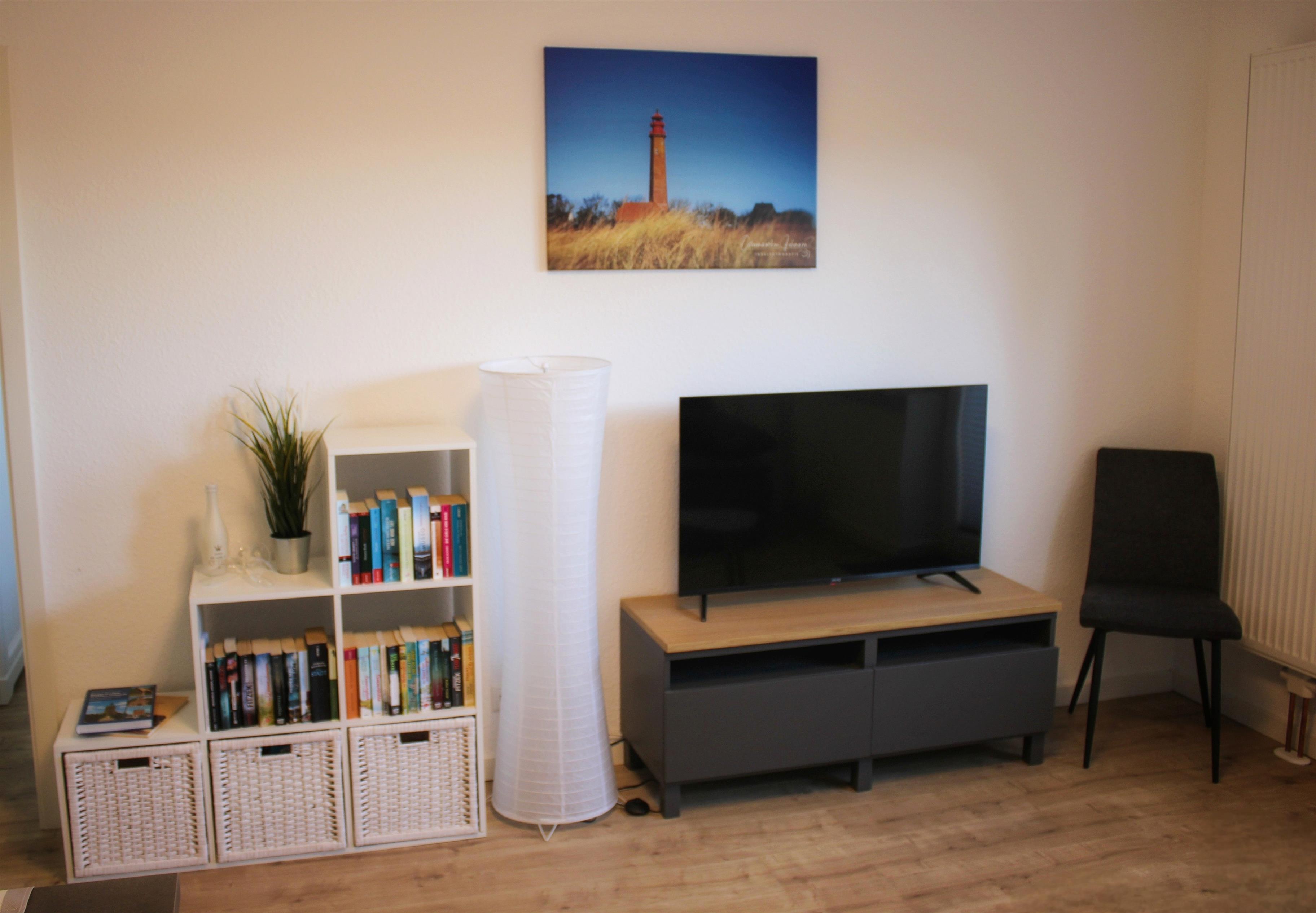 Das Wohnzimmer bietet ein bequemes Sofa, welches bei Bedarf als Schlafsofa umfunktioniert werden kann. Es bietet Platz für bis zu zwei weiteren Personen. Auch im Wohnzimmer steht ein Fernseher zur Verfügung. Der Essbereich mit einem großzügigen Esstisch und einer gemütlichen Eckbank lädt zu gemeinsamen Mahlzeiten ein. Viele Bücher, ein paar Spiele und Puzzles stehen bereit um gemütliche Stunden zu verbringen.