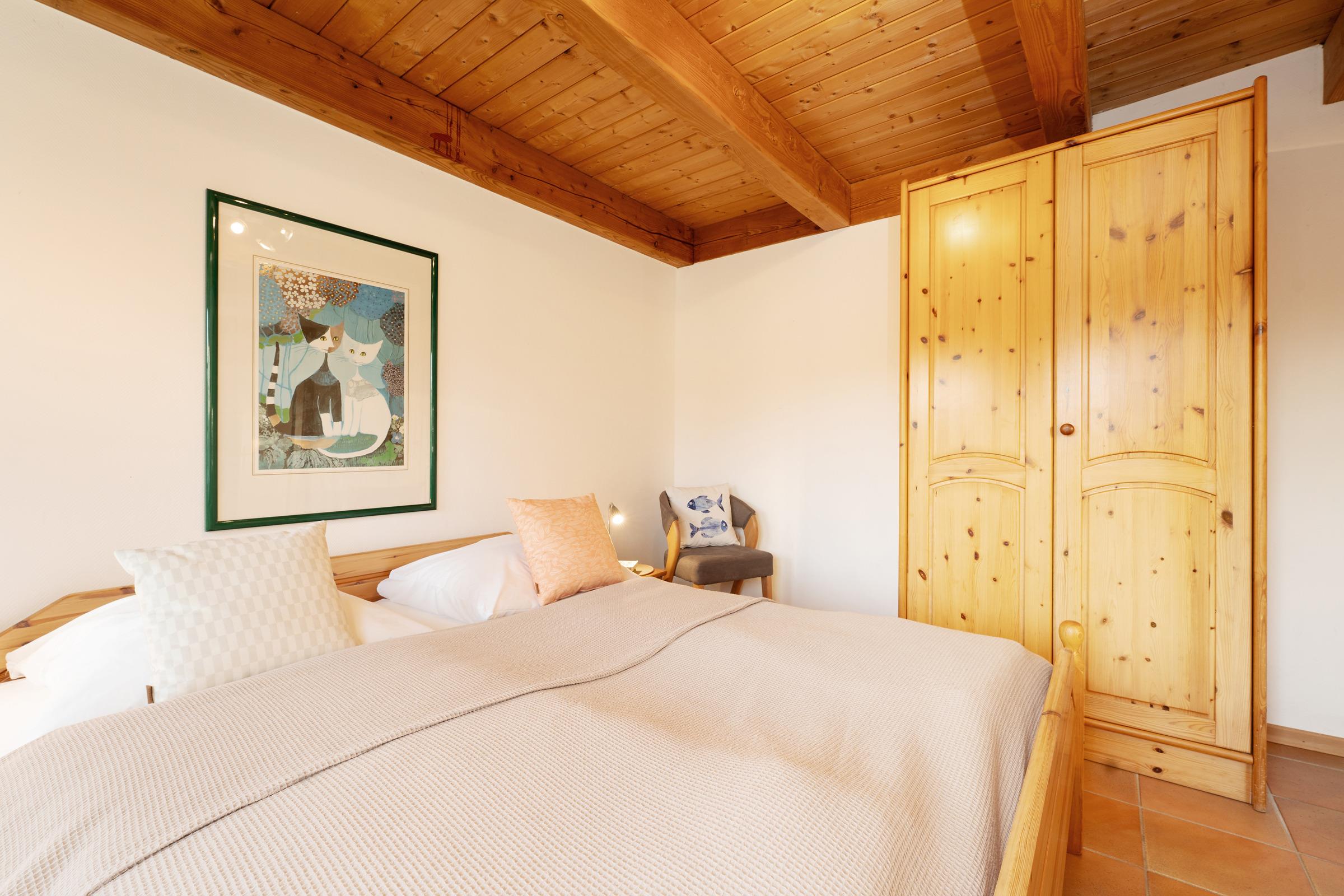 Schlafzimmer 1 (EG): 1 Doppelbett (2x 90x200 cm), Kleiderschrank, Verdunkelung: Verdunkelungsvorhänge, kein Platz für ein Babybett vorhanden