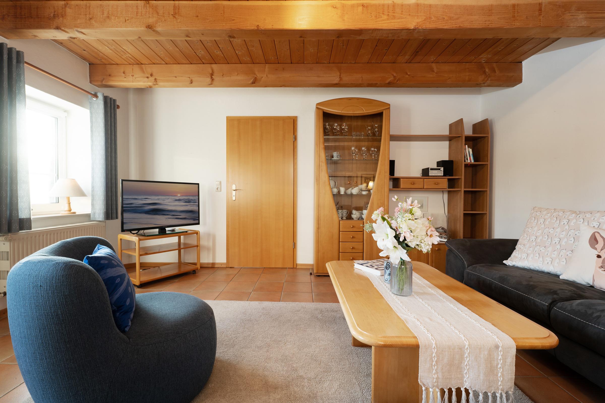 Die lichtdurchflutete Doppelhaushälfte empfängt Sie mit einem großzügigen Wohnbereich, der durch eine gemütliche Sitzecke, TV und viel Platz zum Entspannen überzeugt. Von hier aus gelangen Sie direkt in den liebevoll angelegten Garten, der mit Gartenmöbeln und Grillmöglichkeit ausgestattet ist – ideal für ruhige Stunden an der frischen Inselluft. Die offene Küche bietet alles, was Sie für die Urlaubsküche benötigen.