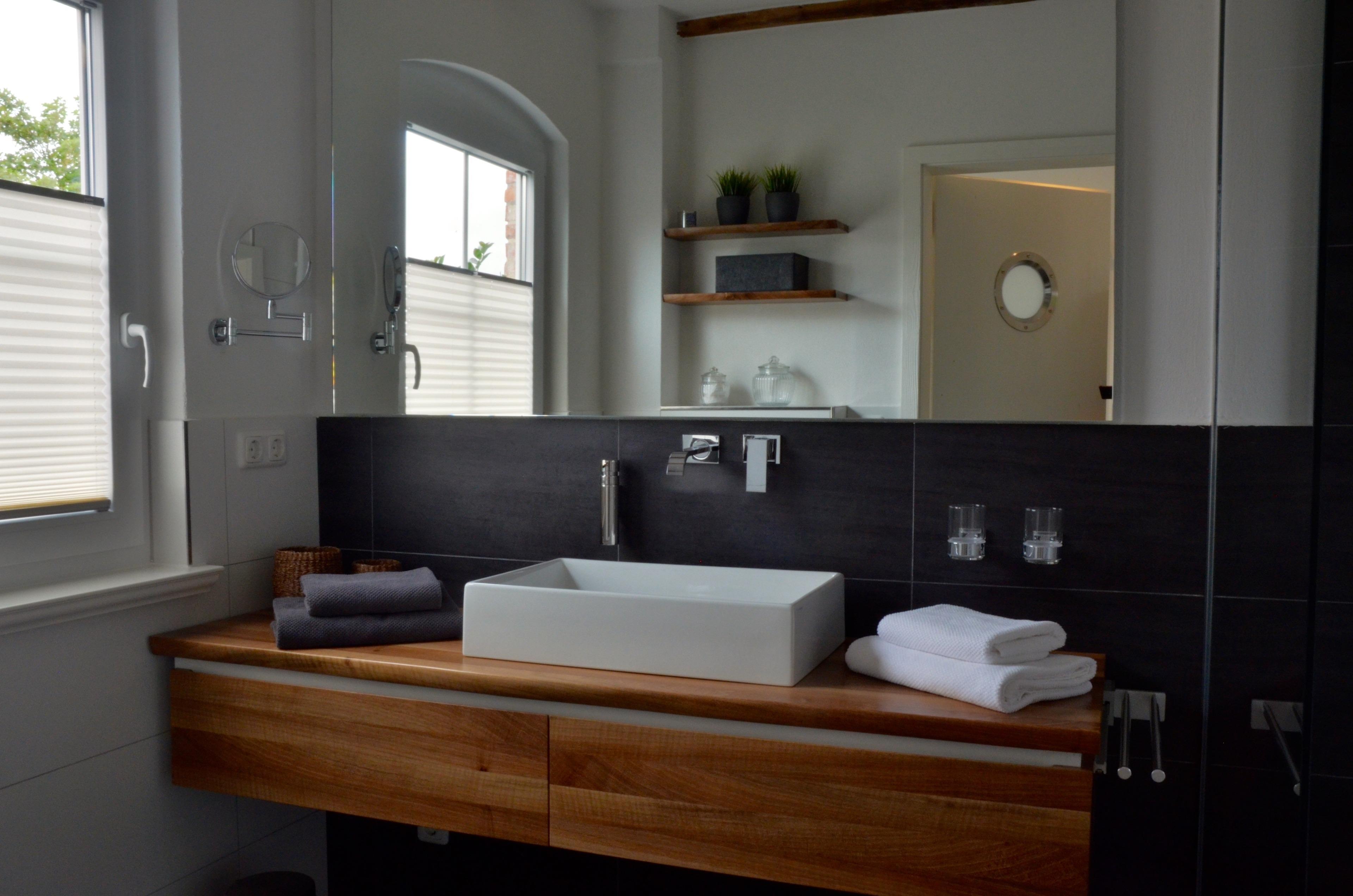 Im Bad erwartet Sie der Luxus einer großzügigen, bodenebenen Dusche mit Regenbrause, der Waschtisch ist aus maßivem Nussbaum. Moderne, hochwertige Armaturen runden den Eindruck ab. Natürlich gehören Fön und Schminkspiegel ebenfalls dazu.