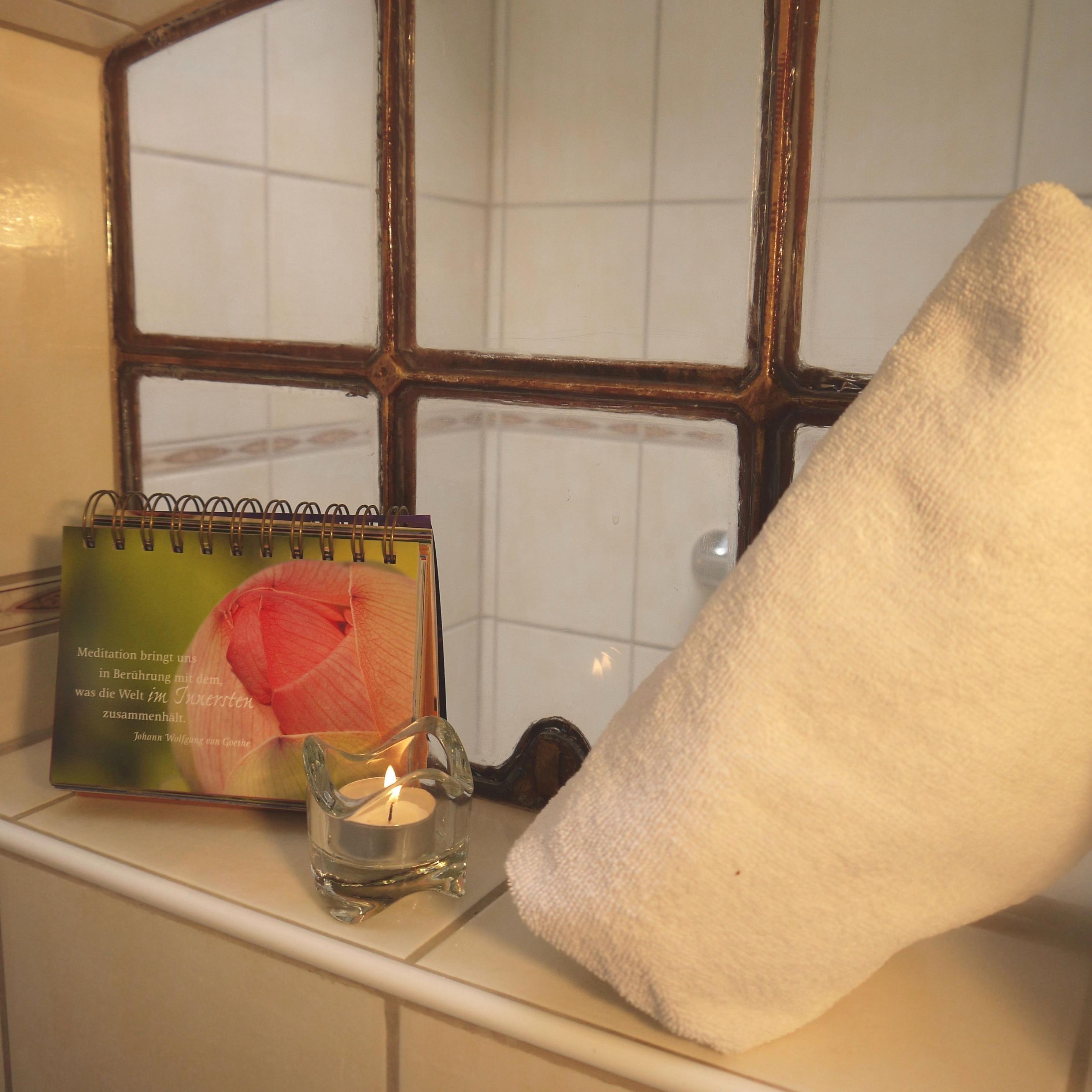 Kleines komfortables Duschbad mit Sitzbank in der Dusche. Handtuchwärmer für die von uns gestellten Handtücher und ein Fön stellen wir gern zu Verfügung.