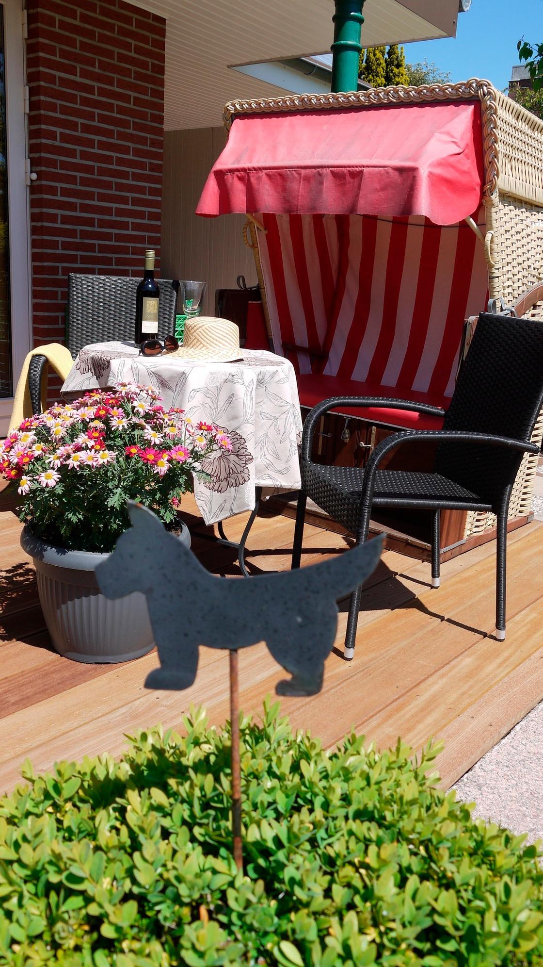 Von der Wohnküche gelangt man auf die gemütliche Süd-Terrasse. Ob Frühstück oder nach einem anstrengendem Strandtag der richtige Rahmen für einen Sun-Downer im eigenem Strandkorb.