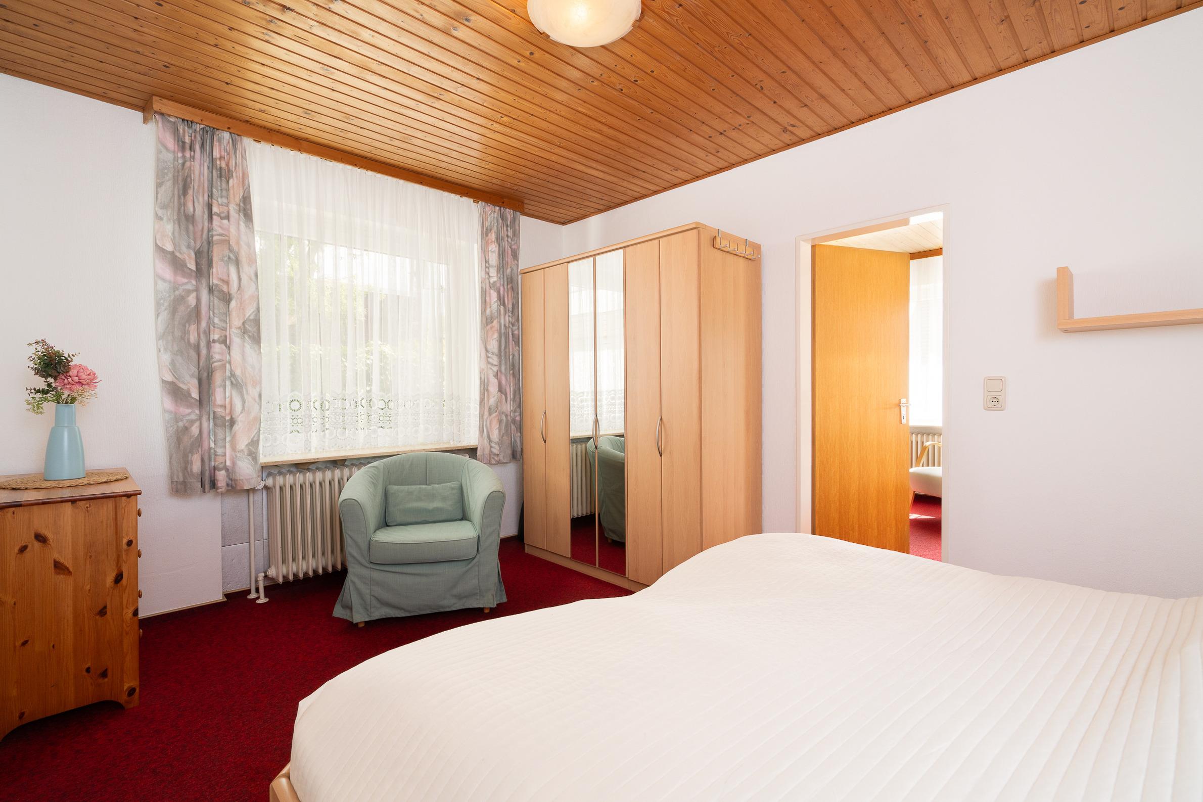 Schlafzimmer: 1 Doppelbett, Verdunkelung: Gardinen, Kleiderschrank, Platz für ein Babybett vorhanden