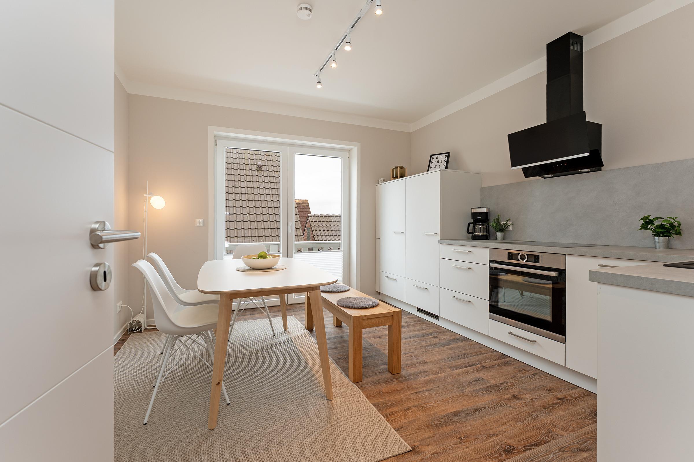 Modern eingerichtete 4-Zimmer-Ferienwohnung im 2. Stock mit Balkon in Burg auf der Sonneninsel Fehmarn bietet auf 78 m² genug Platz für bis zu 5 Gäste.