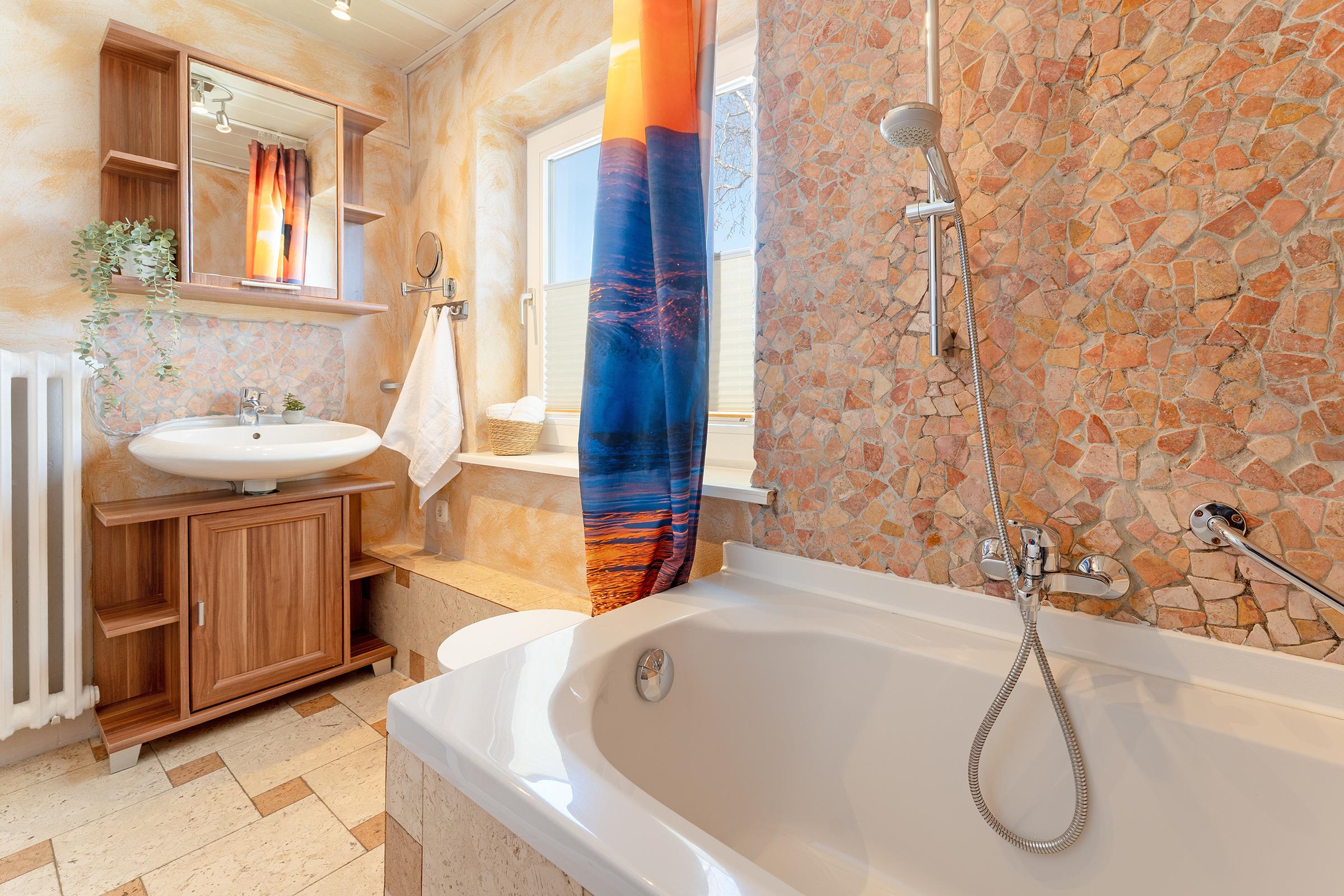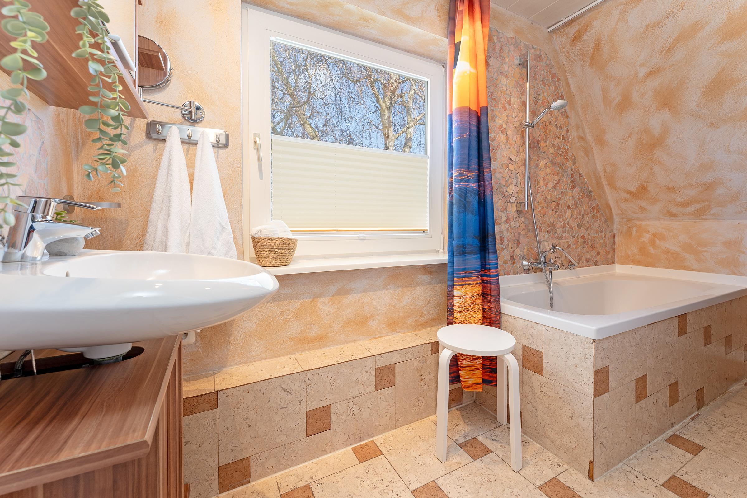Herzlich willkommen! Das gemütlich eingerichtete Wohnzimmer mit Schlafsofa und TV-Gerät lädt zum Verweilen ein. Die Wohnküche ist mit vielen Annehmlichkeiten, die Sie für die Selbstversorgung brauchen, ausgestattet. Auch steht hier eine rustikalen Sitzgruppe für gesellige Stunden. Wunderbar träumen werden Sie in dem Schlafzimmer mit großem Doppelbett sowie in dem Schlafzimmer mit zwei Einzelbetten. Hier ist genügend Platz für Ihre Urlaubsgarderobe vorhanden. Im Badezimmer finden Sie eine Badewanne mit Dusche und Waschbecken zu Ihrer Erfrischung. Die Toilette befindet sich direkt nebenan in einem separaten Raum, natürlich auch mit Waschbecken und Spiegel. Den großzügigen Garten mit Terrasse und Grillplatz teilen Sie sich mit den Gästen aus dem Erdgeschoss: Der Grill wartet nur darauf von Ihnen benutzt zu werden. Sitzgelegenheiten sind reichlich vorhanden.