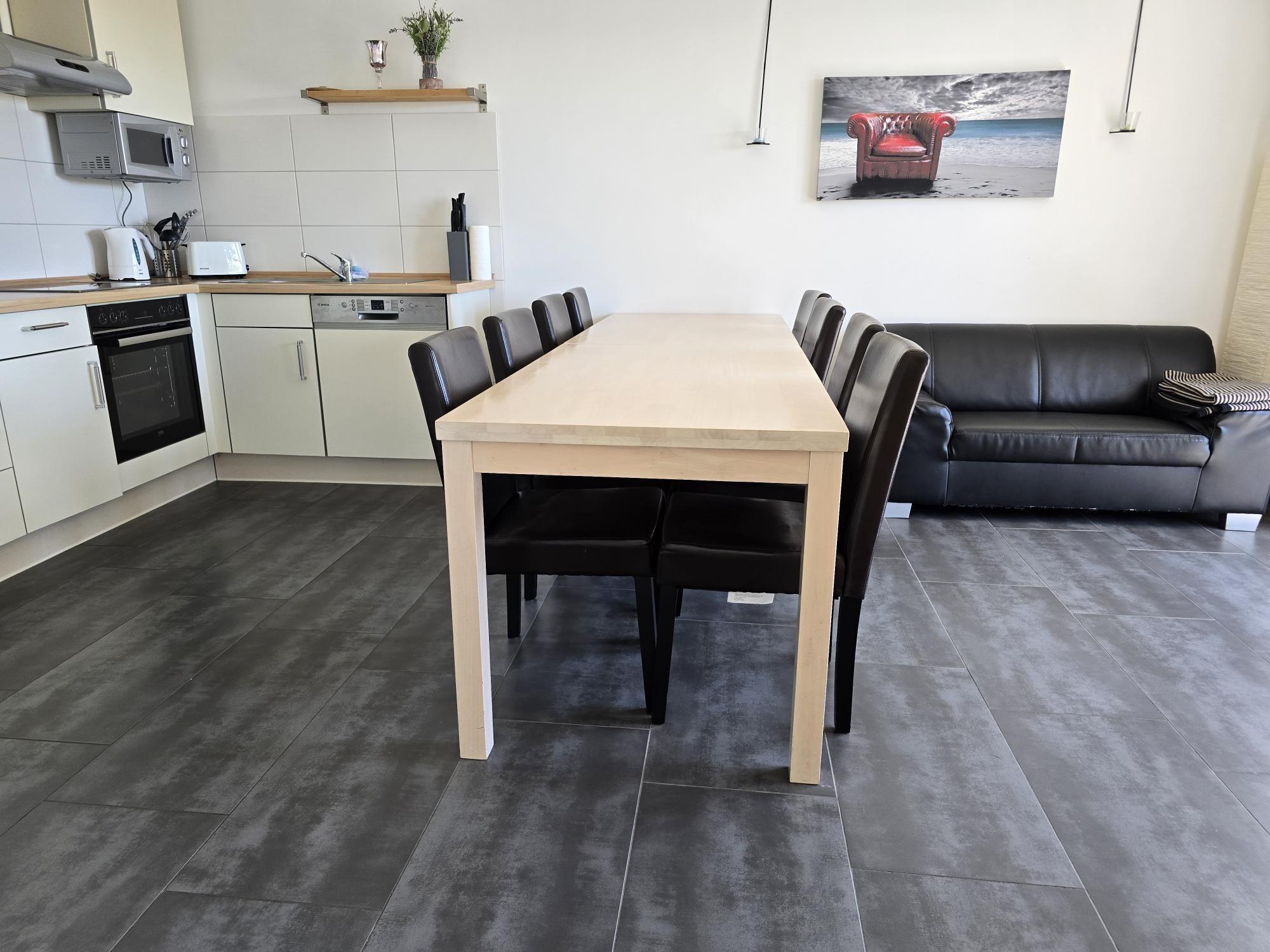 Gemütliche Wohnküche mit Esstisch und einer kleinen Couch